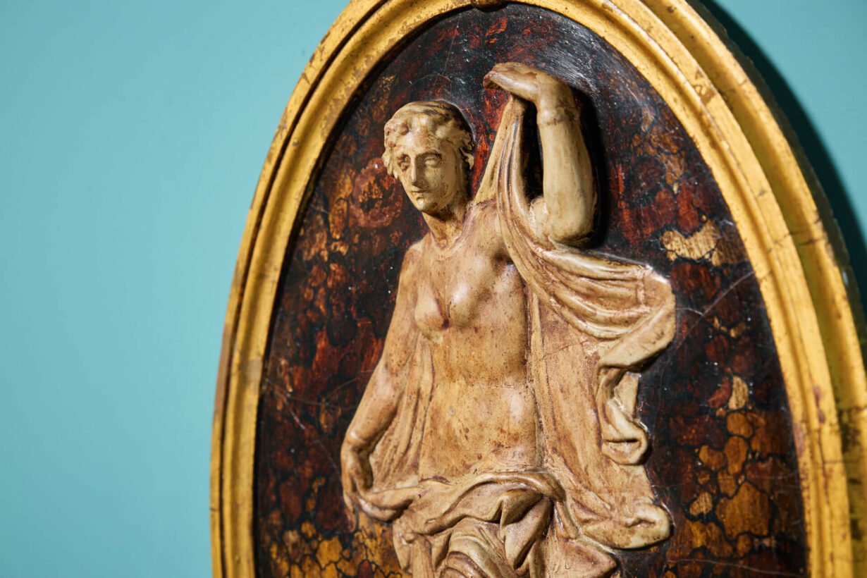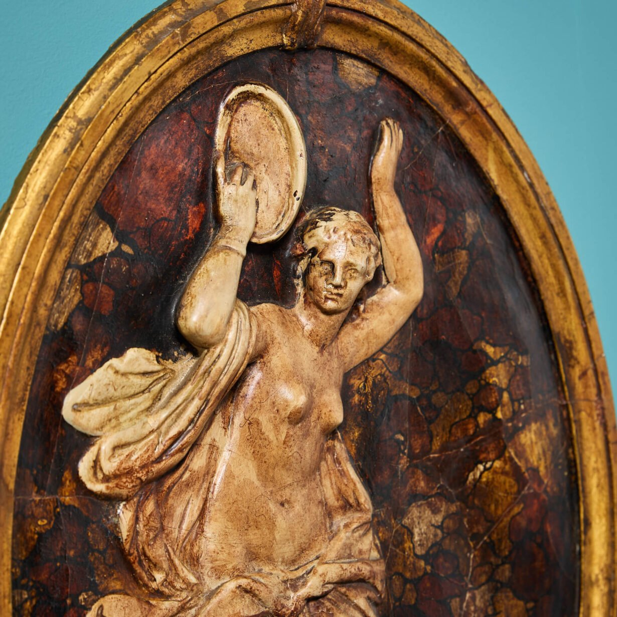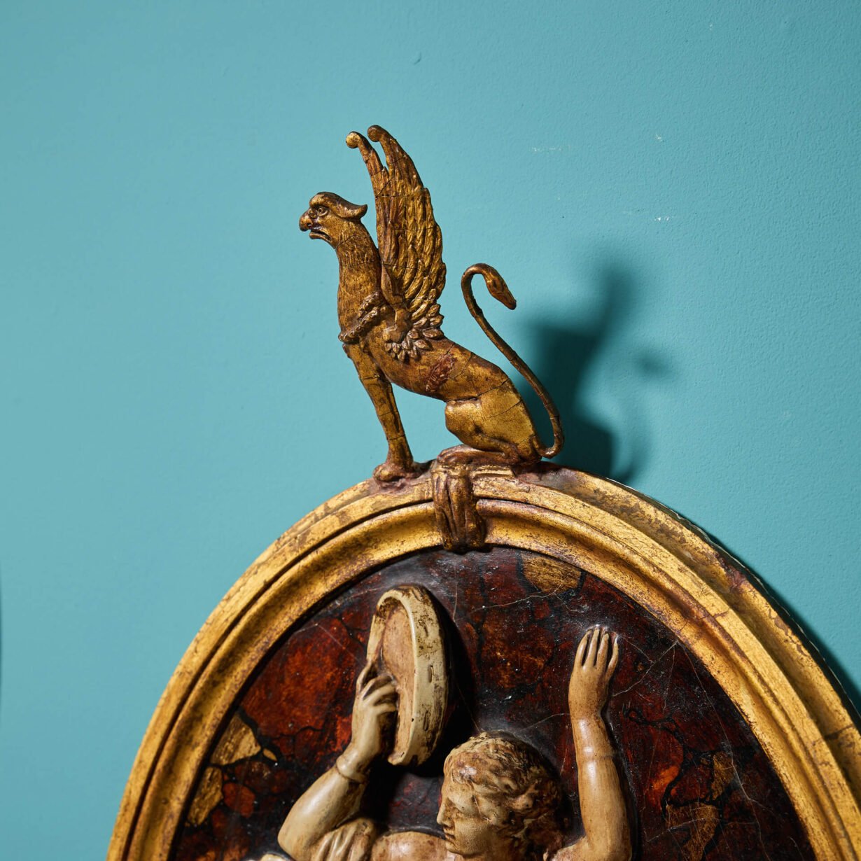 Highly decorative, these reclaimed plaster plaques each display a neoclassical figure – one holding swathes of drapery, the other with a tambourine raised above her head – before a simulated marble backdrop within a gilt frame with below a griffin.