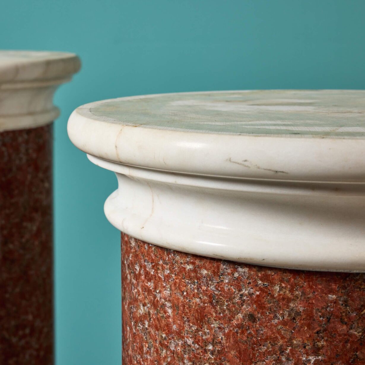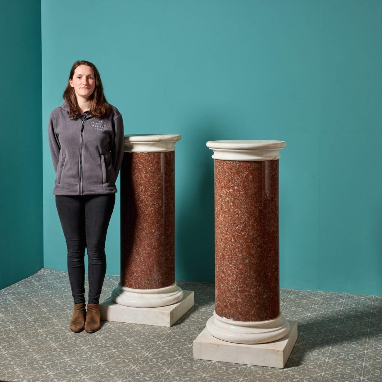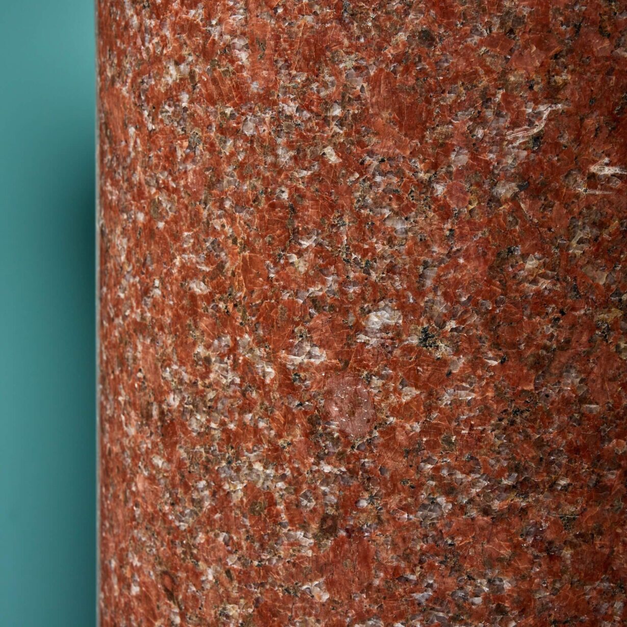 back to topA pair of Neoclassical red granite column pedestals. The 19th century columns’ generous size and stature would be fitting inside a grand home or in a garden, perhaps used to show off large scale statues. This impressive pair have a base and socle made from Carrara marble, which is a soft grey colour accompanied by soft veining, hailing from Carrara, Italy. Its look crosses between a Victorian and Georgian regency high-end style. The main column section is made from an eye-catching burgundy granite.