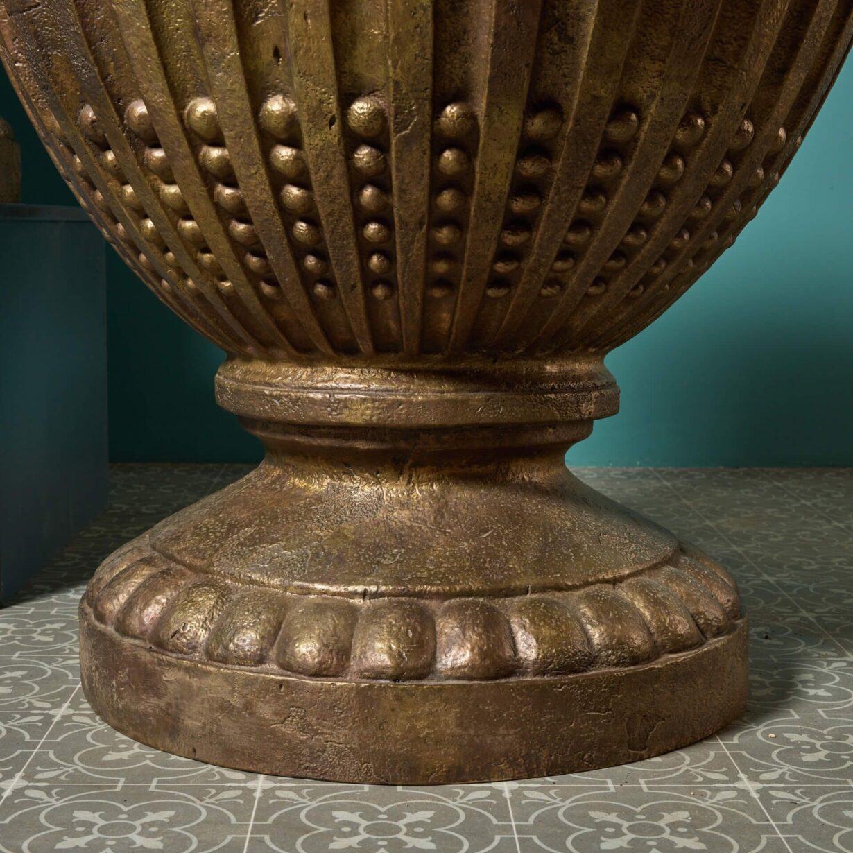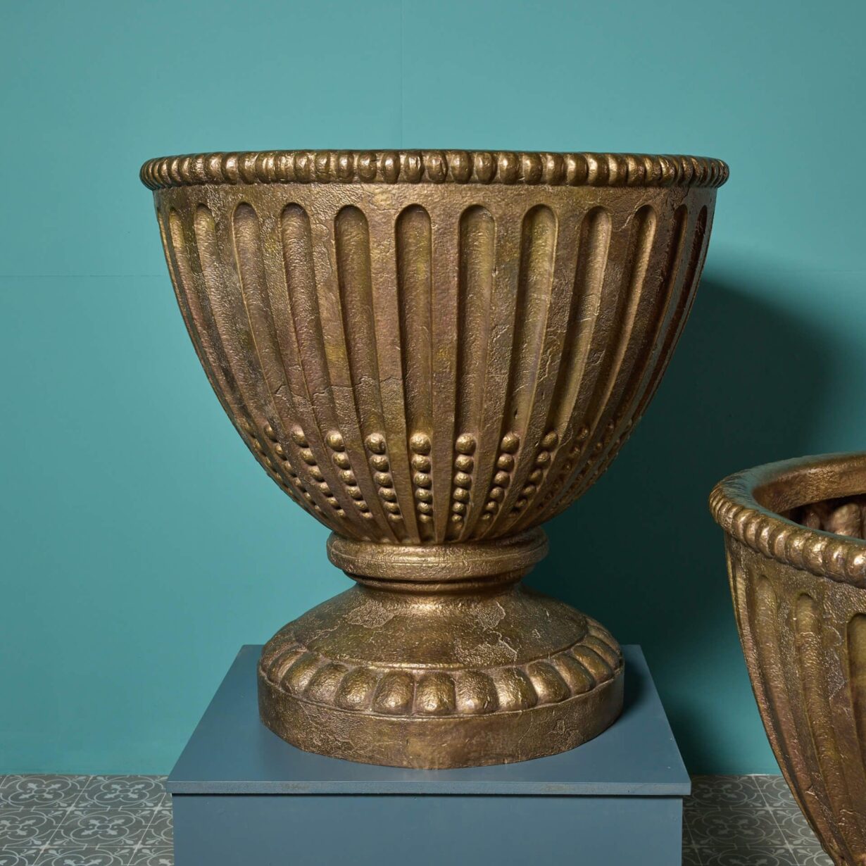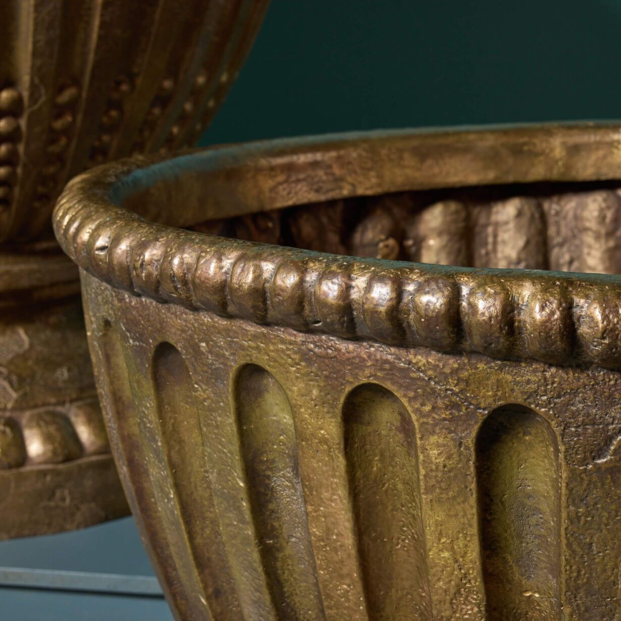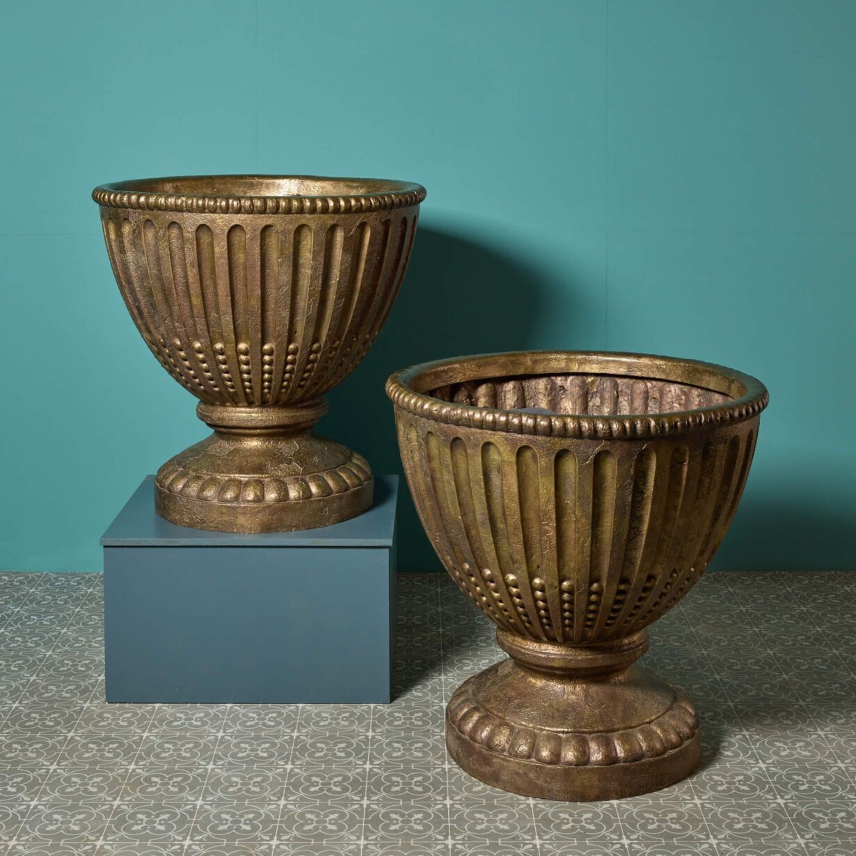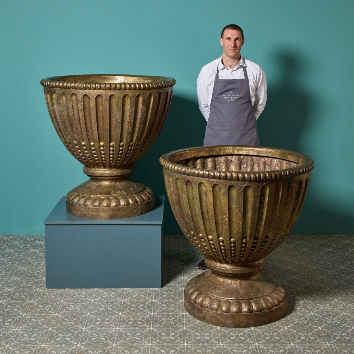 This elegant and eye-catching pair have gadrooned bodies, with wide socles. Their stable stature and quality, incorporating modern and Victorian styles, make them ideal for showcasing stunning trees in any garden.