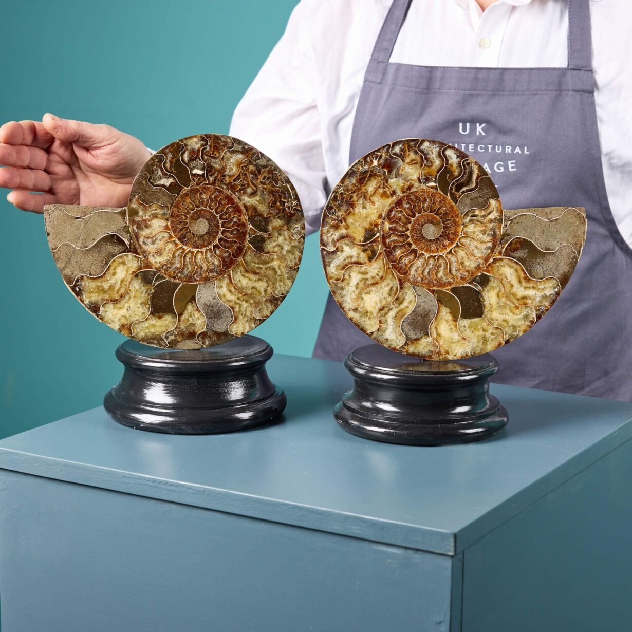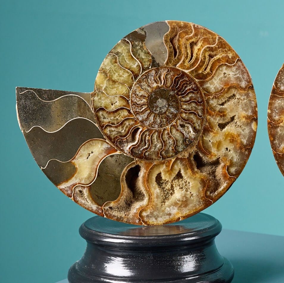 back to topA pair of cut and polished ammonites with crystalline chambers originating from Madagascar. Once living creatures, these ammonites have developed their flowing colours and patterns displayed in their chambers over millions of years of compression, transforming into striking gemstones.