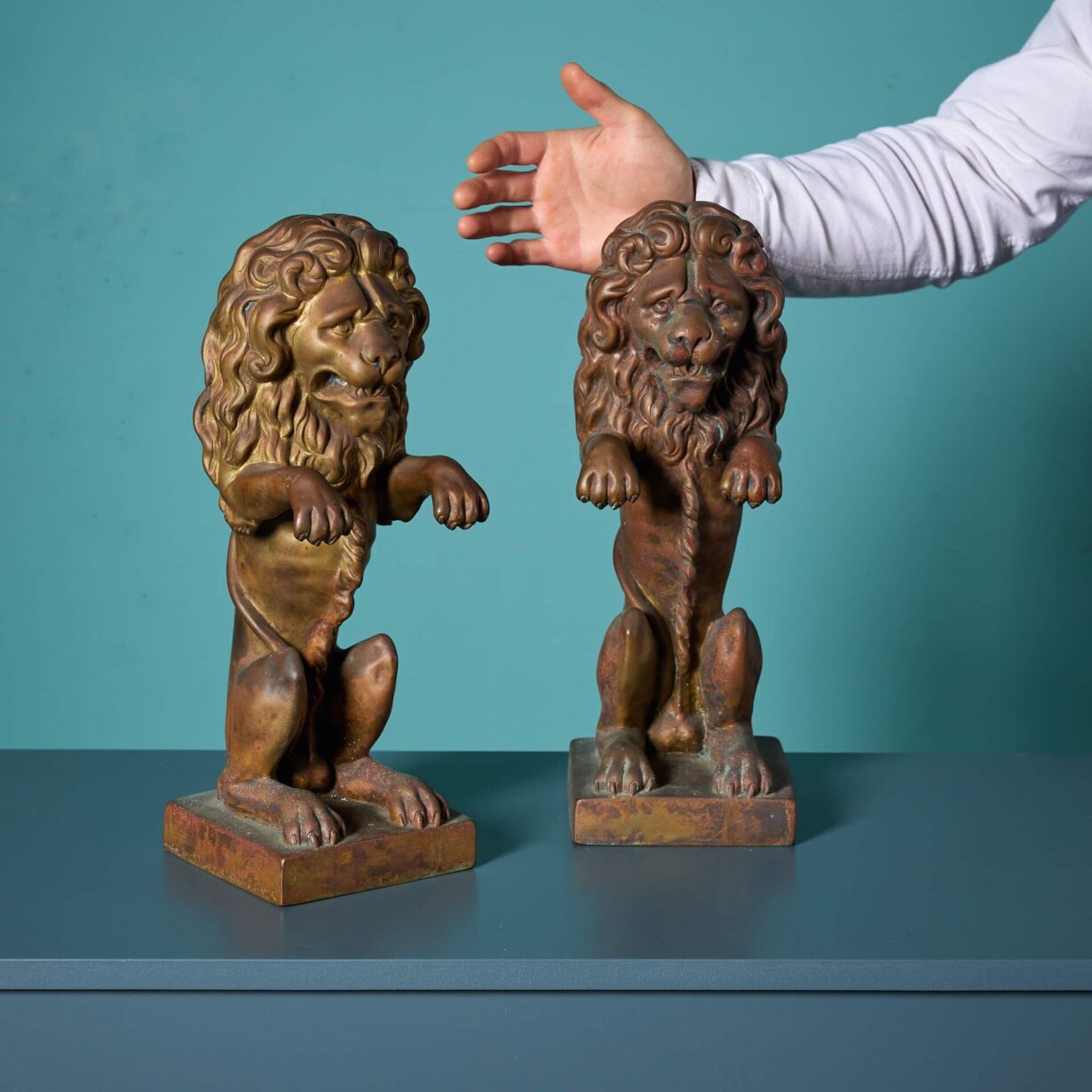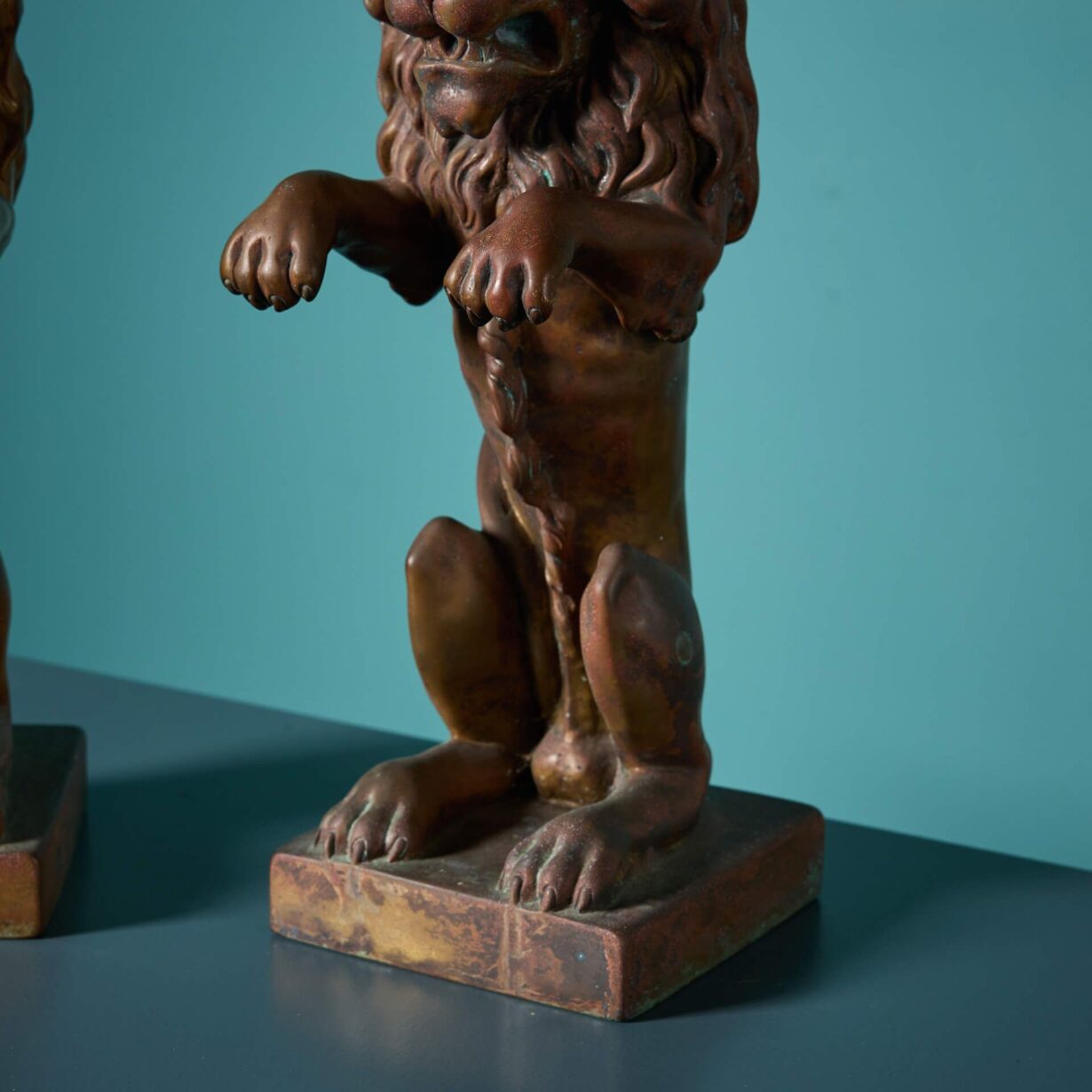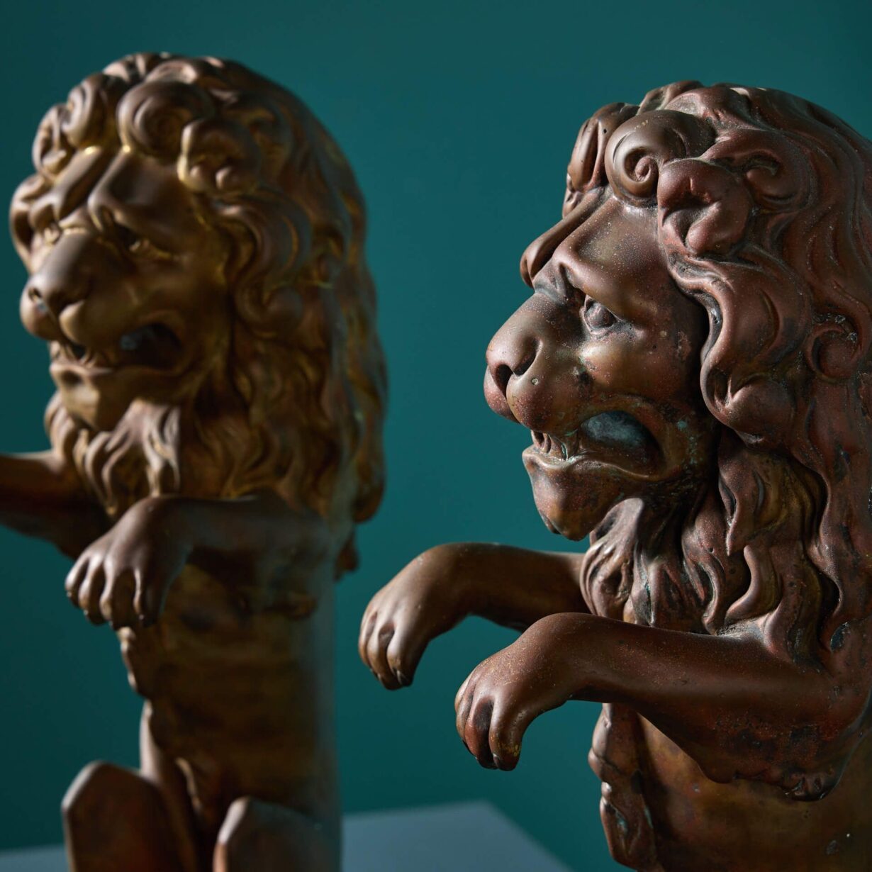 back to topA pair of early 20th century reclaimed bronze armorial lions, circa 1920. These decorative bronze lions could be used indoors as interior decoration or in the garden where exposure to the elements would enhance their lightly weathered, patinated finish. With their timeworn look, these handsome lions have a charming character, each sitting on hind legs with front paws raised, making a handsome feature of any setting.