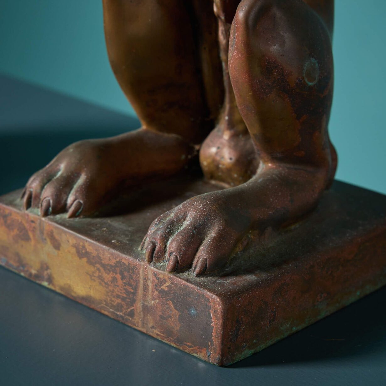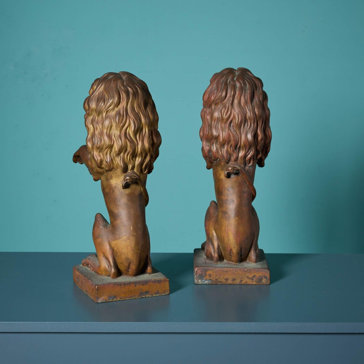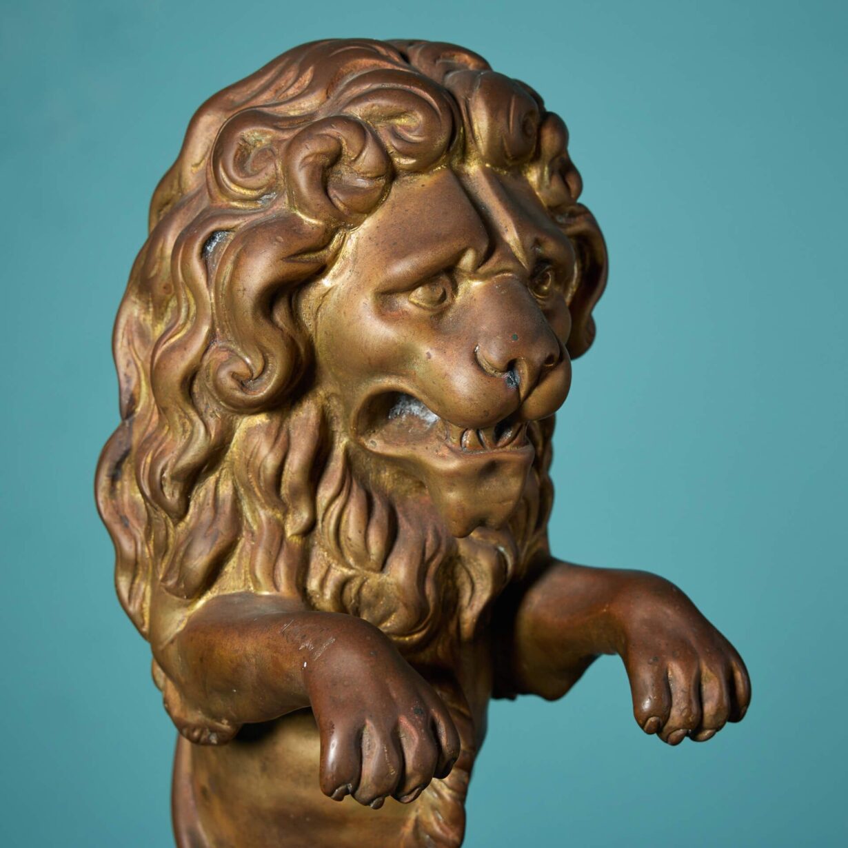 back to topA pair of early 20th century reclaimed bronze armorial lions, circa 1920. These decorative bronze lions could be used indoors as interior decoration or in the garden where exposure to the elements would enhance their lightly weathered, patinated finish. With their timeworn look, these handsome lions have a charming character, each sitting on hind legs with front paws raised, making a handsome feature of any setting.