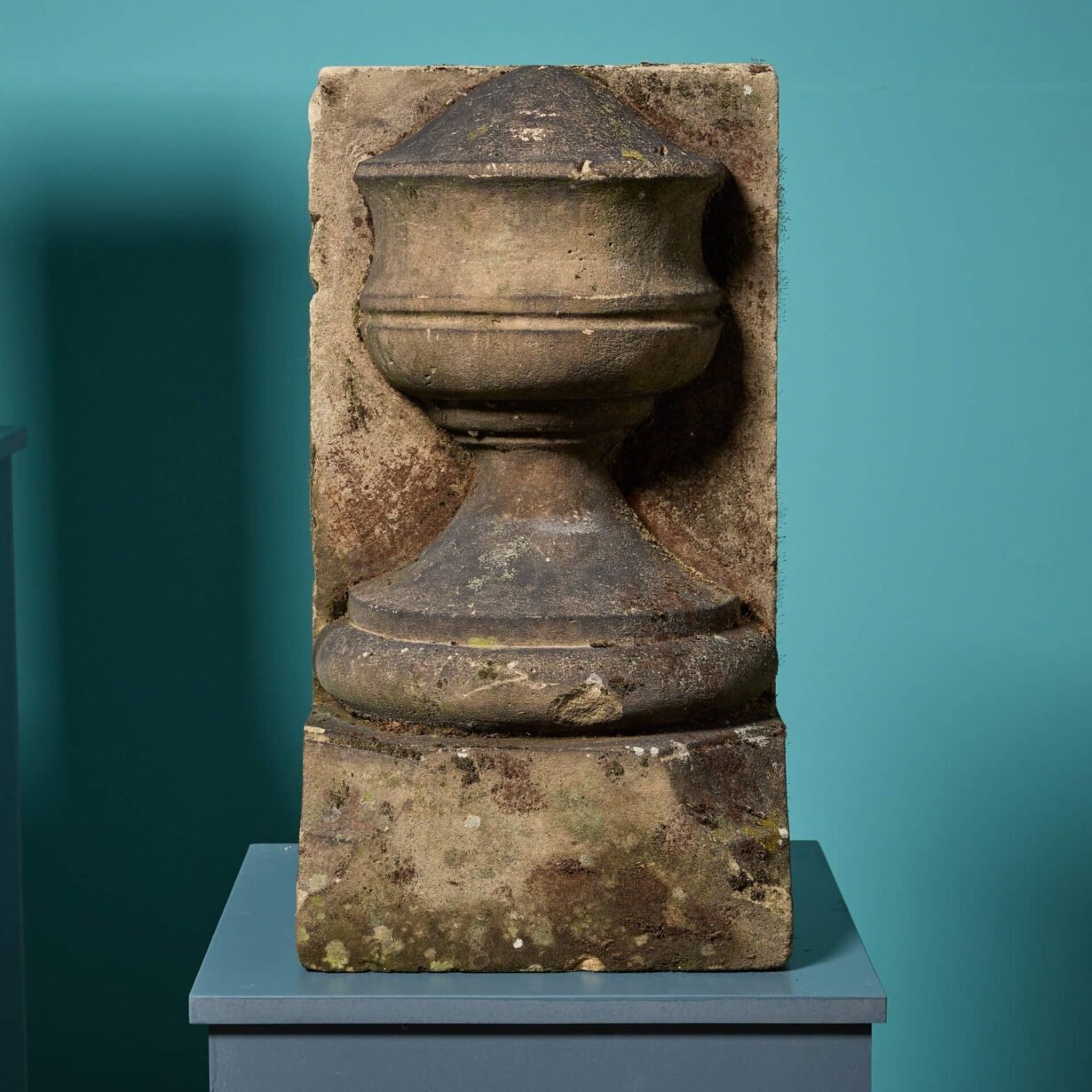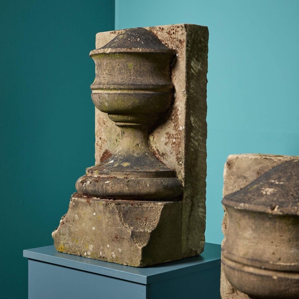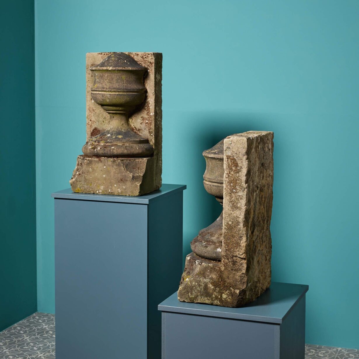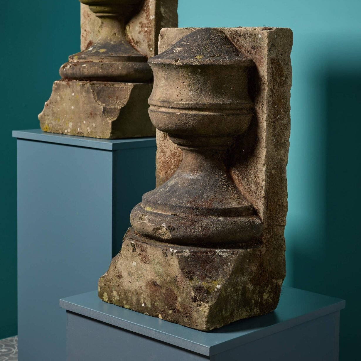 back to topA pair of reclaimed York stone urn stop finials, well-weathered with moss and lichen. Dating back to circa 1800, these ornate antique finials will add an air of grandeur to any property, making striking architectural features of a garden or building facade.