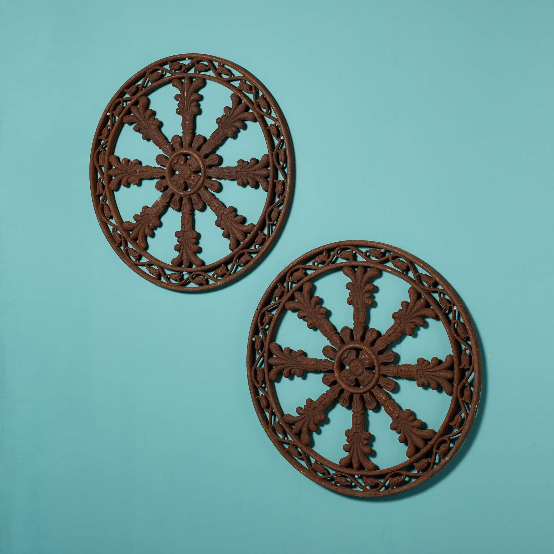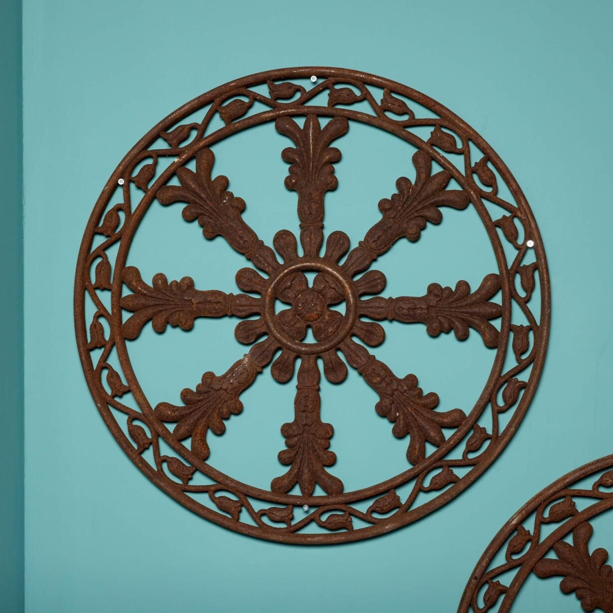 back to topA pair of Victorian cast iron decorative roundels. Dating back to circa 1850, these roundels were traditionally used as decorative air vents. Their unusual floral design would look impressive hung on display in a rustic country property. Alternatively, this pair could be used outdoors; either set into a wall or garden or set into a gable on a building.