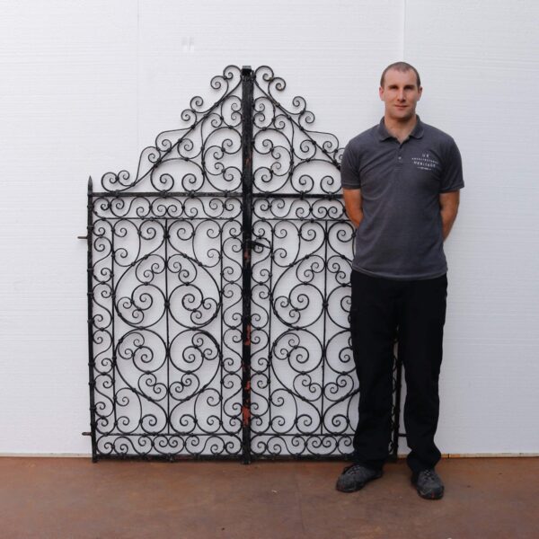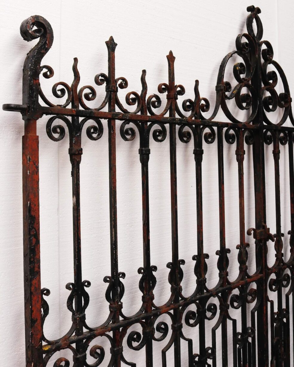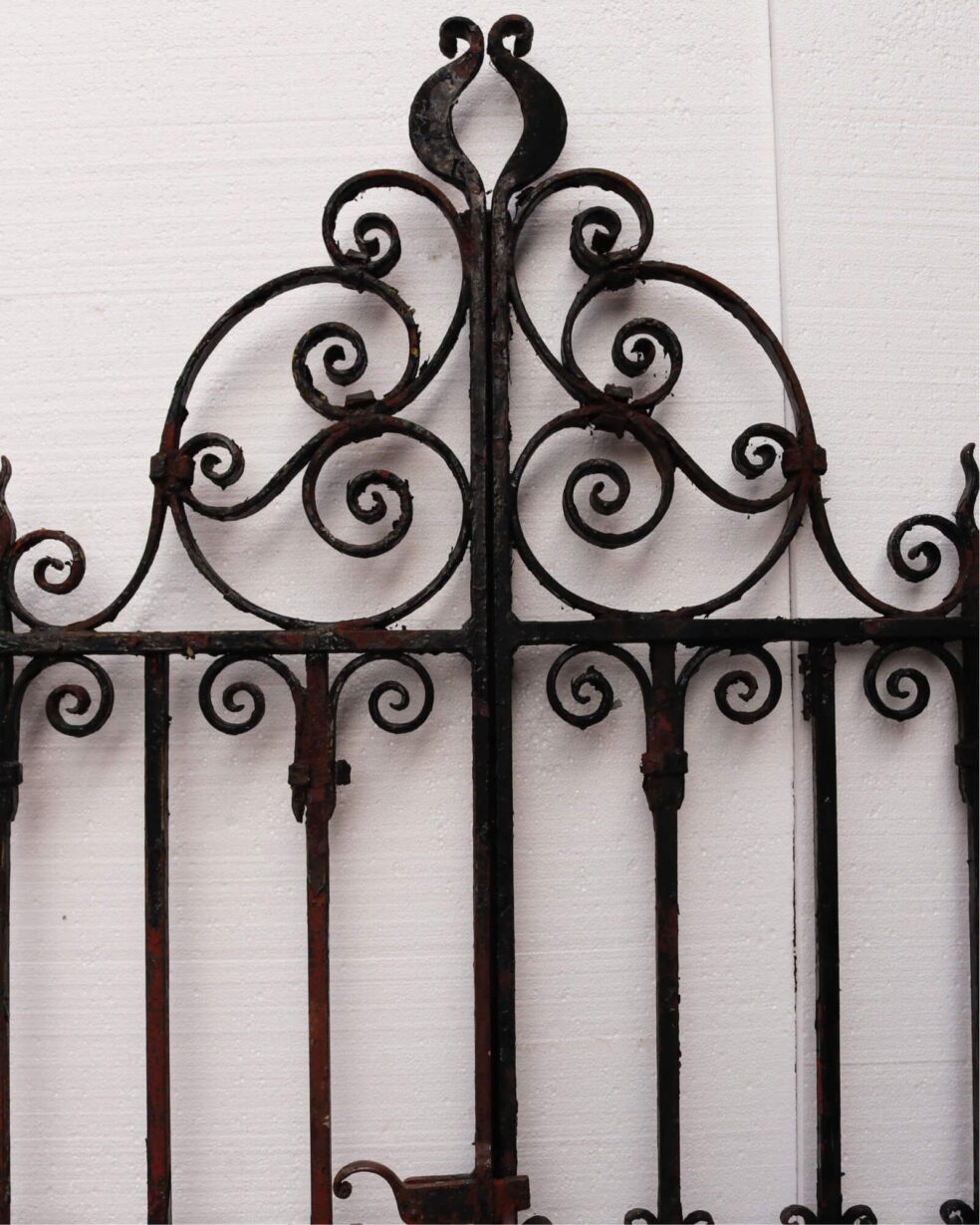 back to topPair of original Victorian elaborately crafted wrought iron driveway gates crafted in circa 1880. These 19th century gates do not disappoint in size and design. Rows of elongated scrolls and swirls are matched structurally with the original working stay, which has an interesting likeness to a shepherd’s staff. Their working latch is accompanied by modern hinge components, that will allow it to be fitted easily at its next home. These impressive gates would be ideal for an English countryside property.