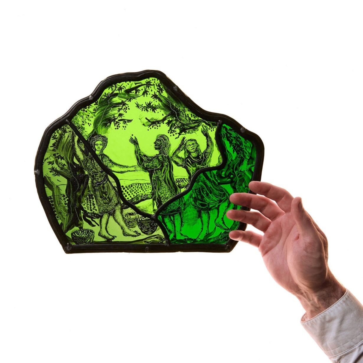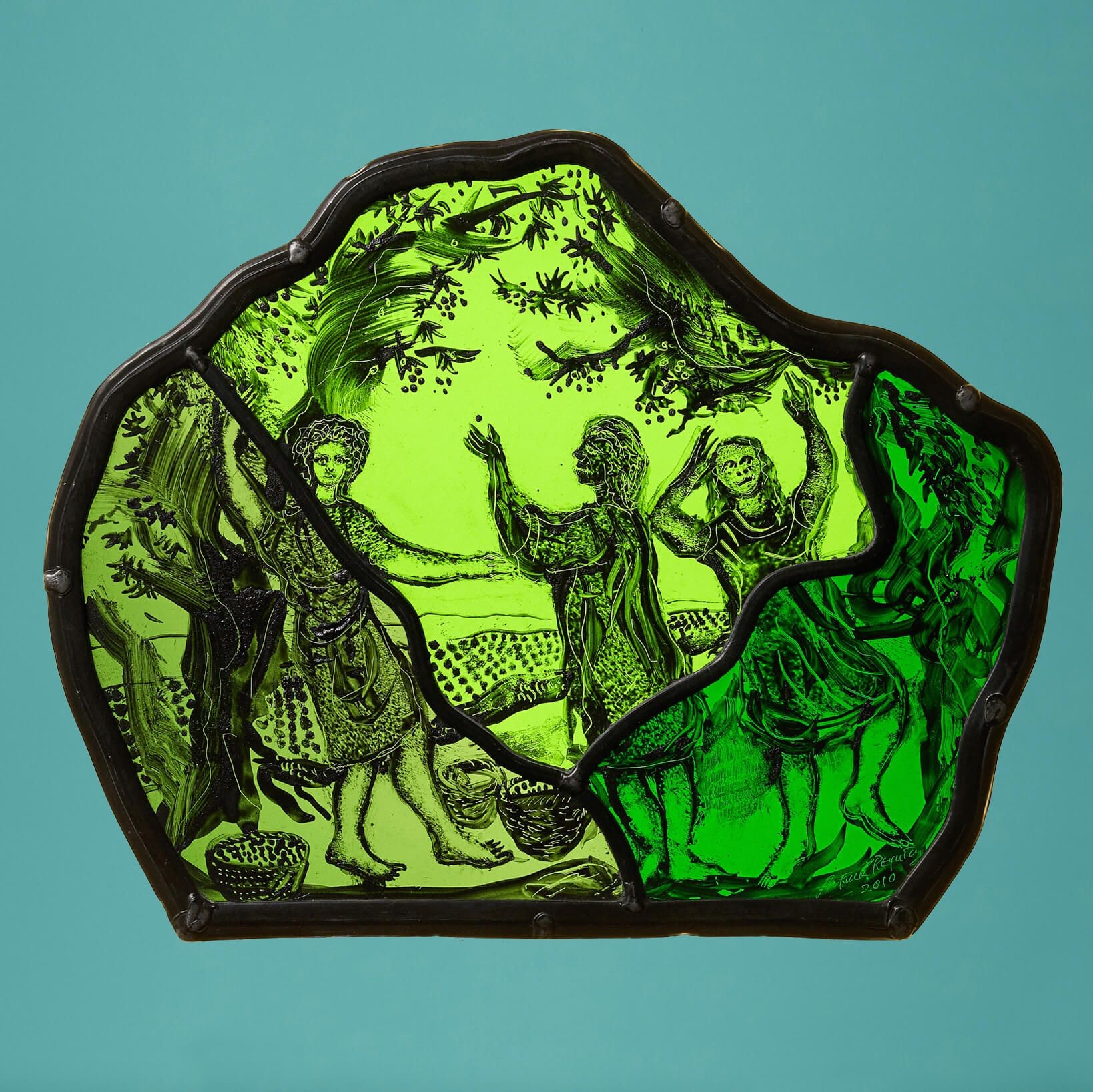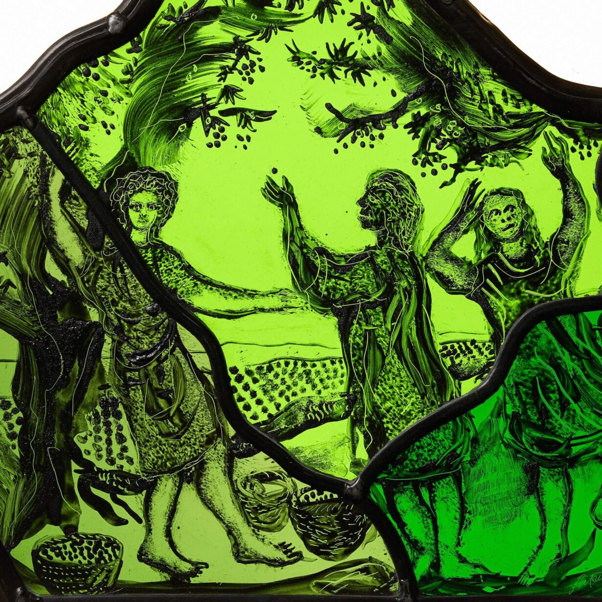 back to topTitled ‘Grape Pickin’ All The Time!’, this is a small stained glass window hanging made by the late stained glass artist, Patrick Reyntiens. It is signed and dated 2010 in the lower right-hand corner.