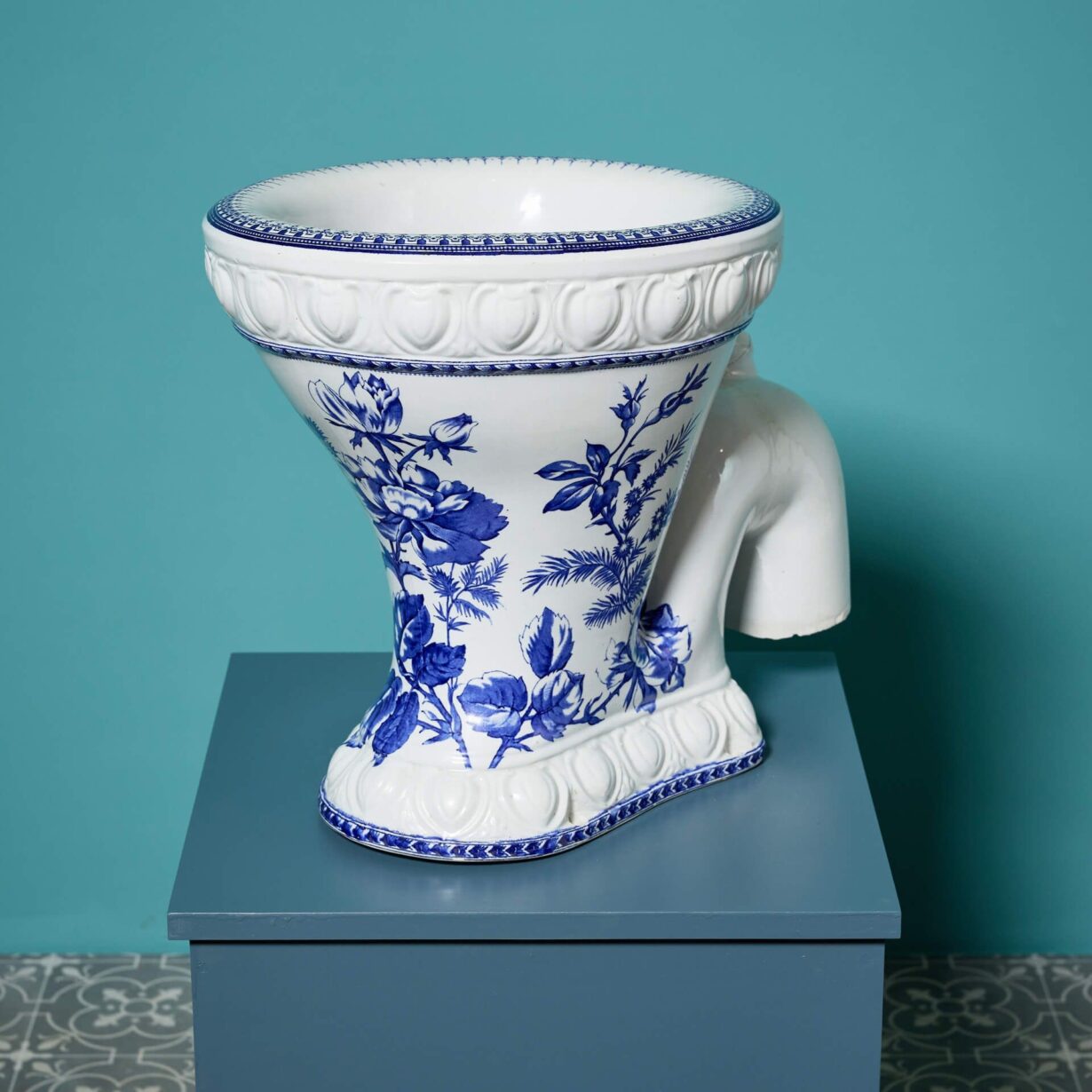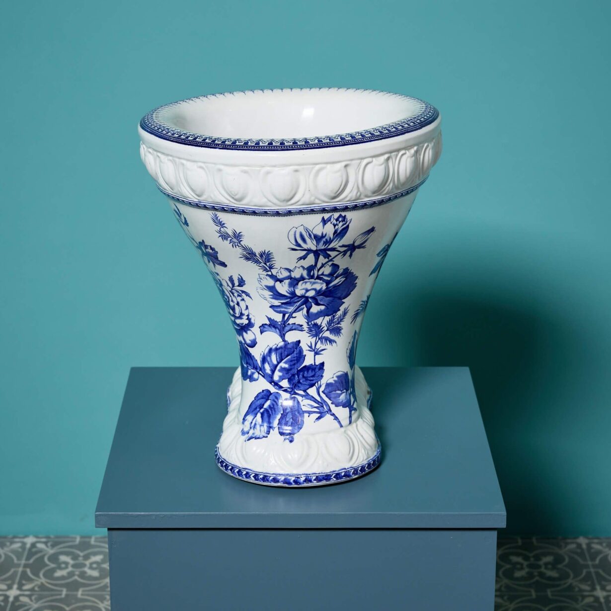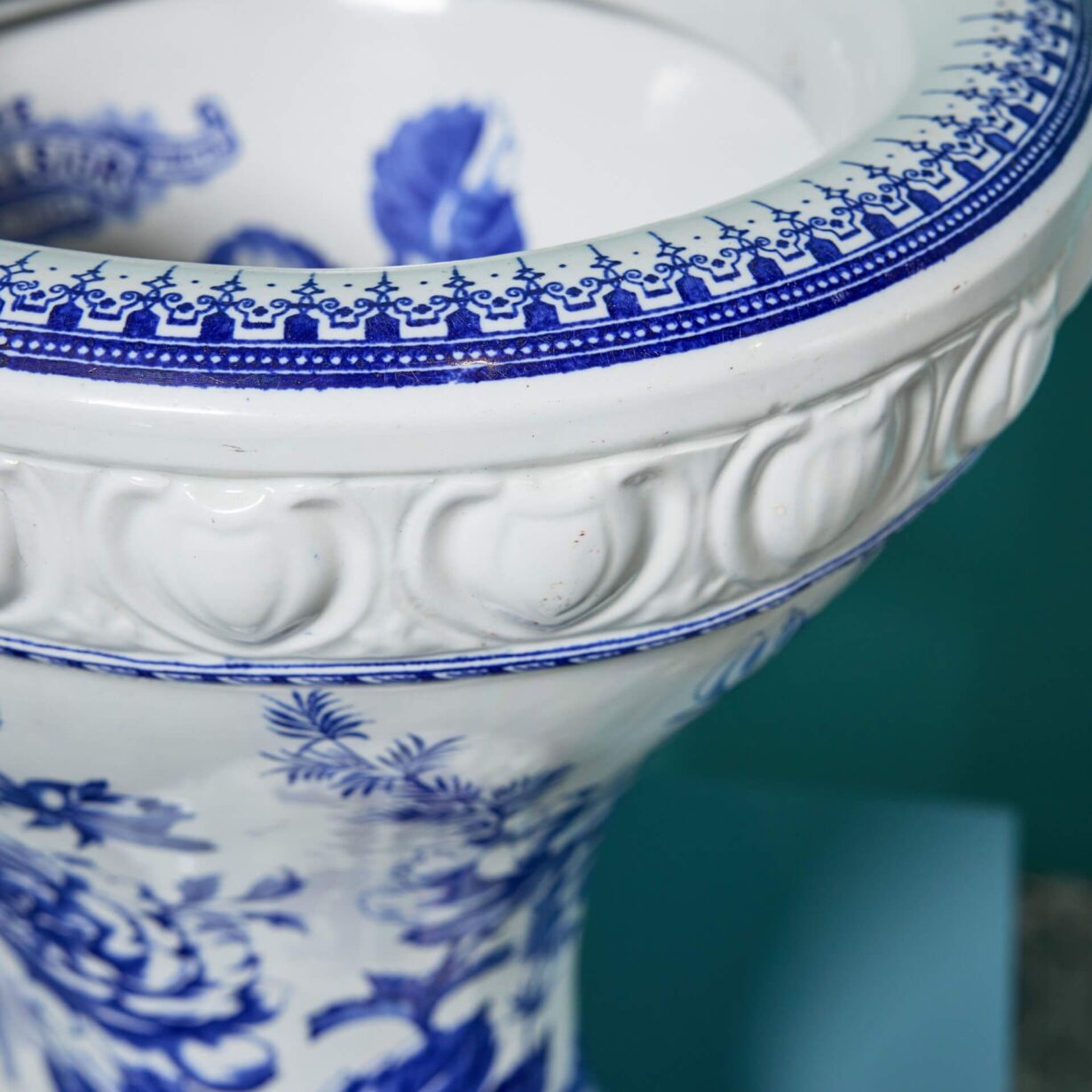 It features an attractive blue and white patterned bowl and decorative moulding to the glazed porcelain around the base and rim.