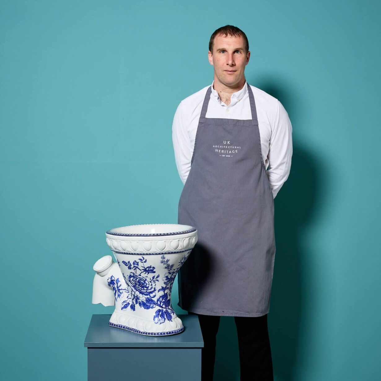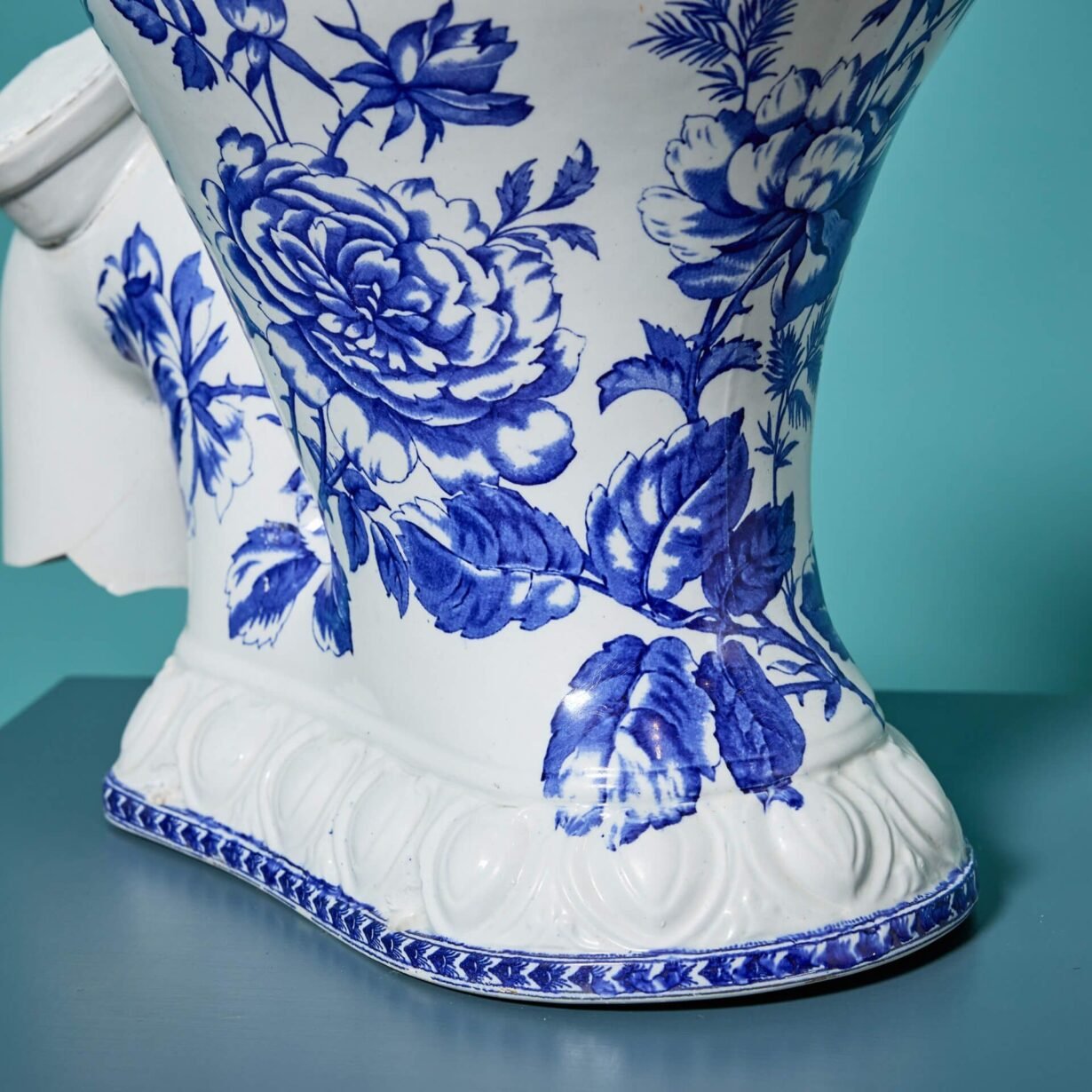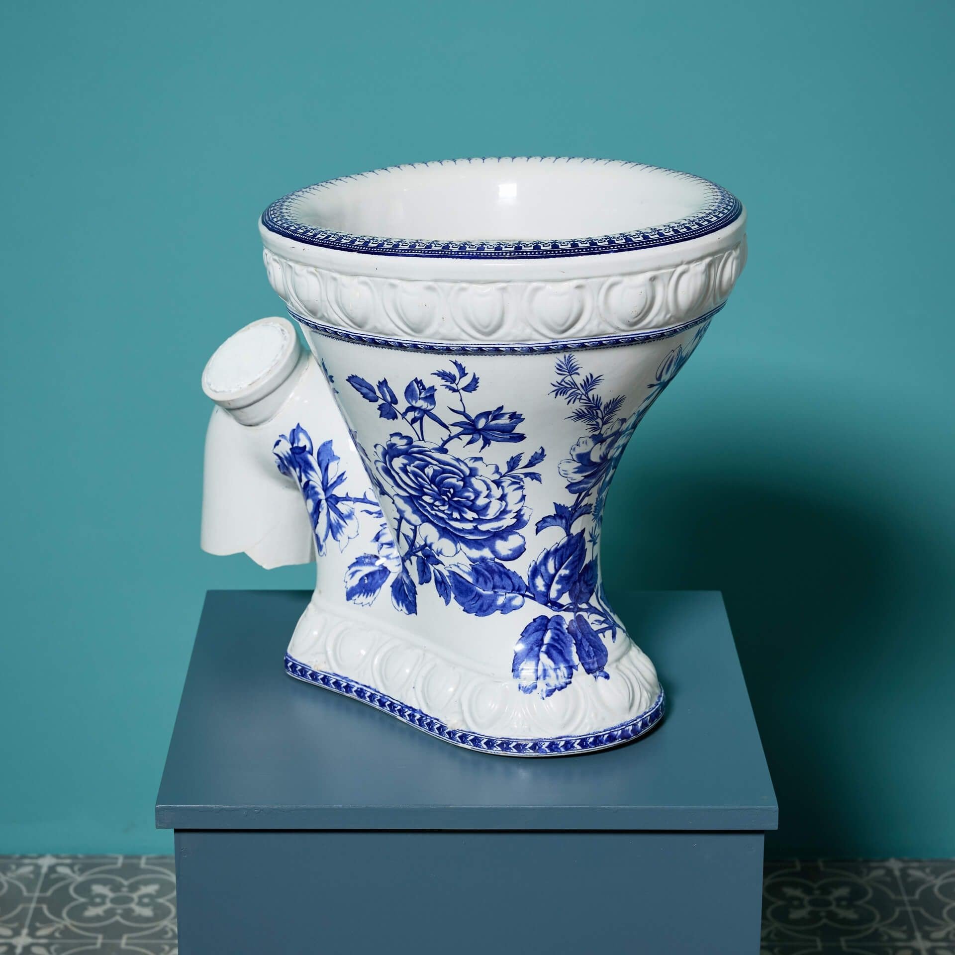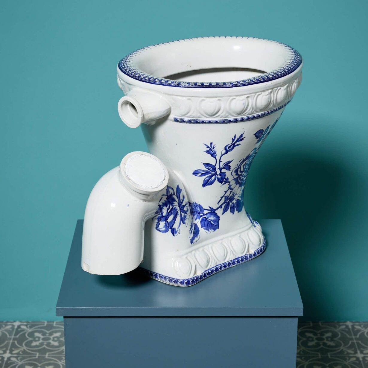 It features an attractive blue and white patterned bowl and decorative moulding to the glazed porcelain around the base and rim.