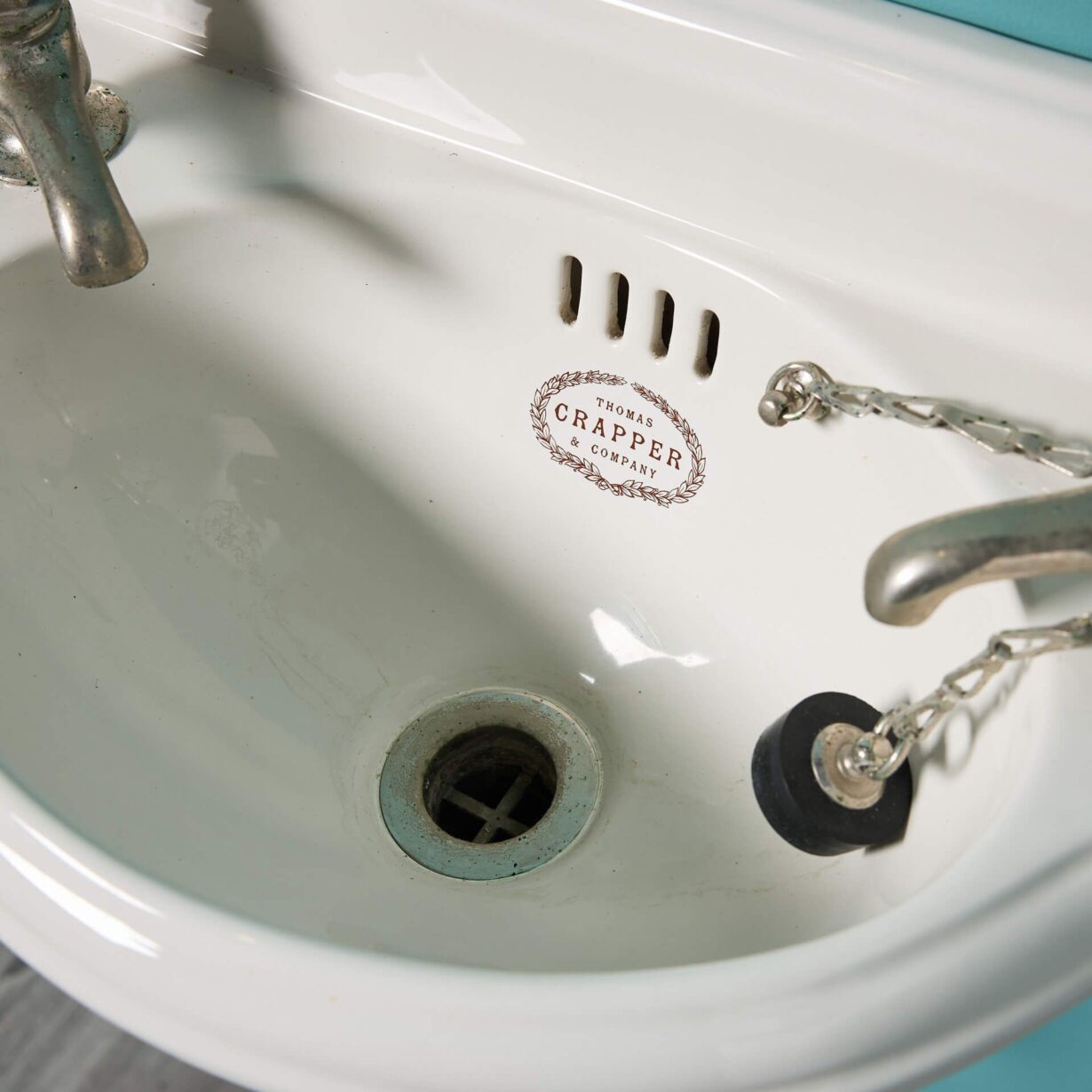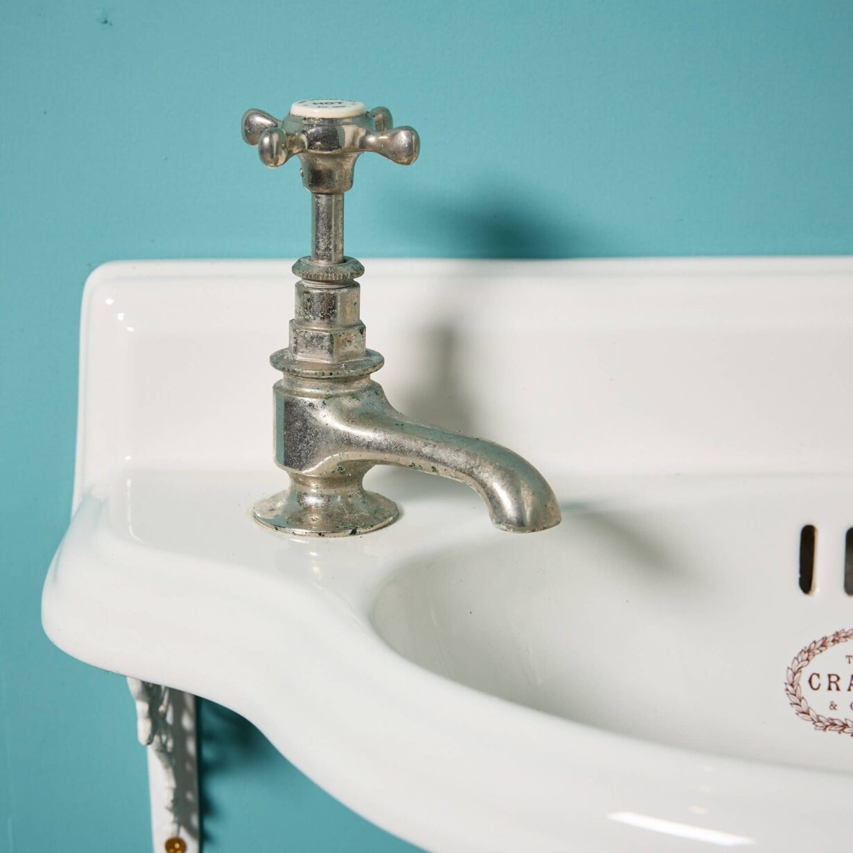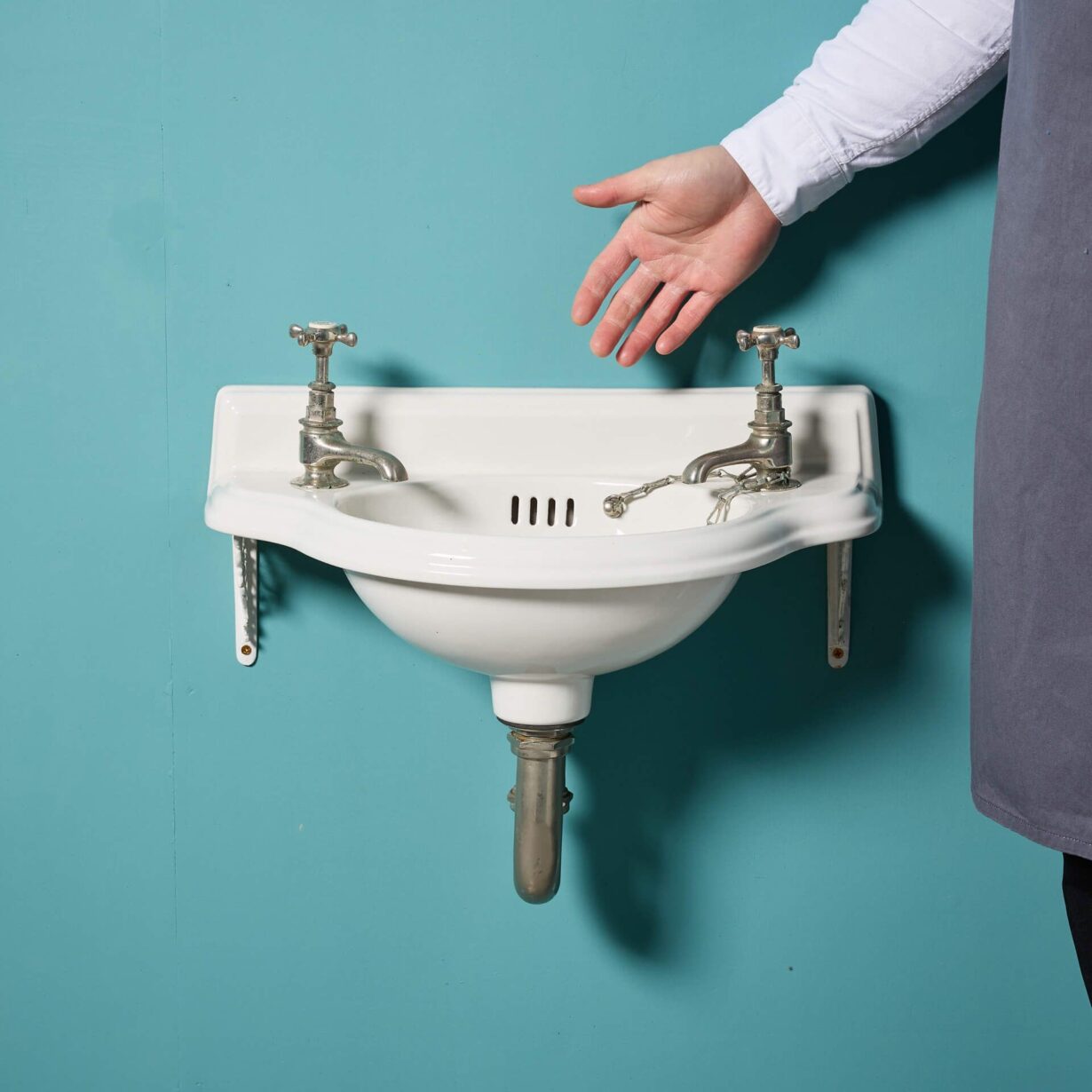 This English sink is fitted with period French style nickel plated fittings and square splash back.