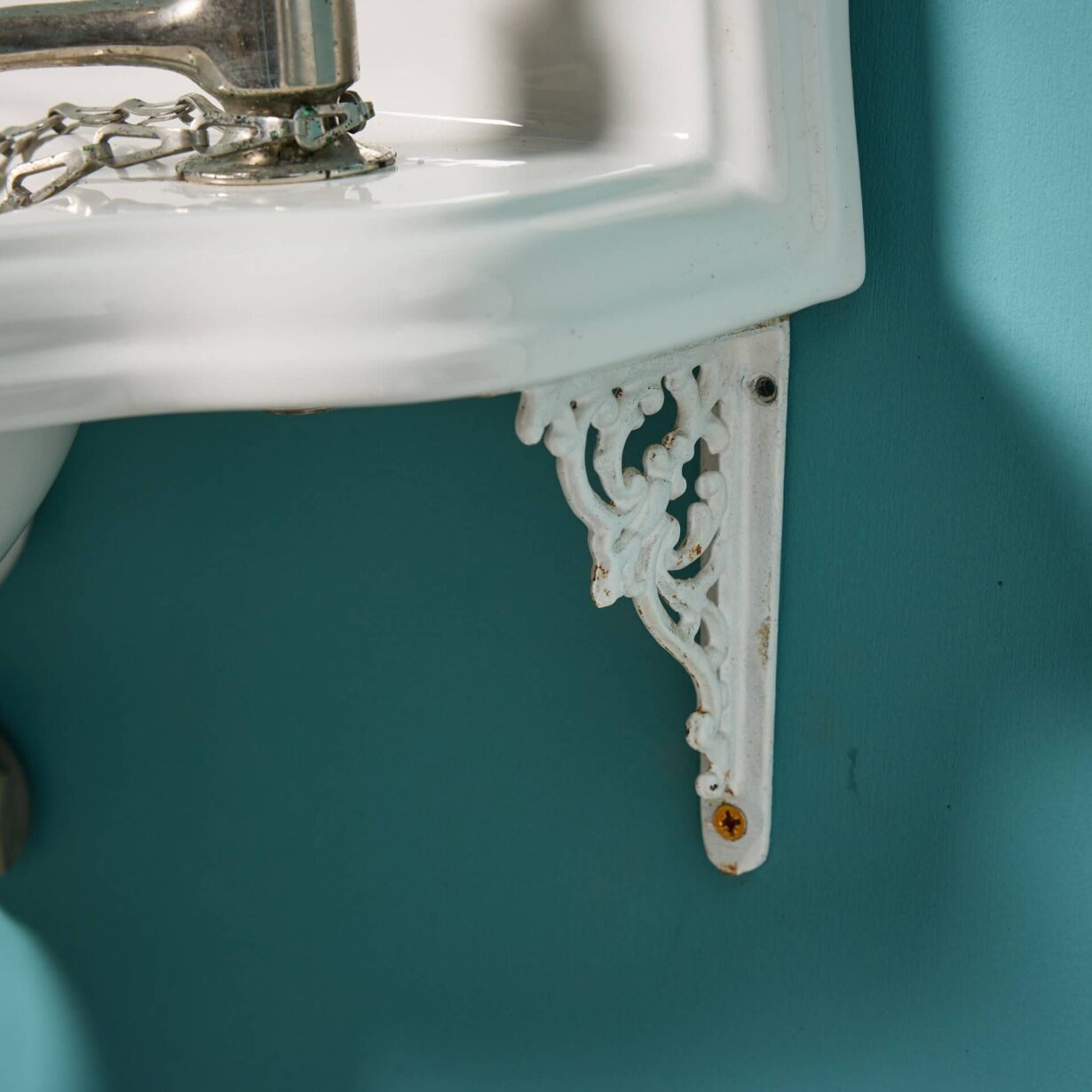 The decorative yet functional cast iron wall bracket with a subtle floral design and a desirable distressed paint finish only adds to its charm.