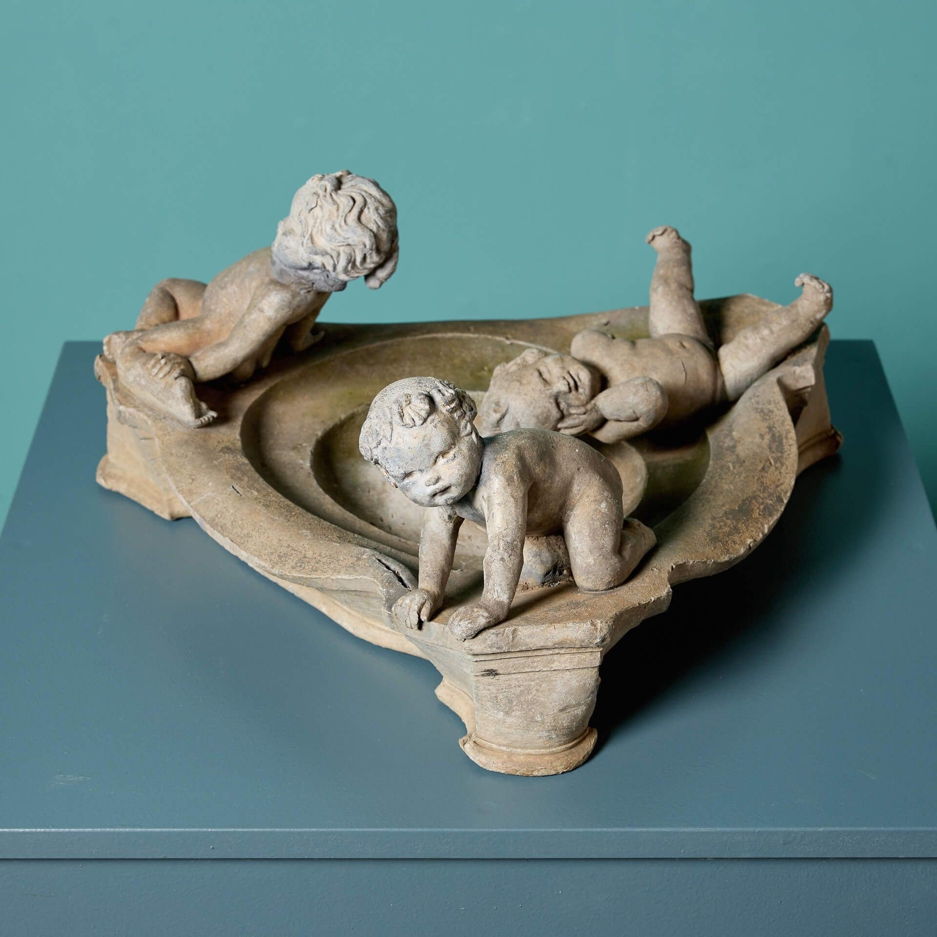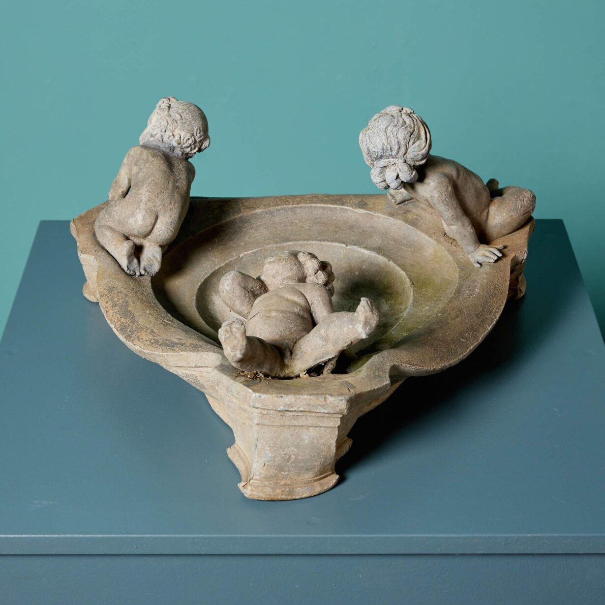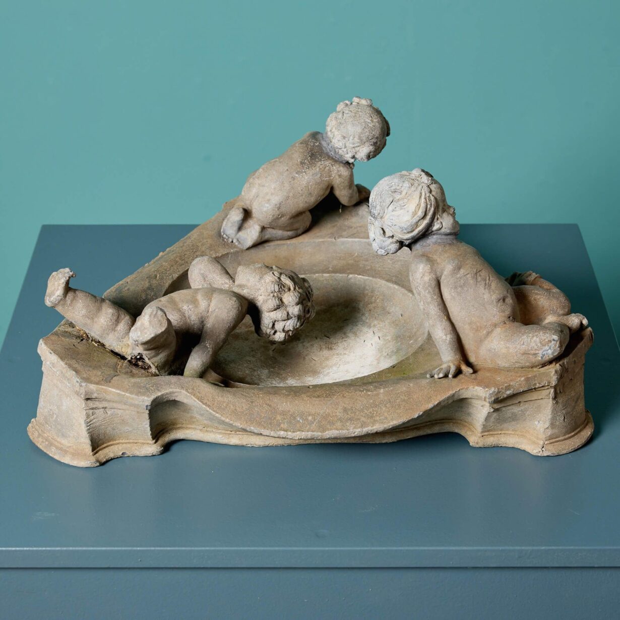 It features a round bird bath with sweeping edges to form a triangular shape with a single nude cherub at each corner. The three cherubs or putti sit or lean playfully around the bath, some lounging towards the water and others playing at the edge.