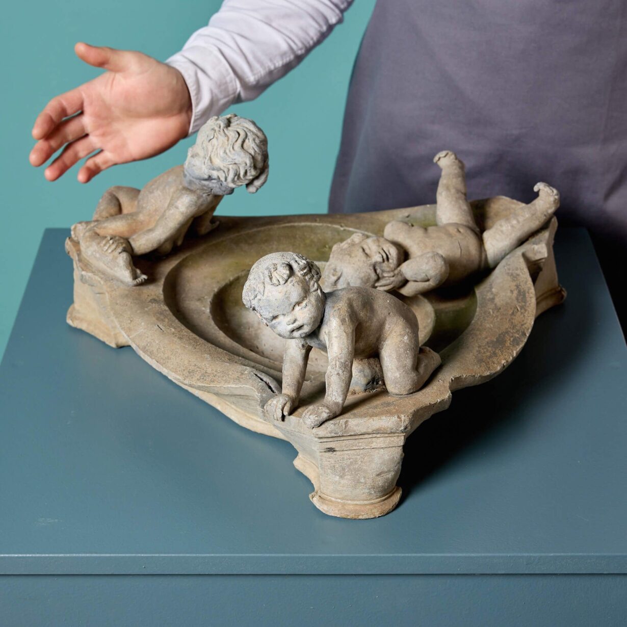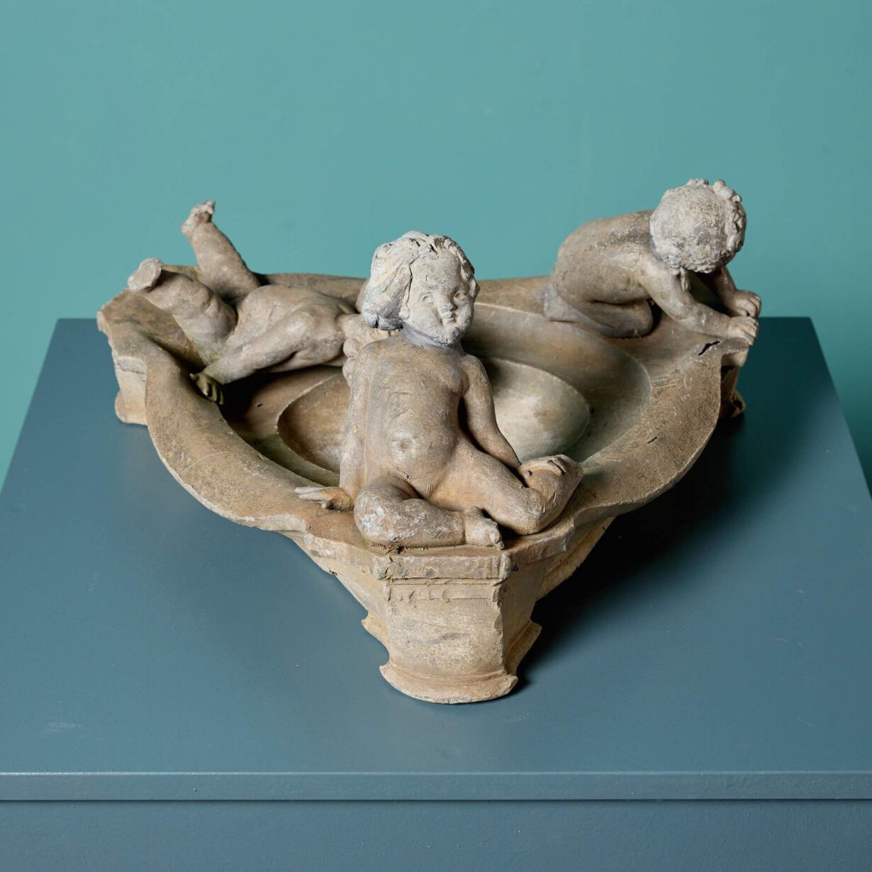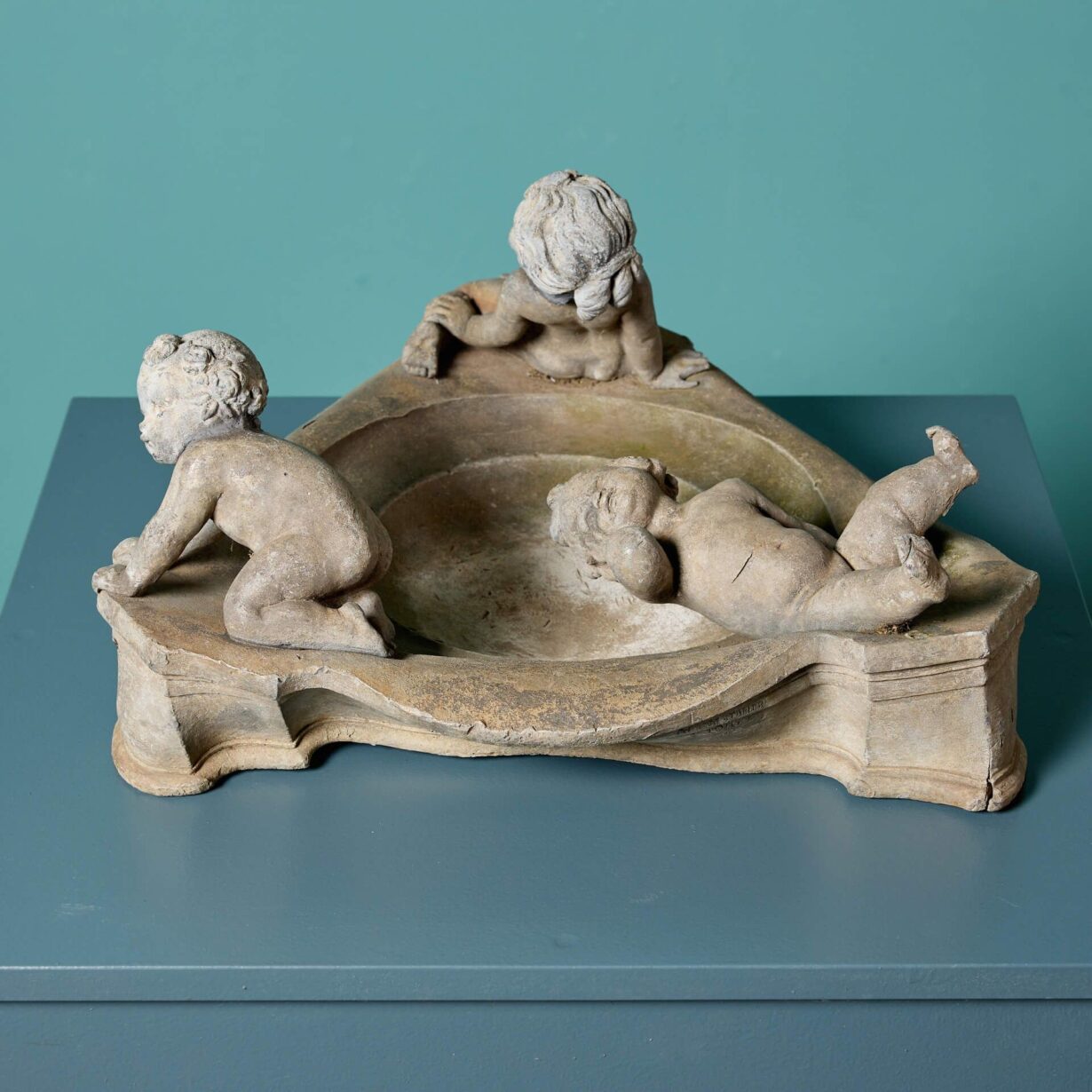 It features a round bird bath with sweeping edges to form a triangular shape with a single nude cherub at each corner. The three cherubs or putti sit or lean playfully around the bath, some lounging towards the water and others playing at the edge.