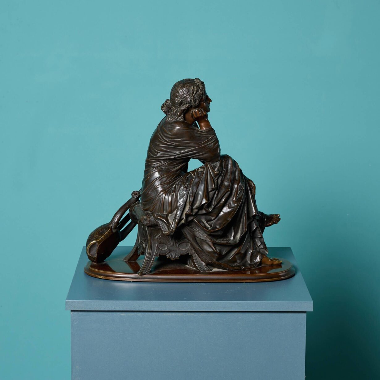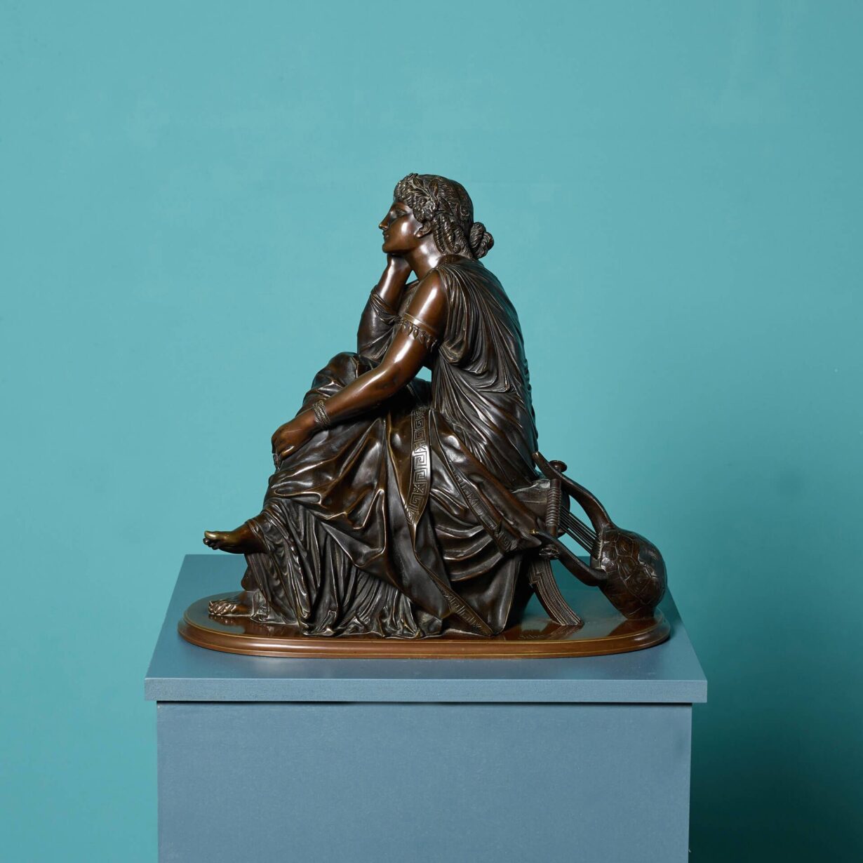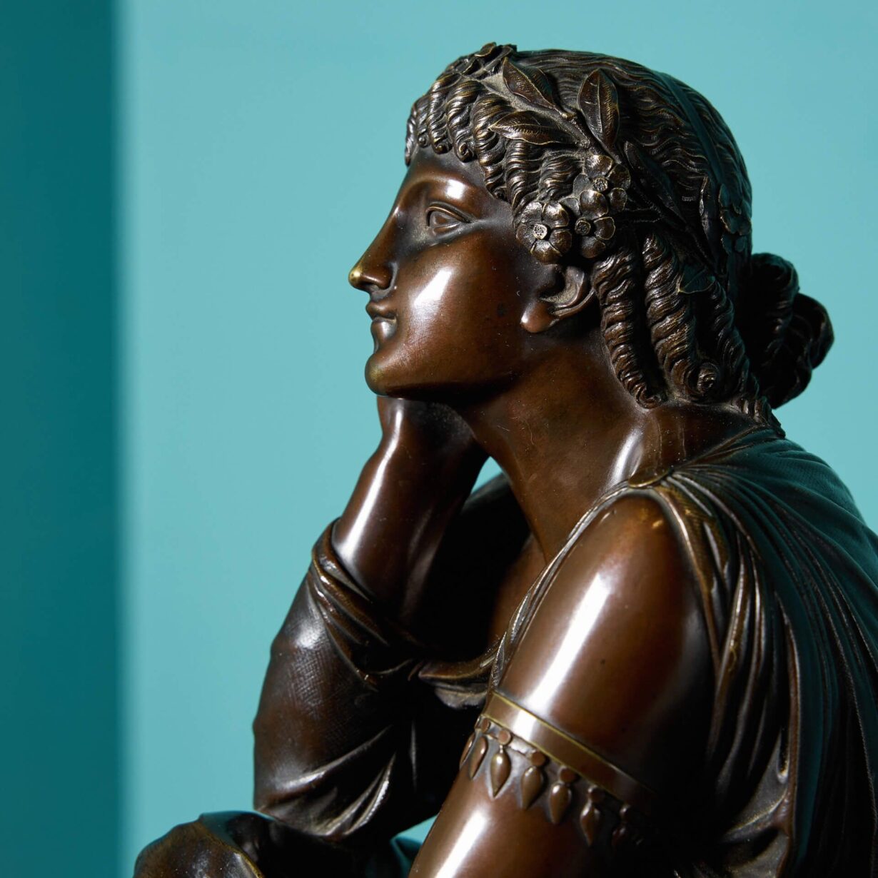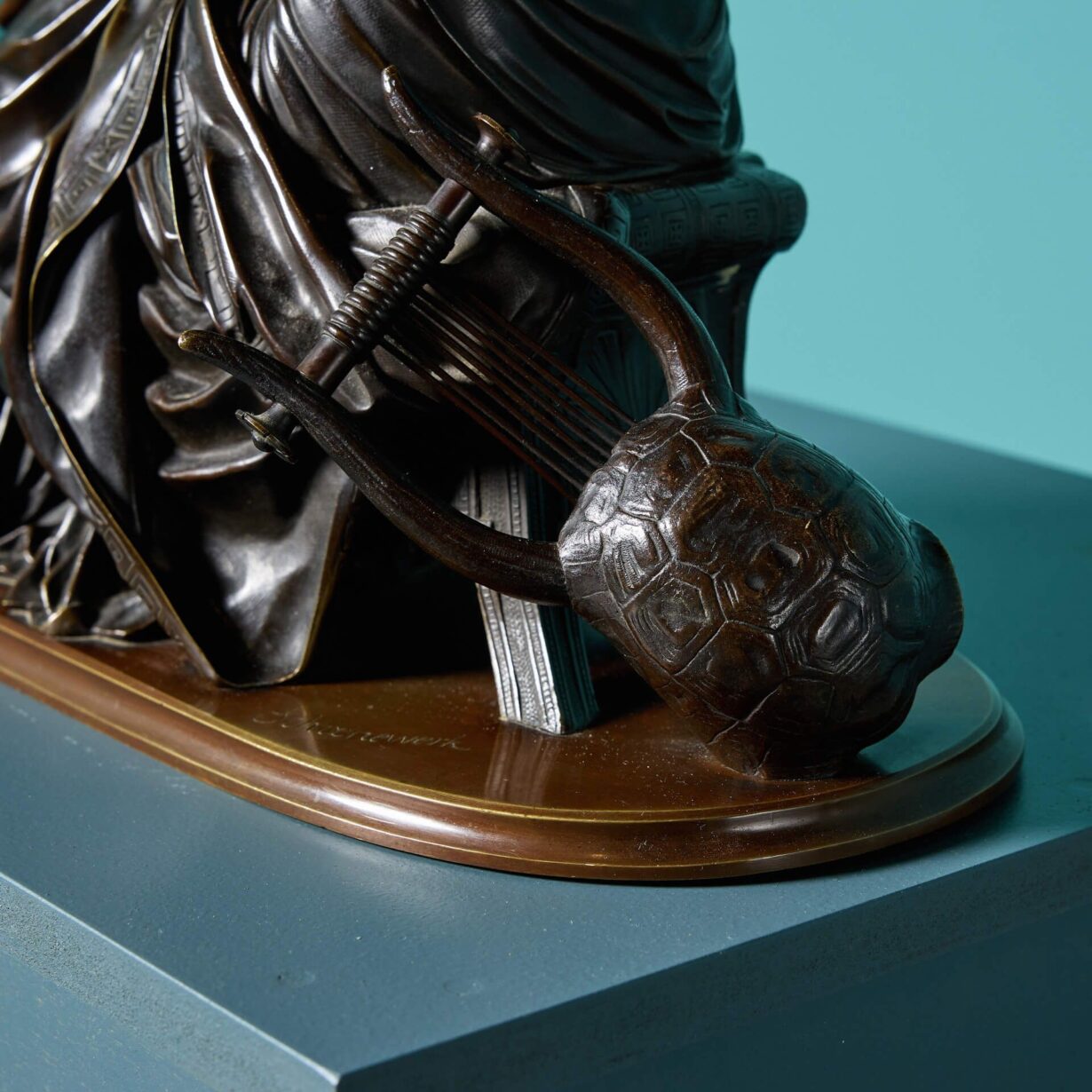 back to topAn antique 19th century French classical bronze figure of a seated Euterpe by Pierre Alexandre Schoenewerk.