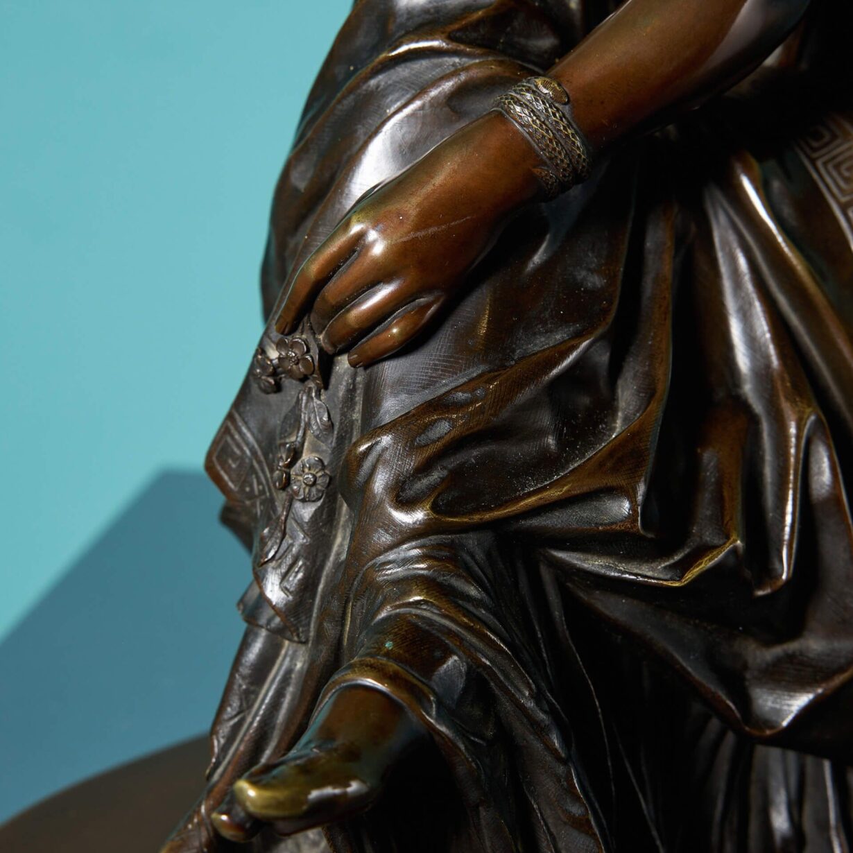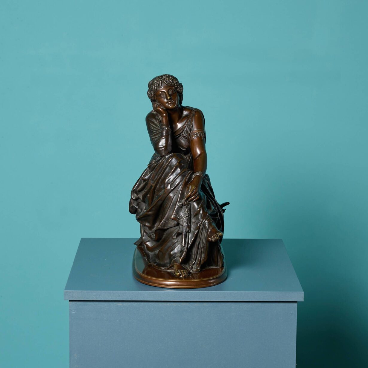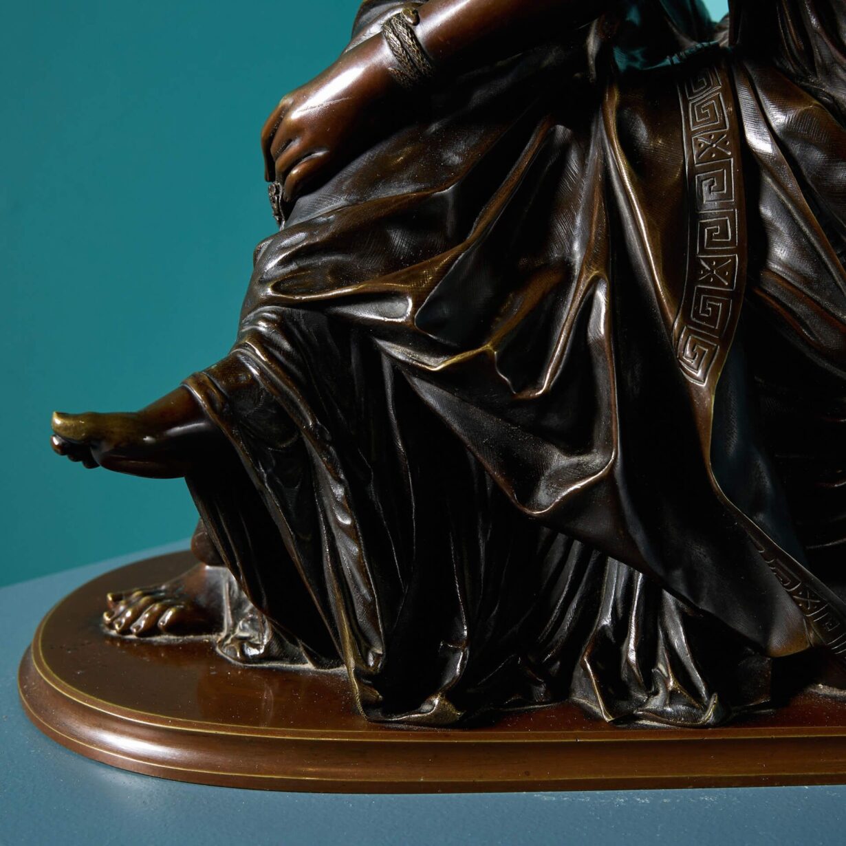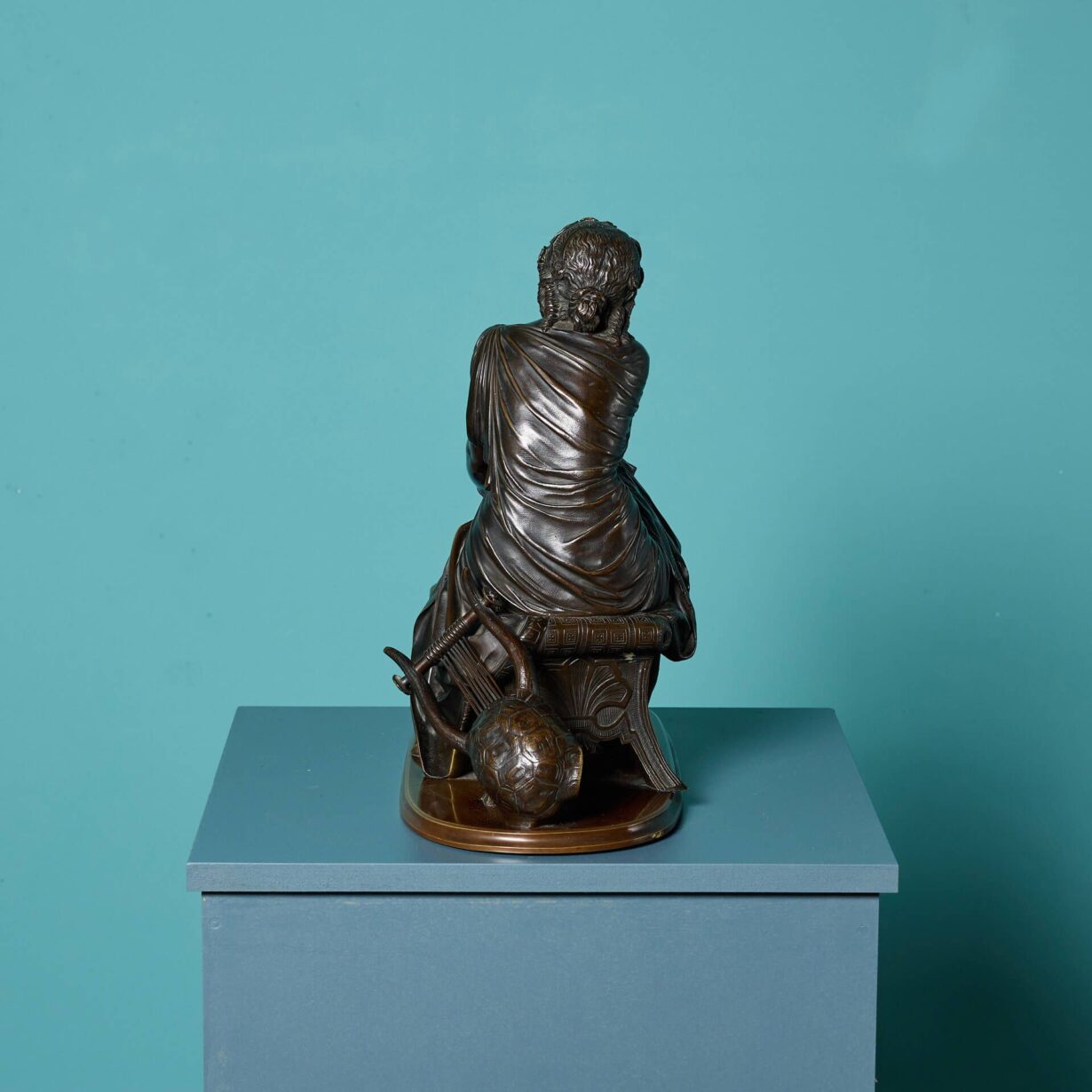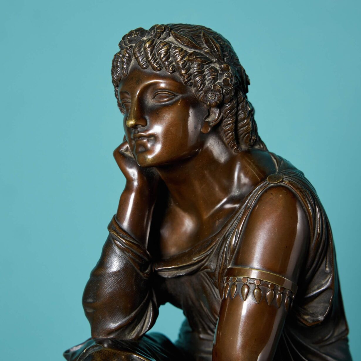 back to topAn antique 19th century French classical bronze figure of a seated Euterpe by Pierre Alexandre Schoenewerk.