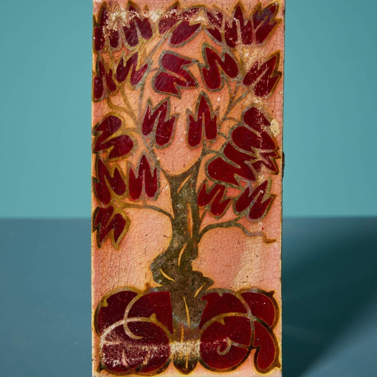 One of four similar in design we have for sale, this antique tile is artistically decorated with a tree of life with rich red leaves, the trunk and branches outlined in a golden lustre glaze.
