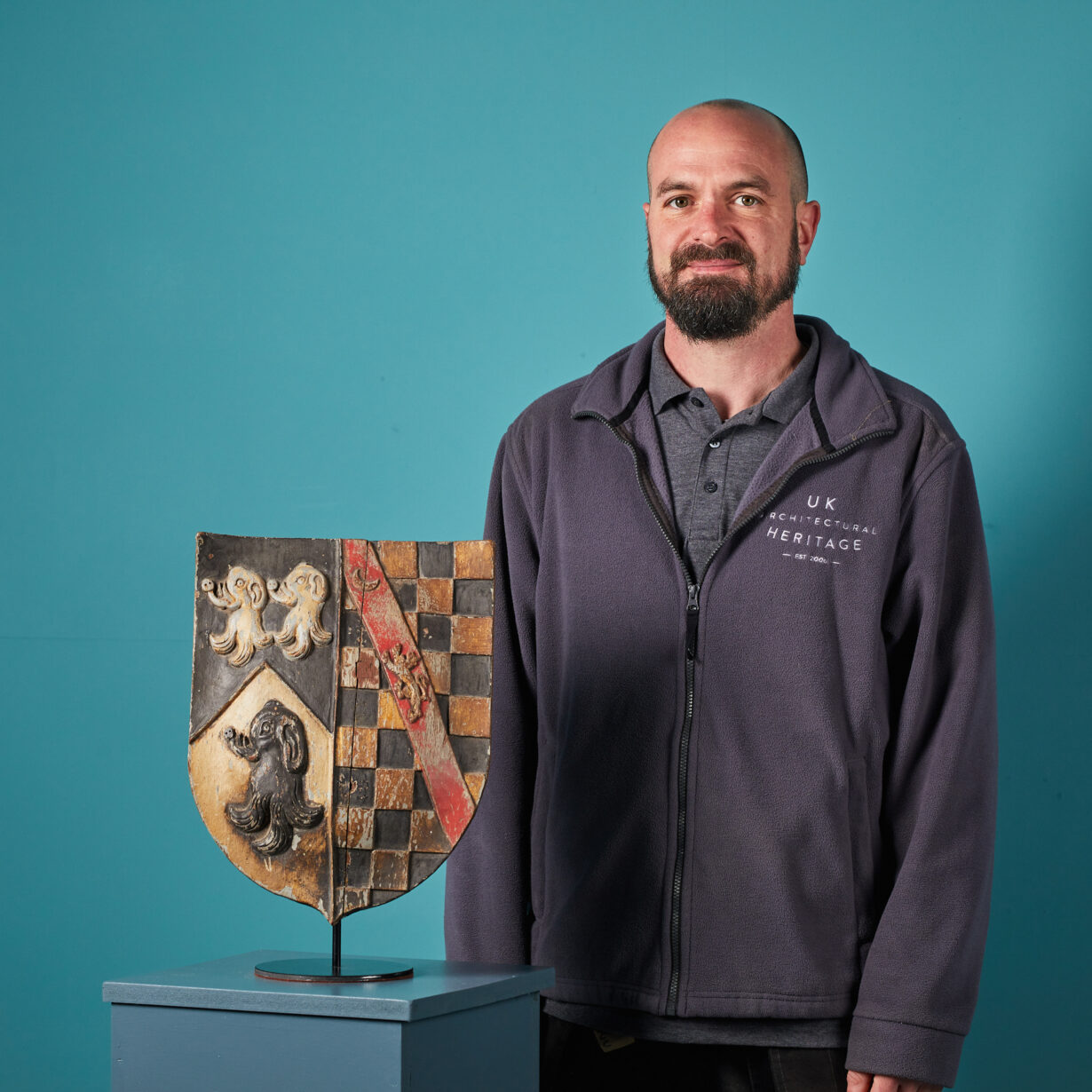 Good structural condition. The shield has been mounted on a bespoke steel stand. There are some small losses and wear.