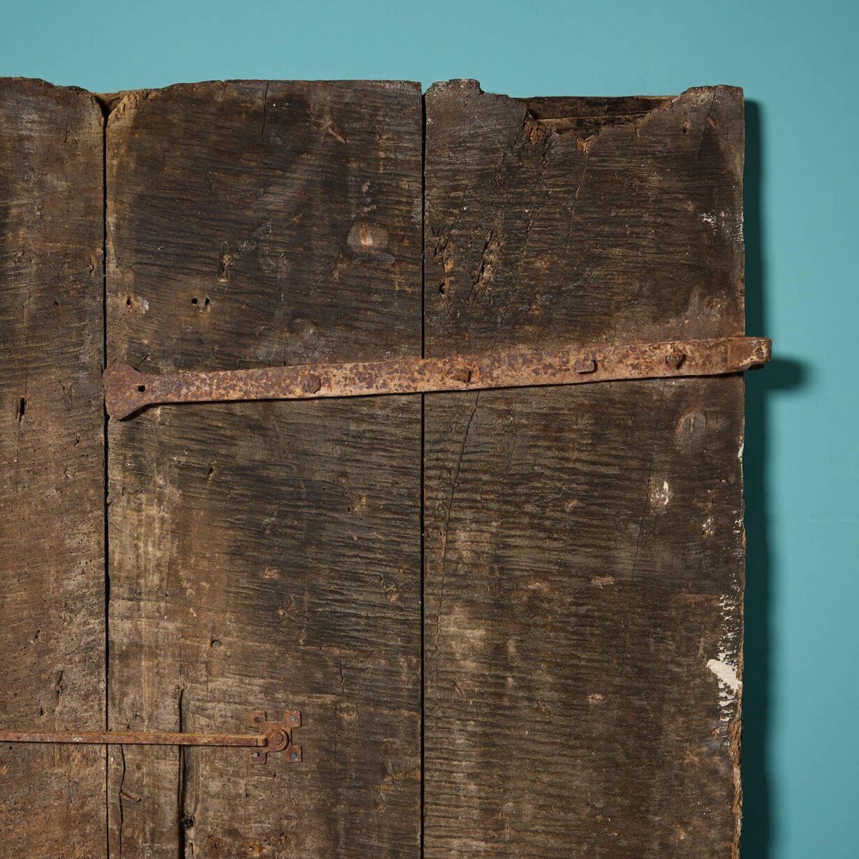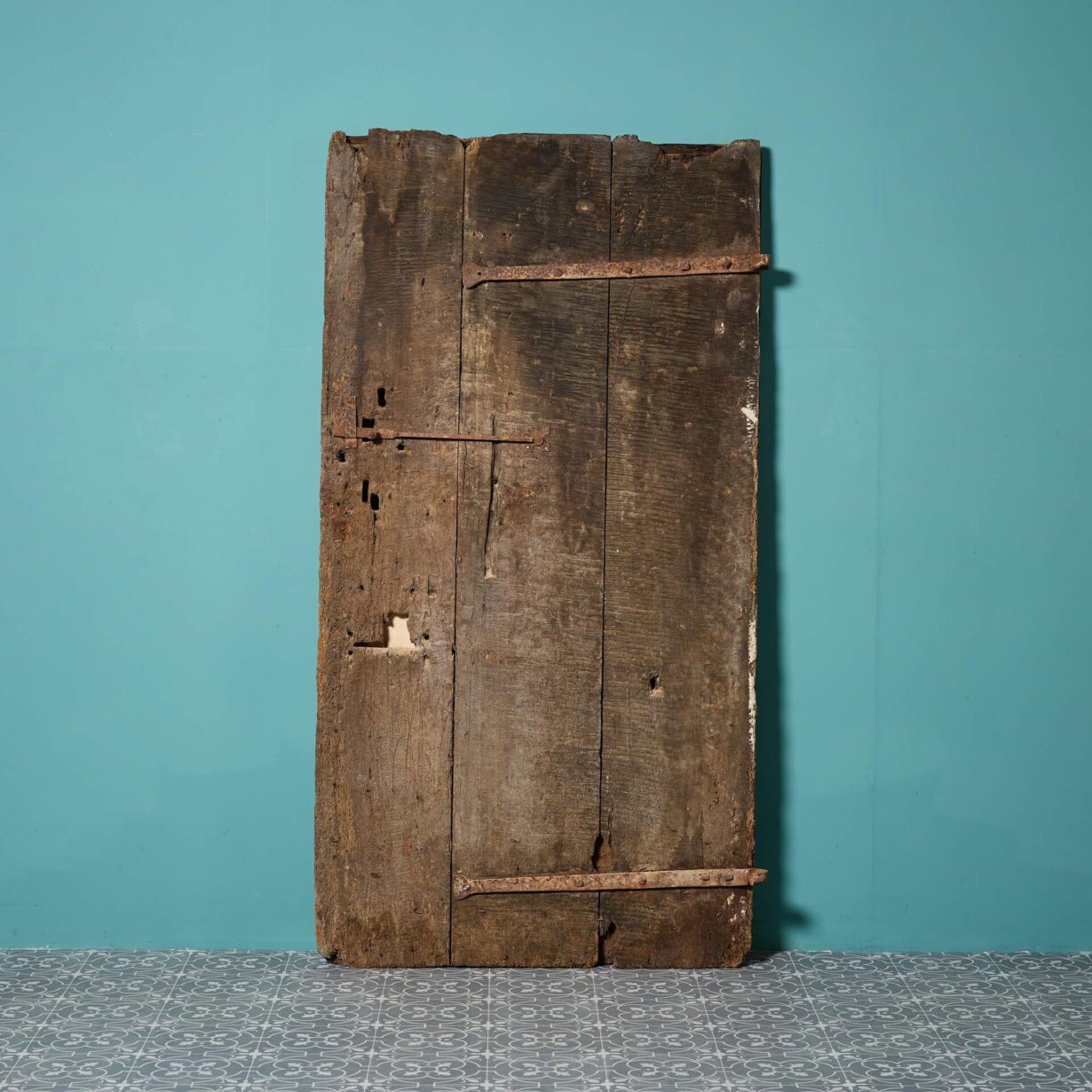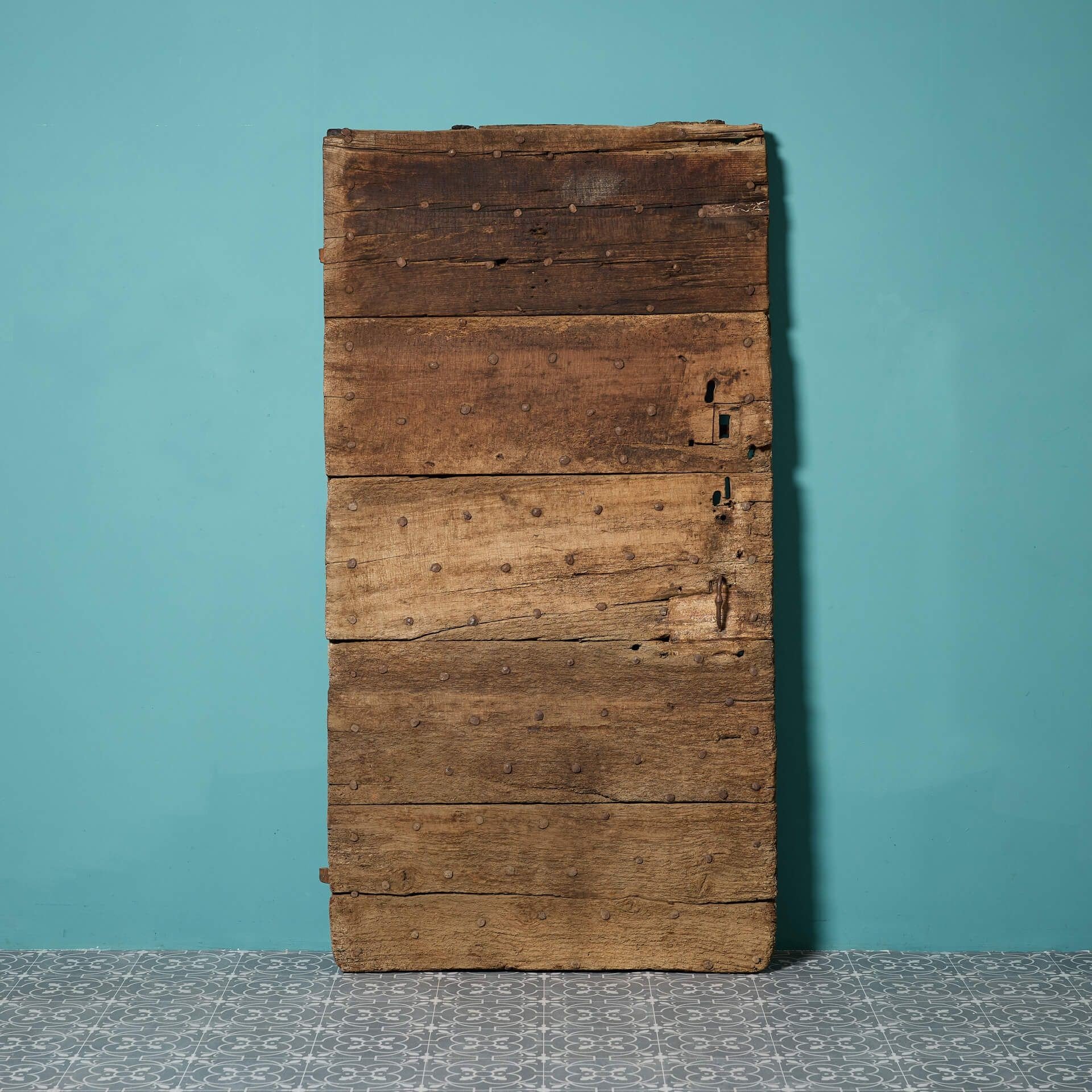 Thick and sturdy, it features original iron hinges and stud work, complimented by an old oak finish to one side and a lime wash to the other.