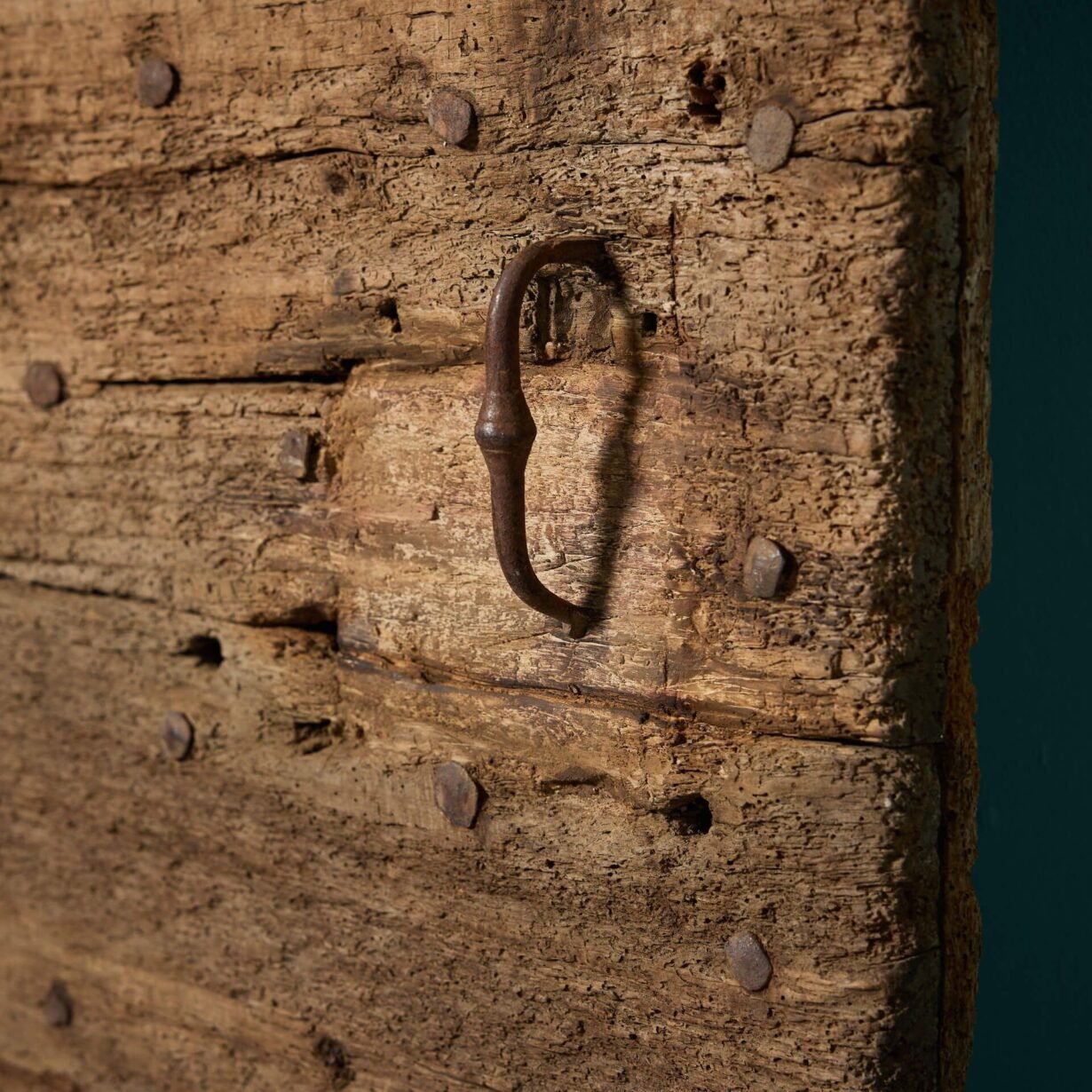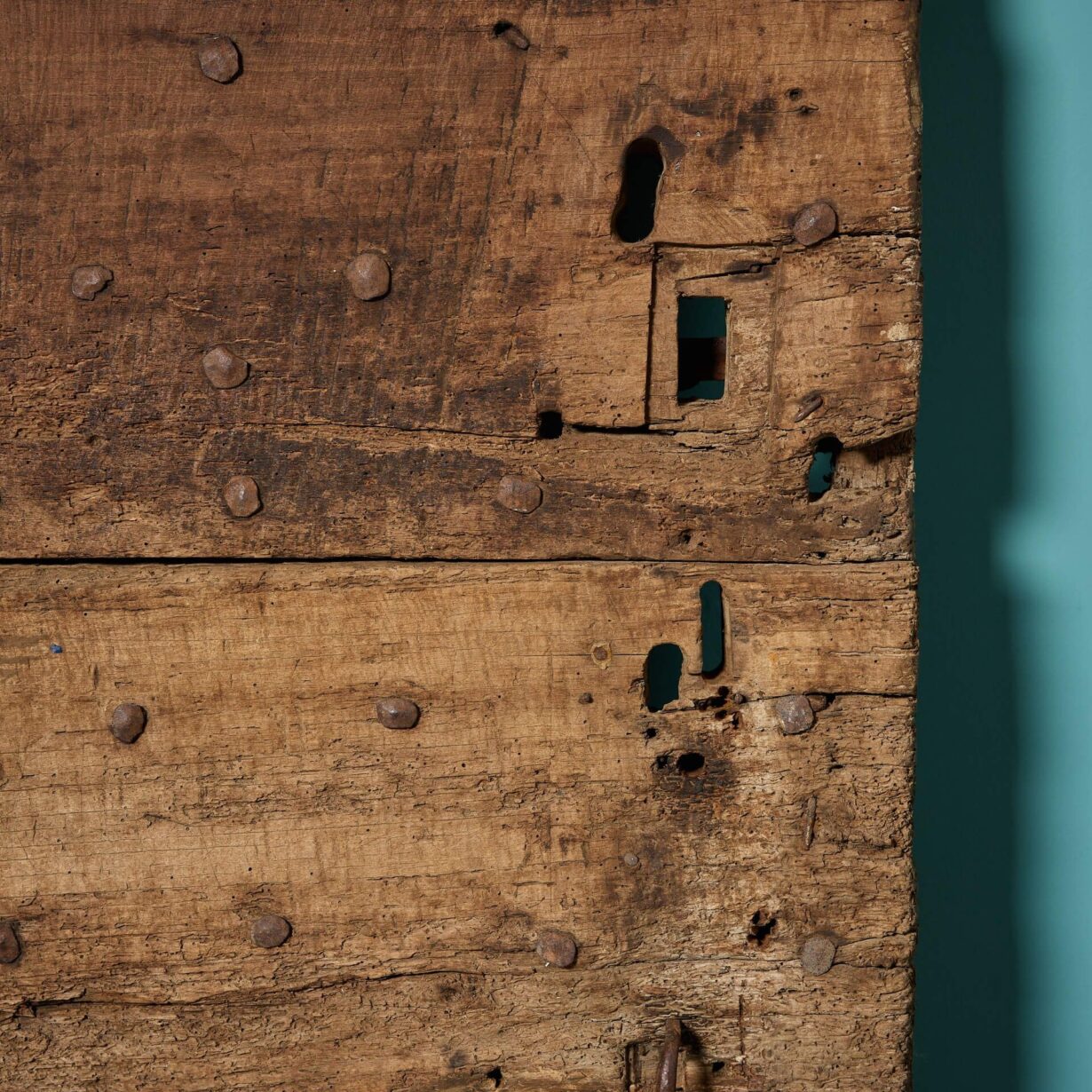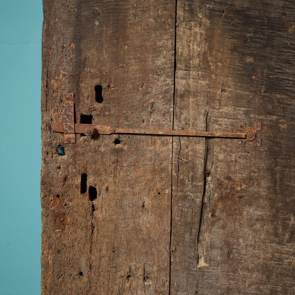 Thick and sturdy, it features original iron hinges and stud work, complimented by an old oak finish to one side and a lime wash to the other.