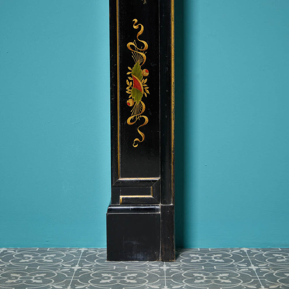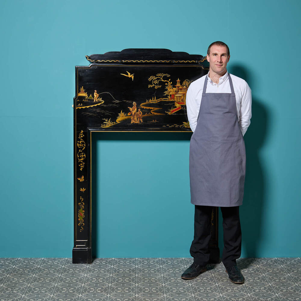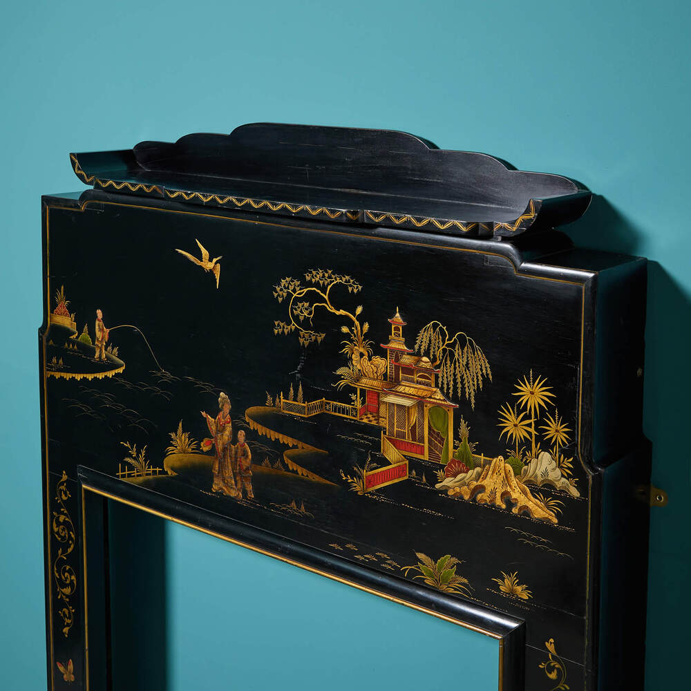 back to topA large and very rare antique fireplace circa 1900, beautifully handpainted in black with golden chinoiserie figures, buildings and embellishments.