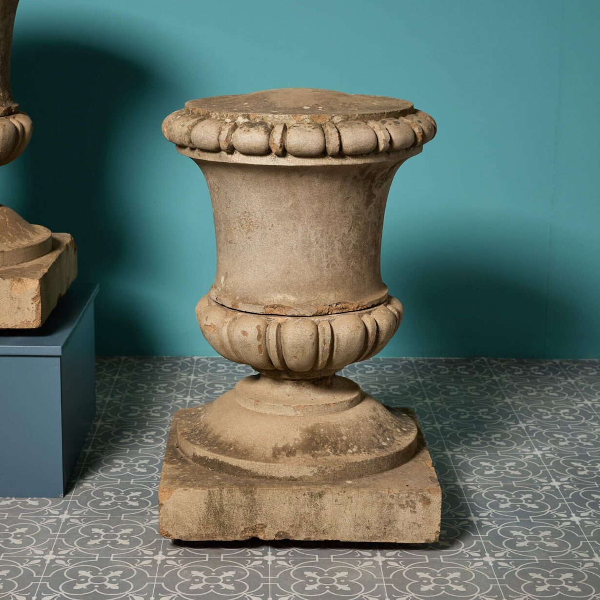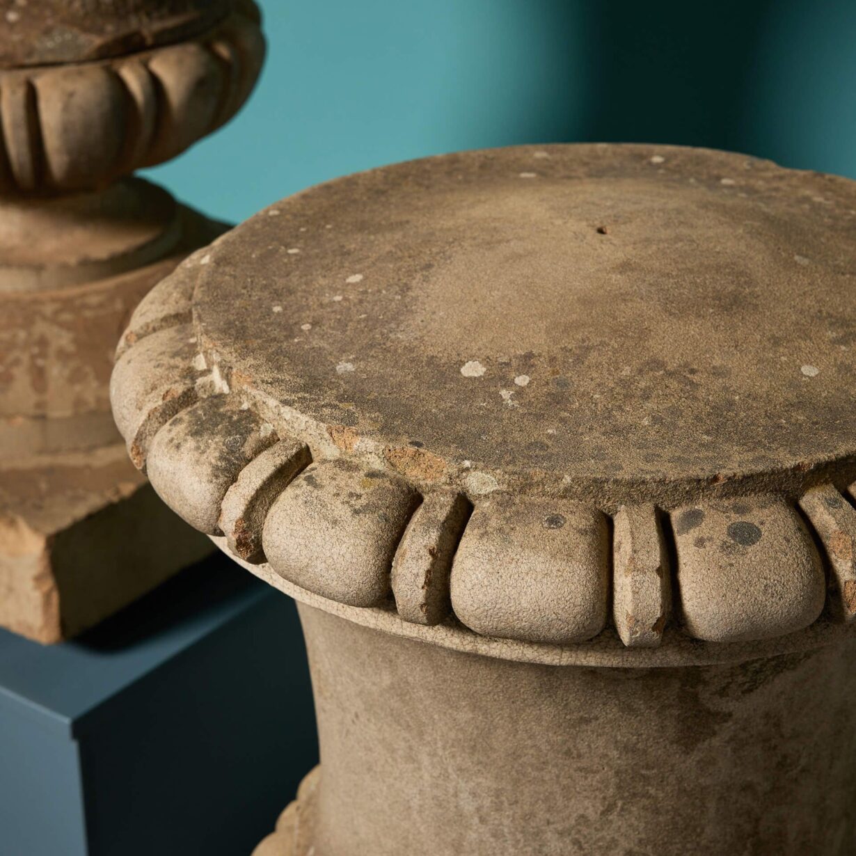 back to topA pair of large scale lidded composition stone urn finials.