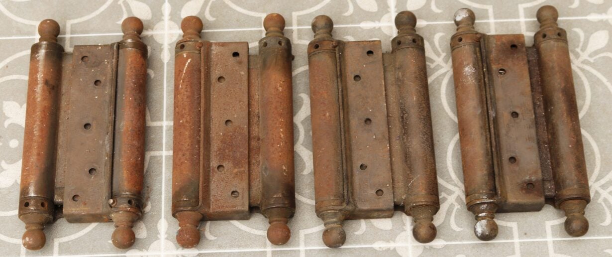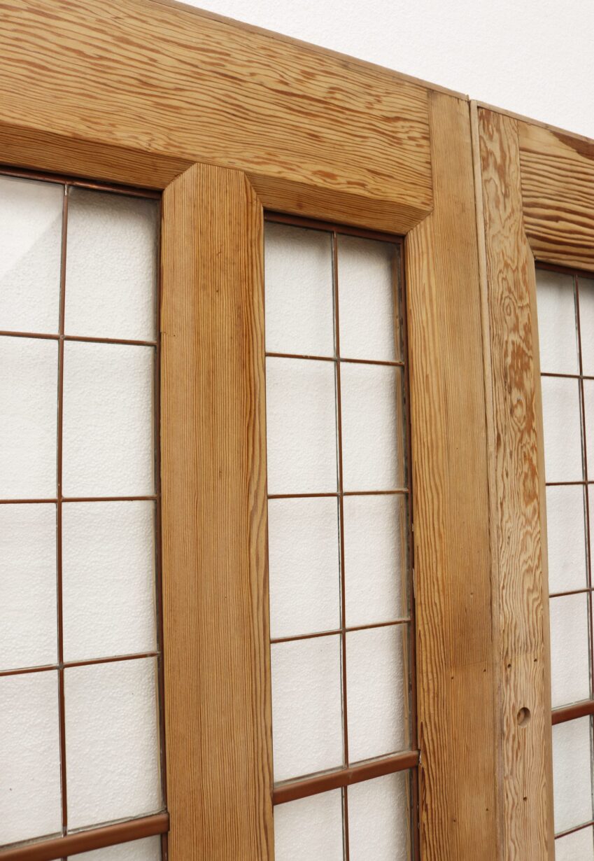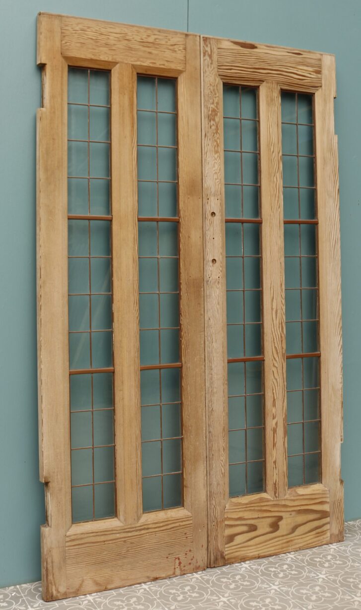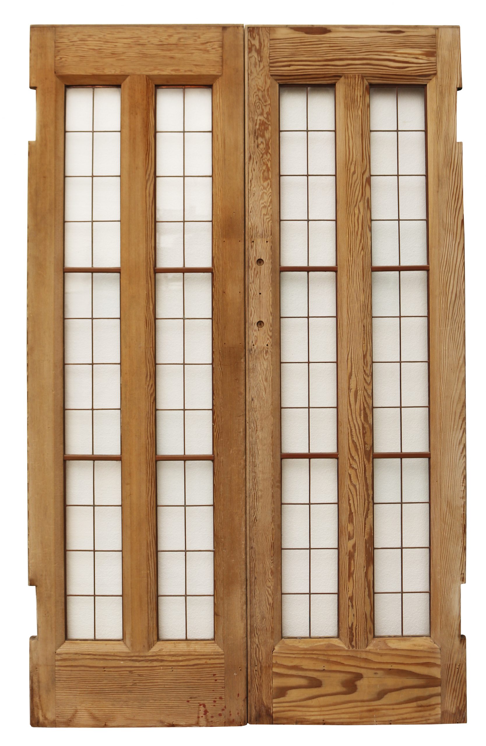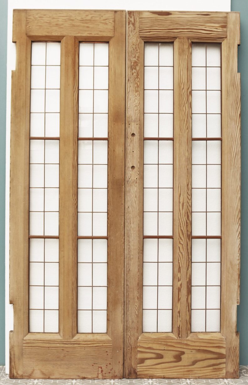 Good structural condition. These doors have been stripped and sanded to a natural wood finish. Originally these doors were fitted with swing hinges, included.