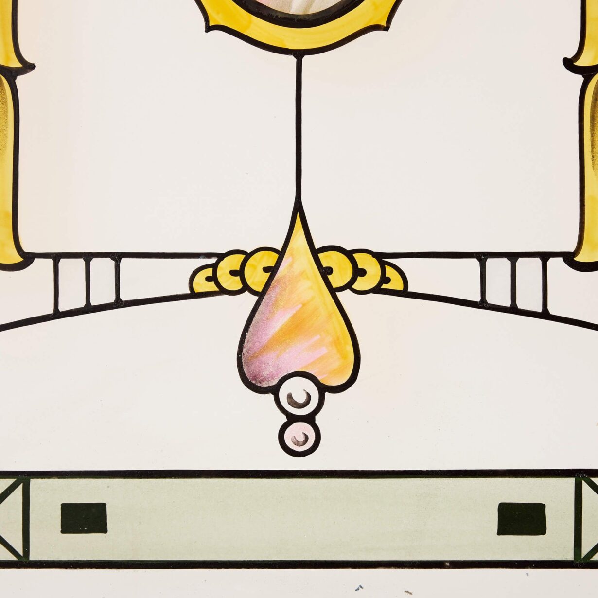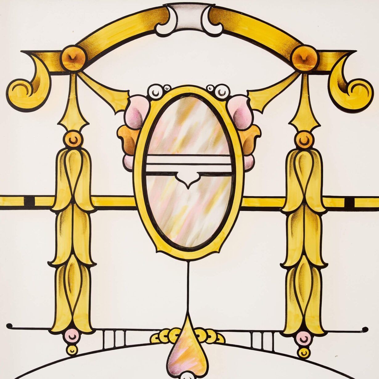 The design is evocative of styling typical of the Art Nouveau period, stained with shades of pale green, pink and vibrant gold, and elegantly etched with intricate arched lines and organic stylised patterns.