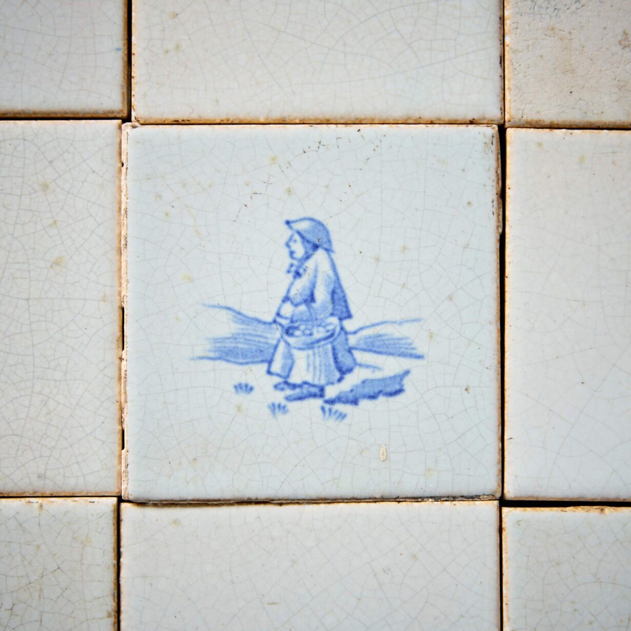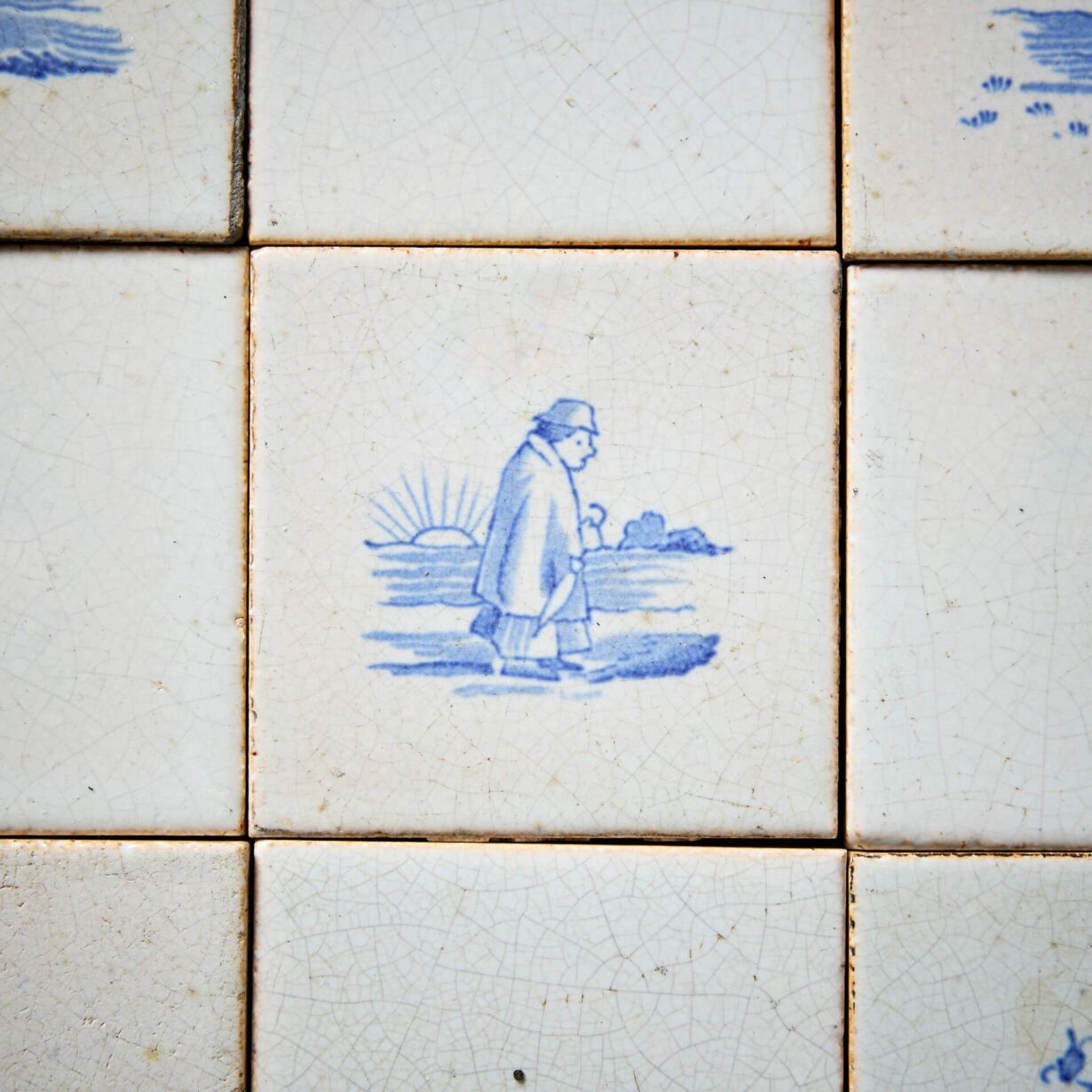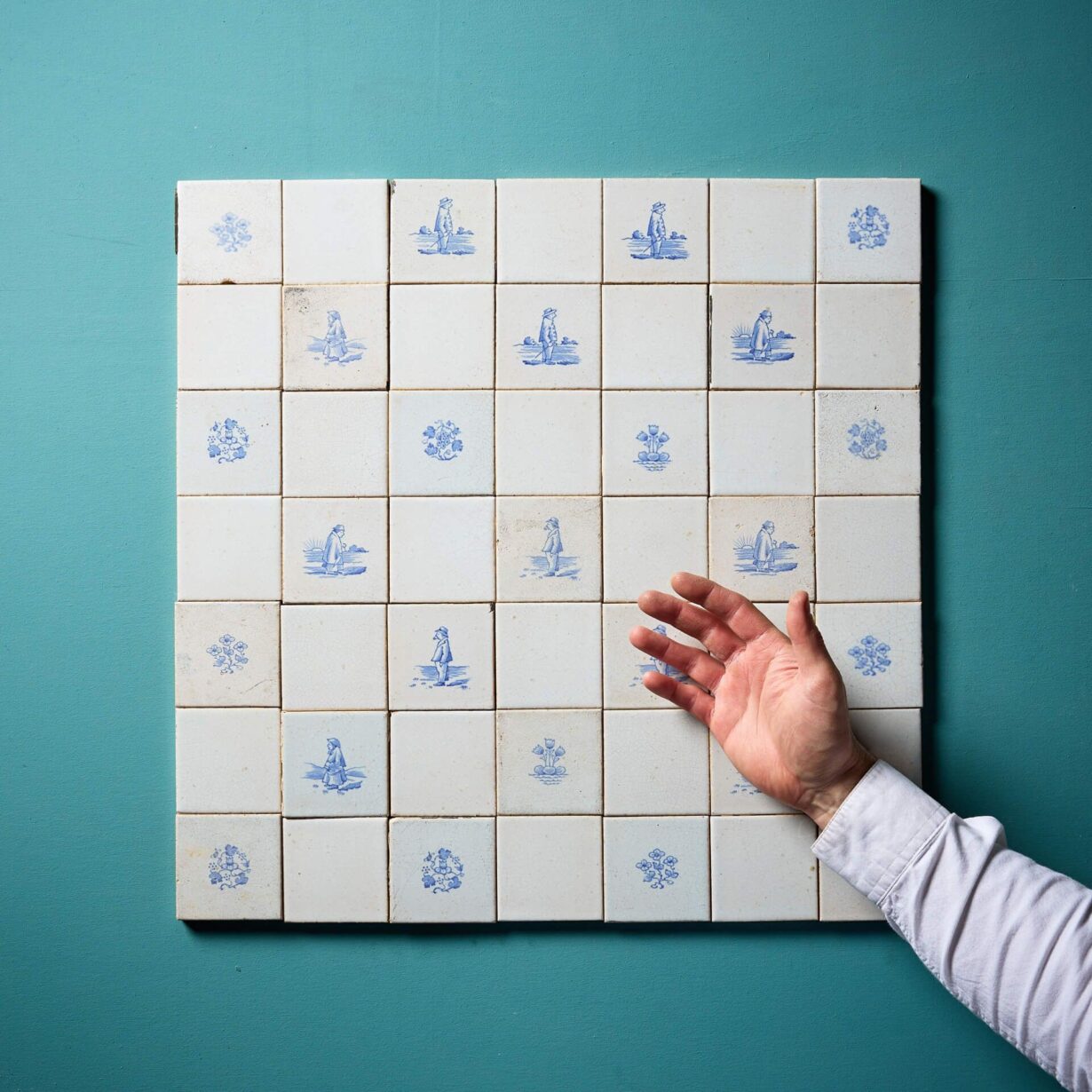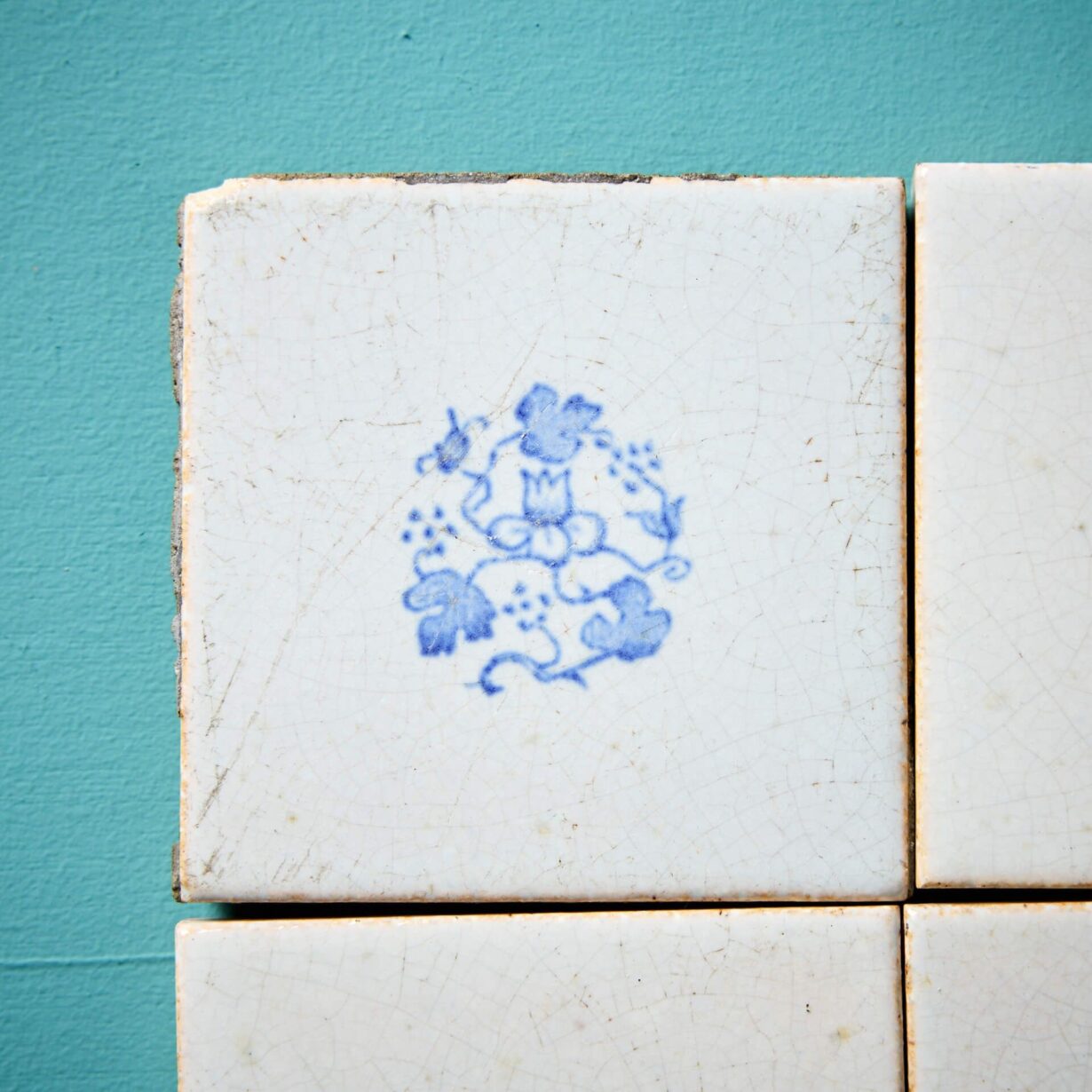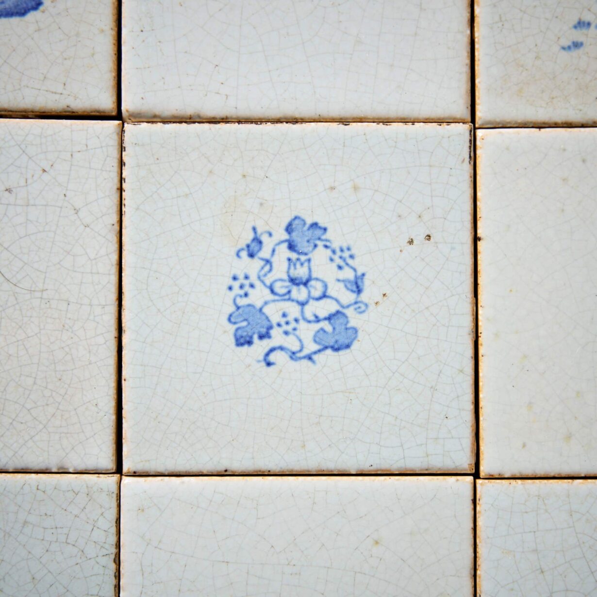 Dating from circa 1920, these reclaimed 3 inch fireplace tiles showcase a smooth white colour detailed with various blue scenes of figures and floral designs incorporating Victorian and Georgian styles.
