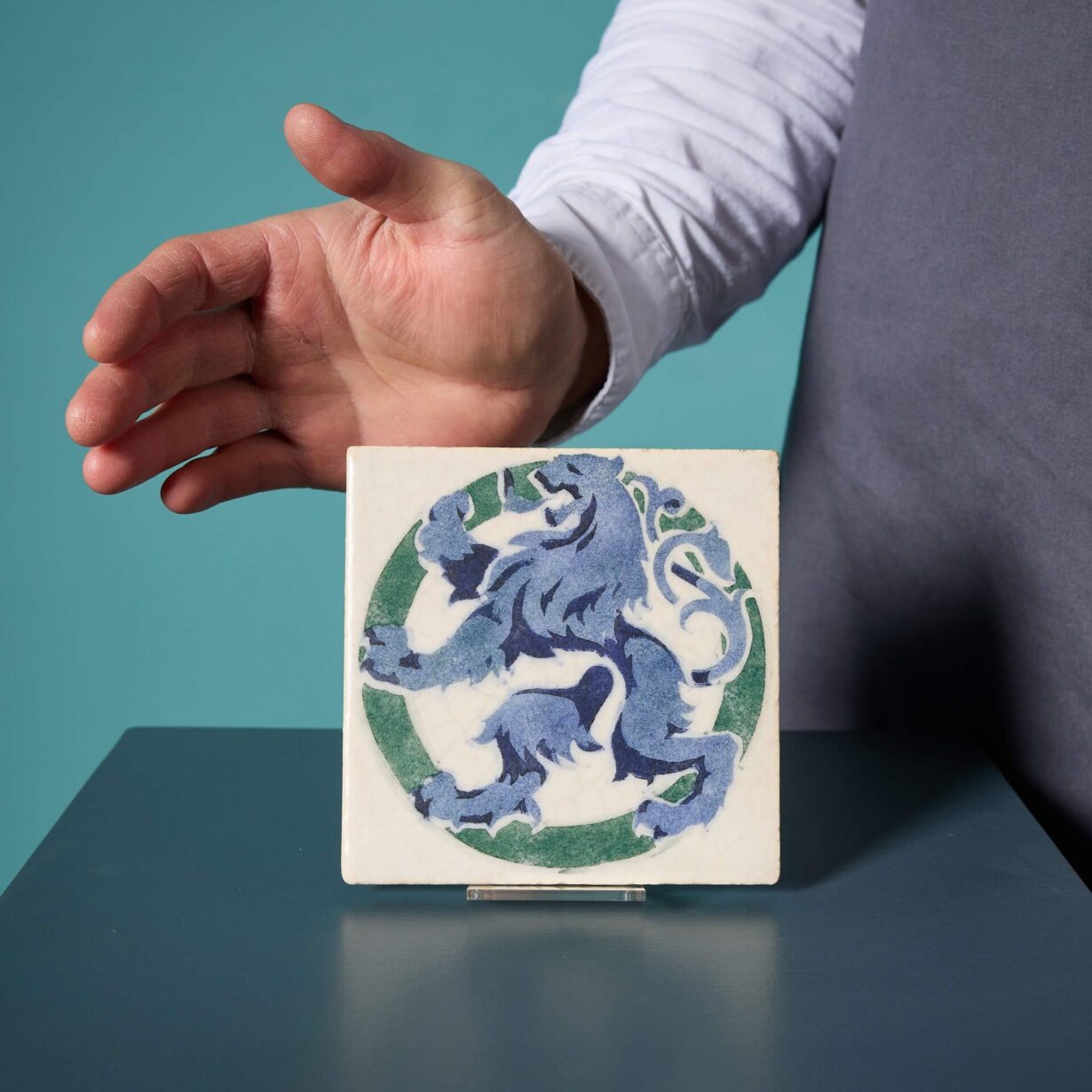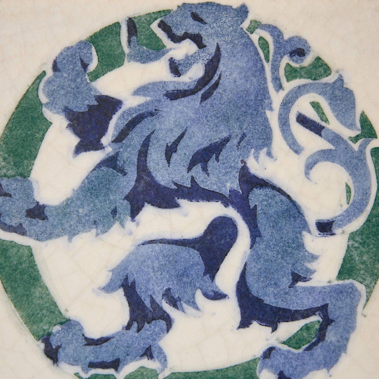 Detailing a hand painted stylised blue lion within a green wreath before an off-white background, this 5 inch collectors tile is a stunning decorative interior piece for display or part of a collector’s cabinet.