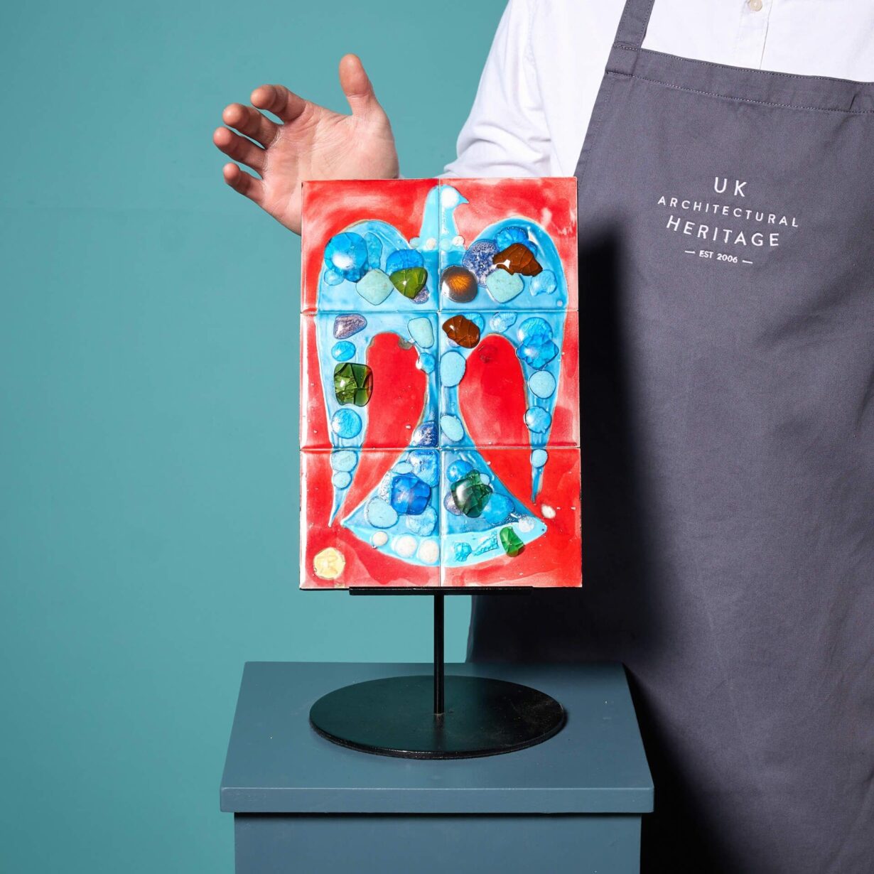 This panel is impressively decorated with glass fusion to depict a striking stylised dove on a vibrant red background, backed onto board and mounted on a custom made steel display stand – such craftsmanship has created a unique and impressive display piece perfect for a sideboard or wall decoration.