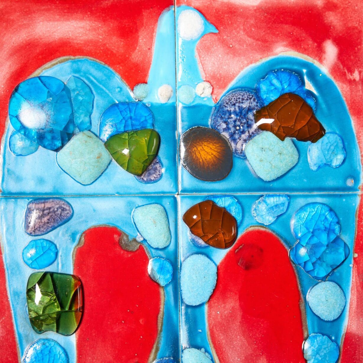 This tile panel was a part of a larger project once housed in Swanage library, a town on the south coast of England where Russell set up the Purbeck Pottery at just 20 years old, after training at the Poole College of Art.