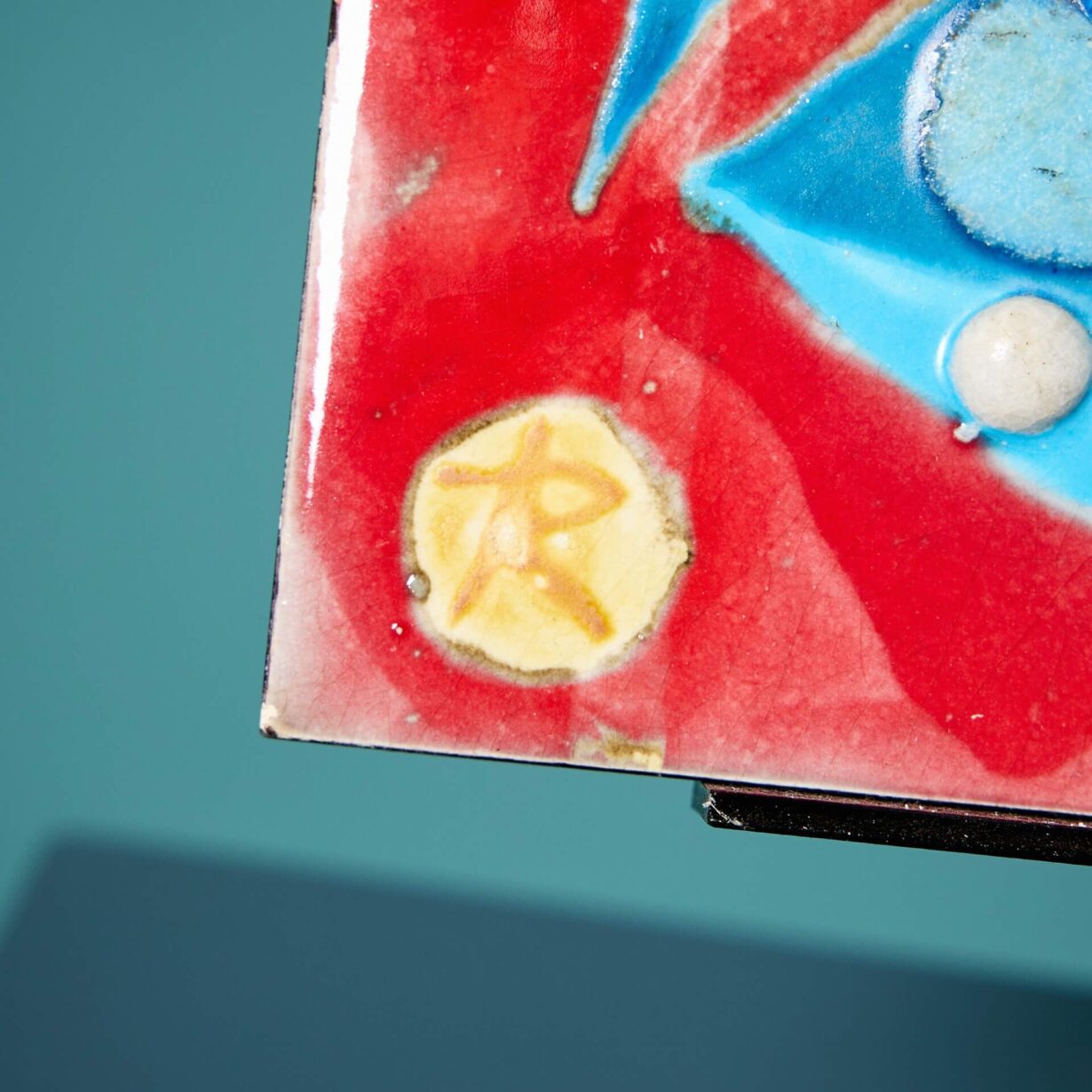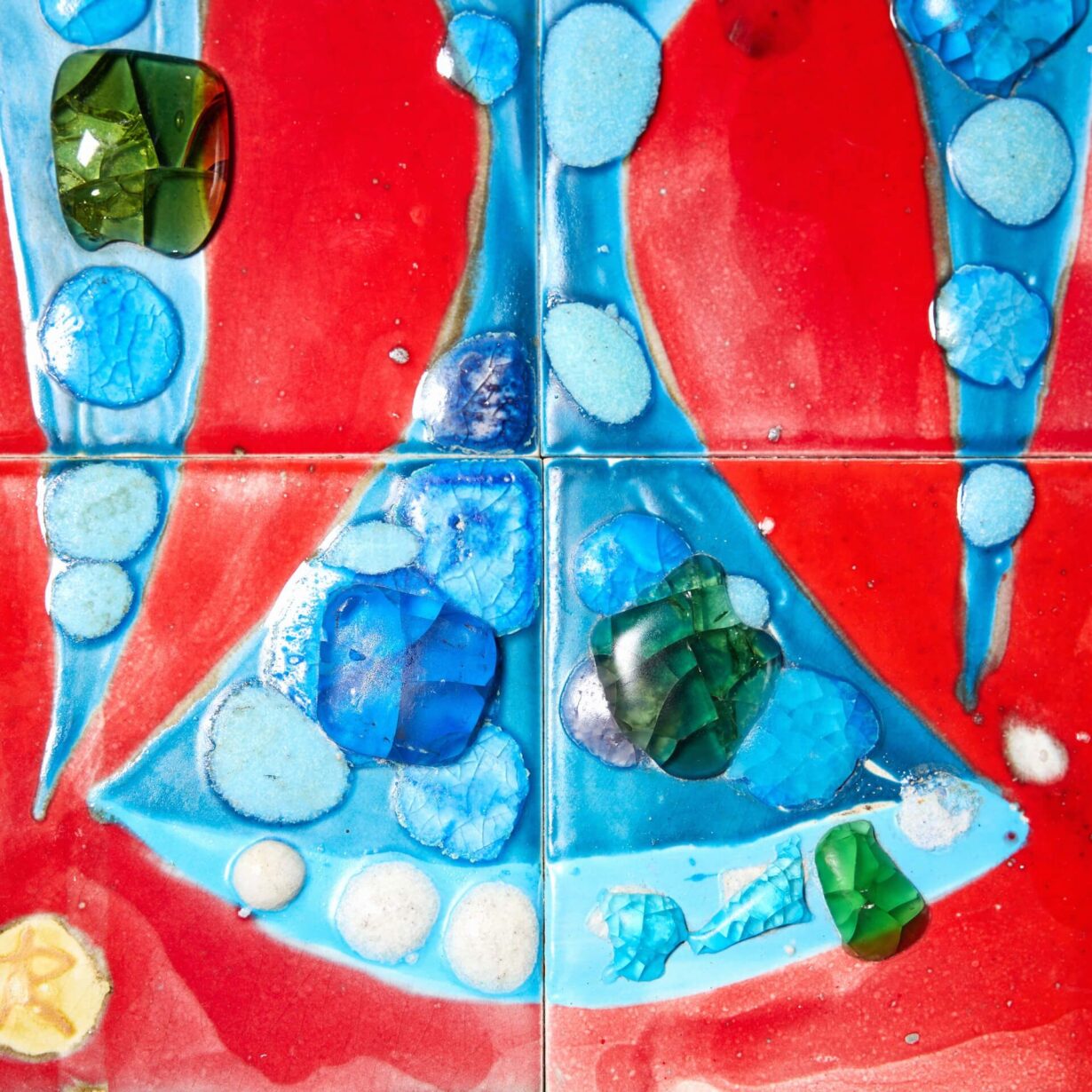 But he didn’t stop there…the entrepreneurial ceramicist later travelled to Barbados and started the Christopher Russell Pottery with the backing of the Barbados Development Board, where he often incorporated sea-washed glass into glazed ceramic tiles, much like this one.