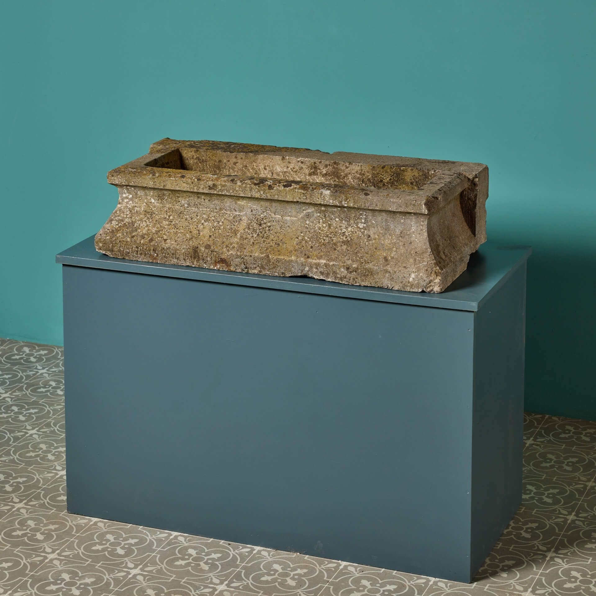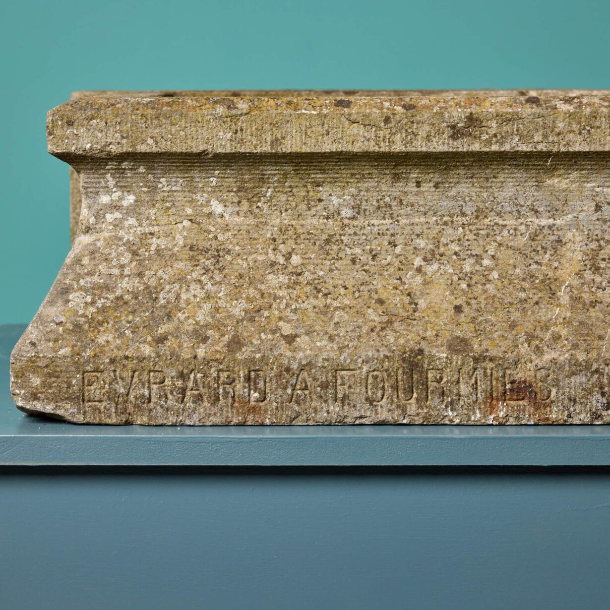back to topA reclaimed French stone trough carved with a makers mark across to the bottom left of the front: ‘Evrard A Fourmies’.