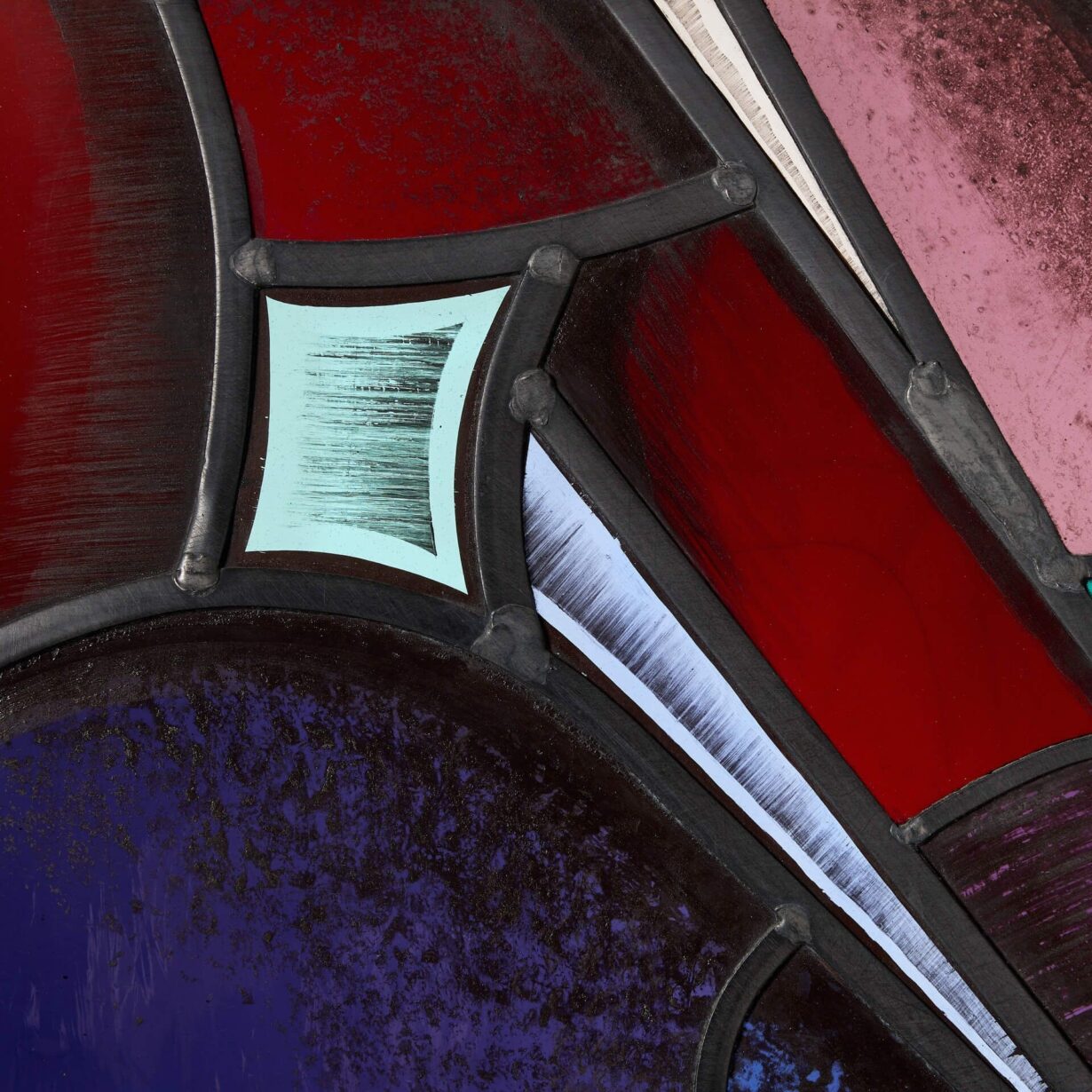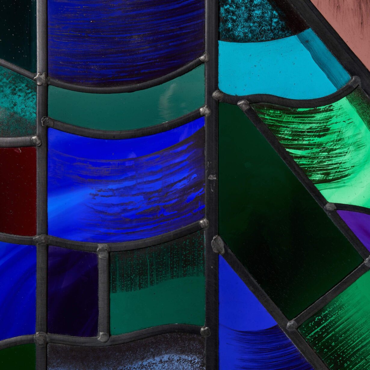 This is an abstract stained glass window in an unusual modern style, blending together a range of vivid and bright colours, such as purples, blues and green, displayed in various shapes and patterns.
