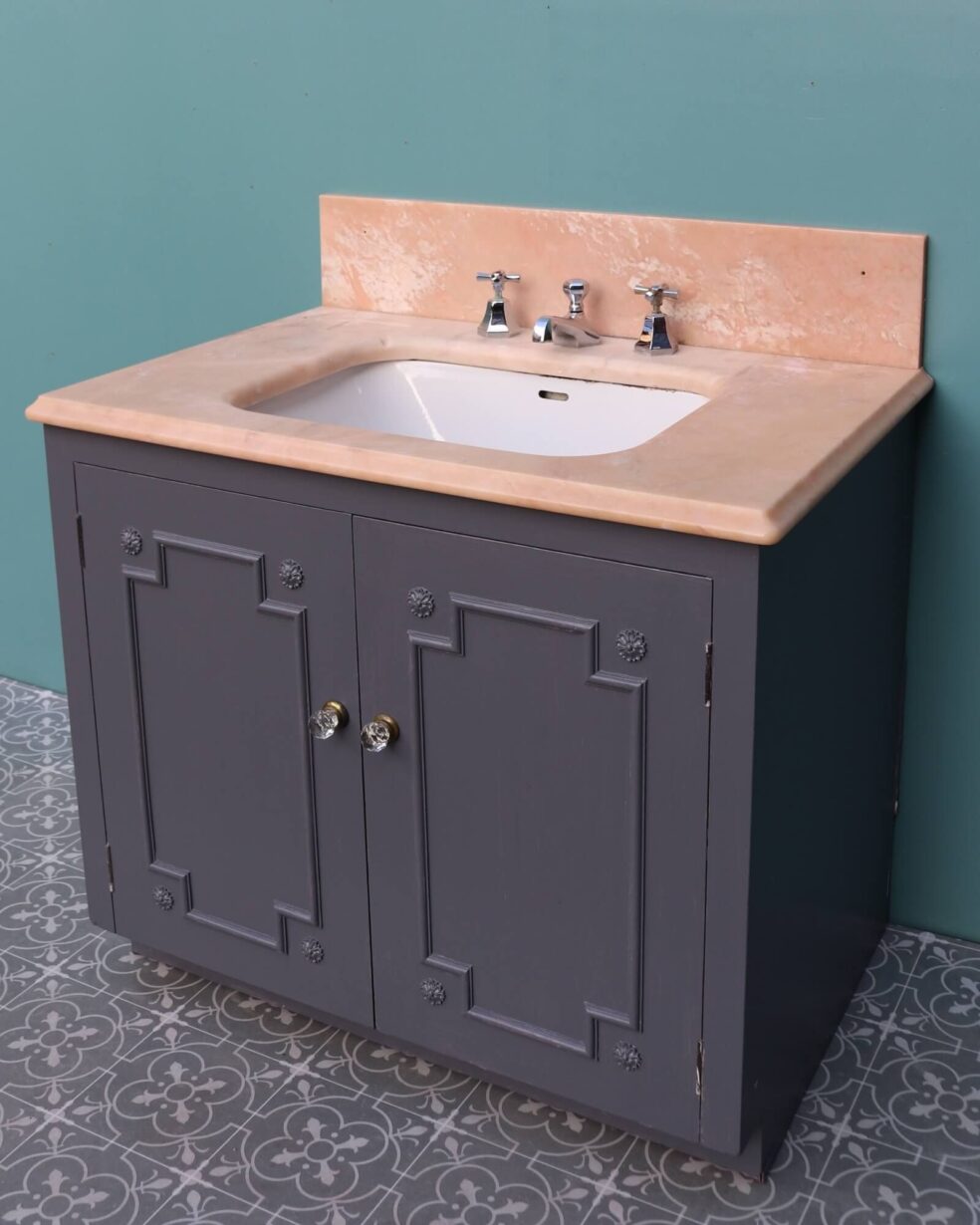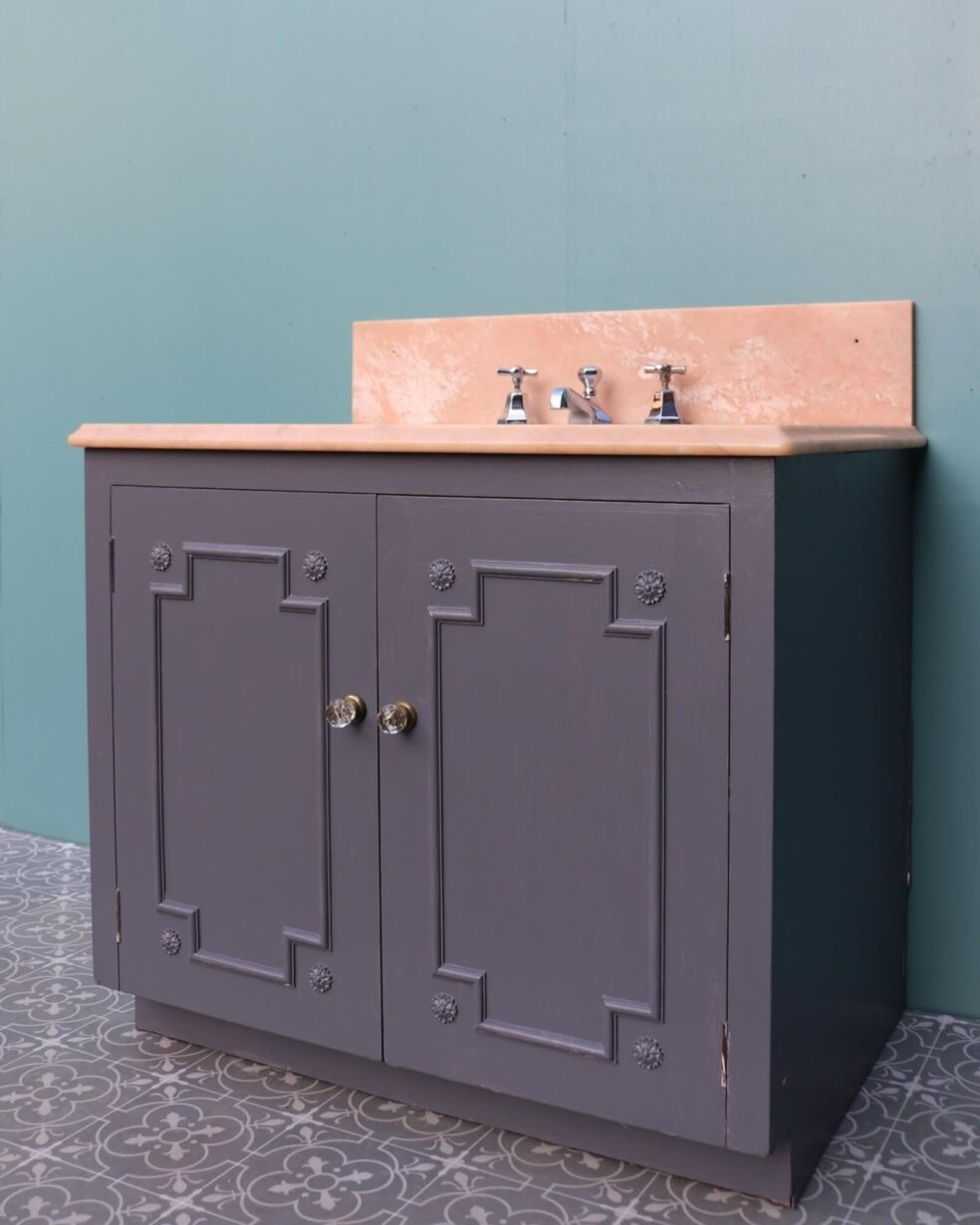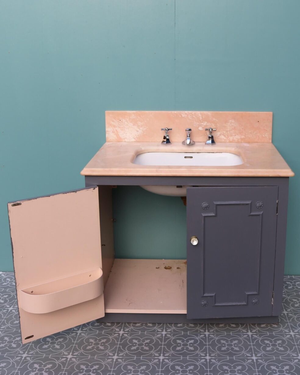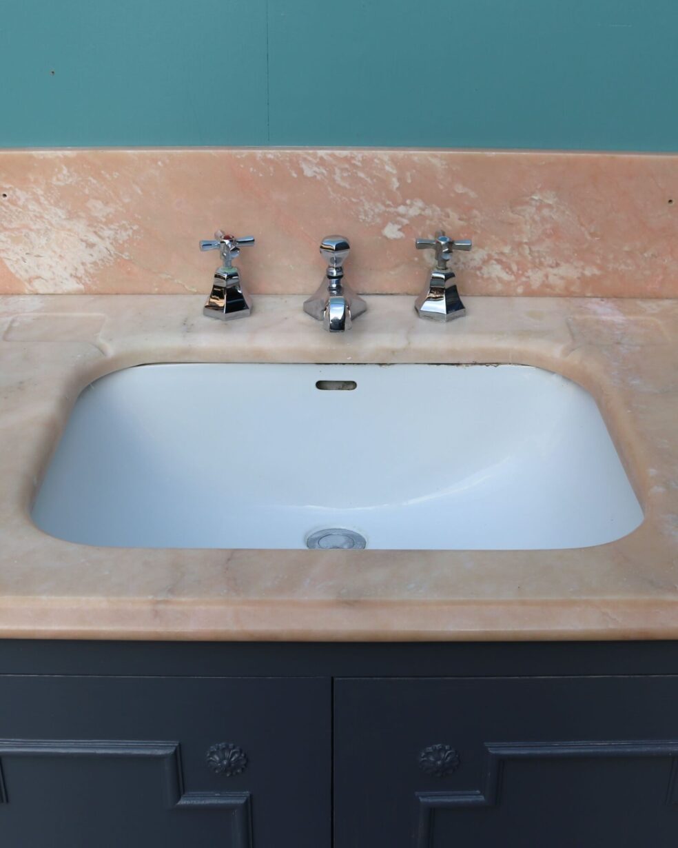 back to topReclaimed from a property in Haywards Heath near Brighton, this marble sink with cabinet is an impressive feature for a mid-century or Art Deco style bathroom. It comprises of a 1950s peach marble sink by John Bolding and Sons – 19th and 20th century manufacturers of high-class sanitary wares – above an under-counter porcelain wash basin with original chrome mixer taps. The marble surface and porcelain sink sit above a wooden 2-door cabinet with decorative moulding to the front, primed and ready for finishing in a desired colour to fit your interior vision.