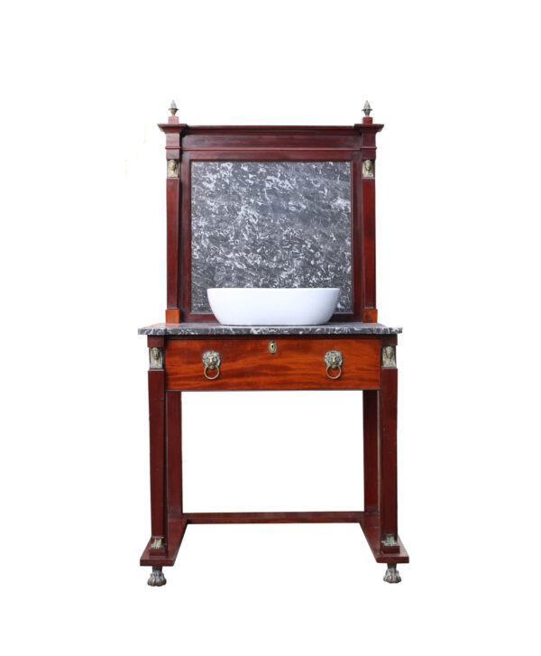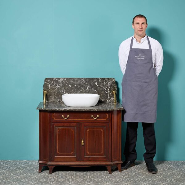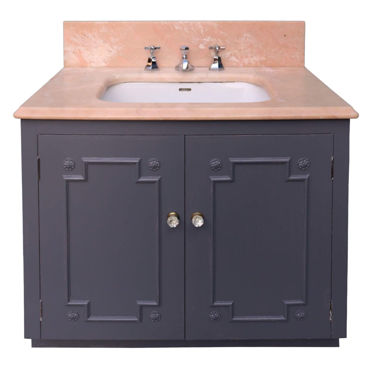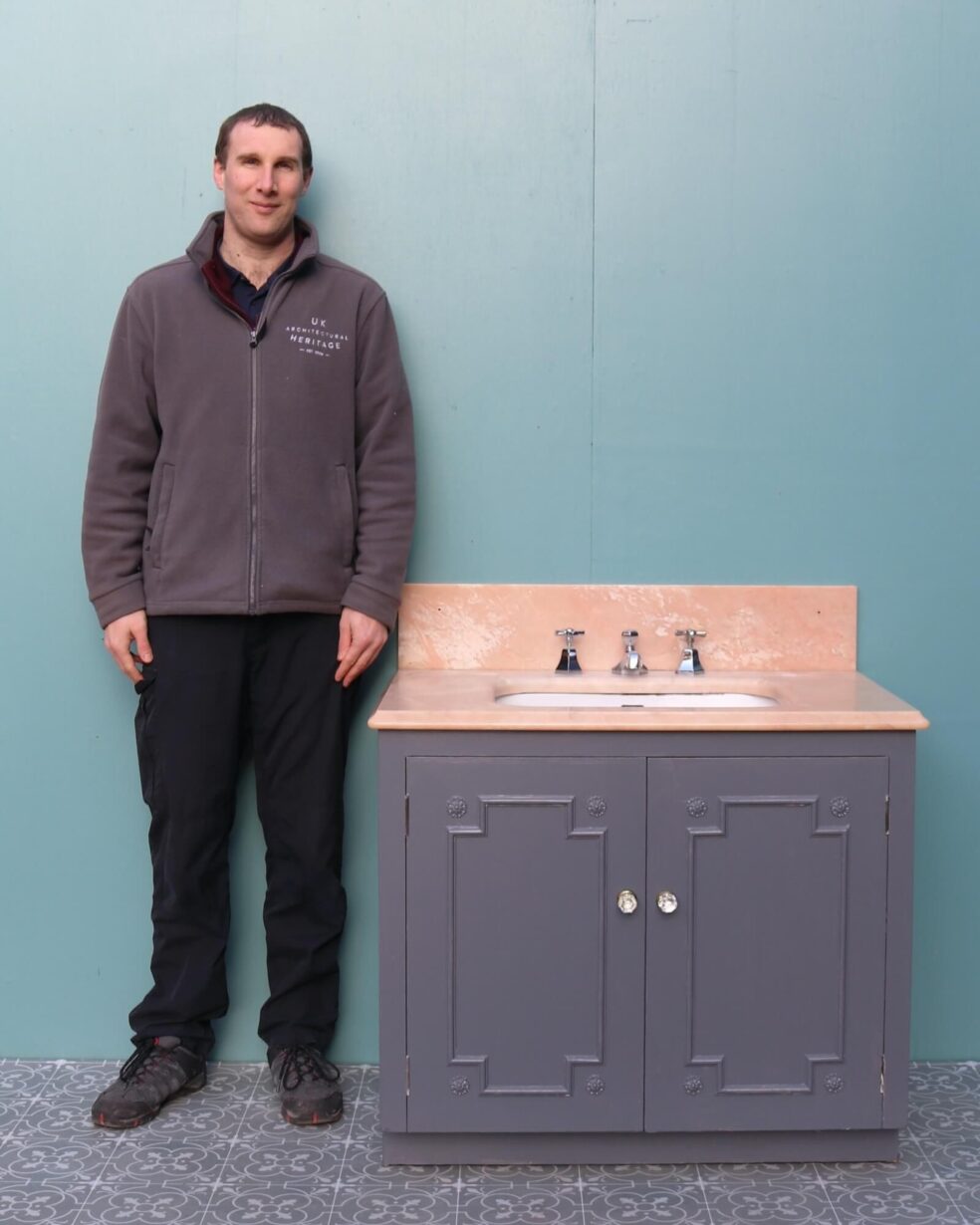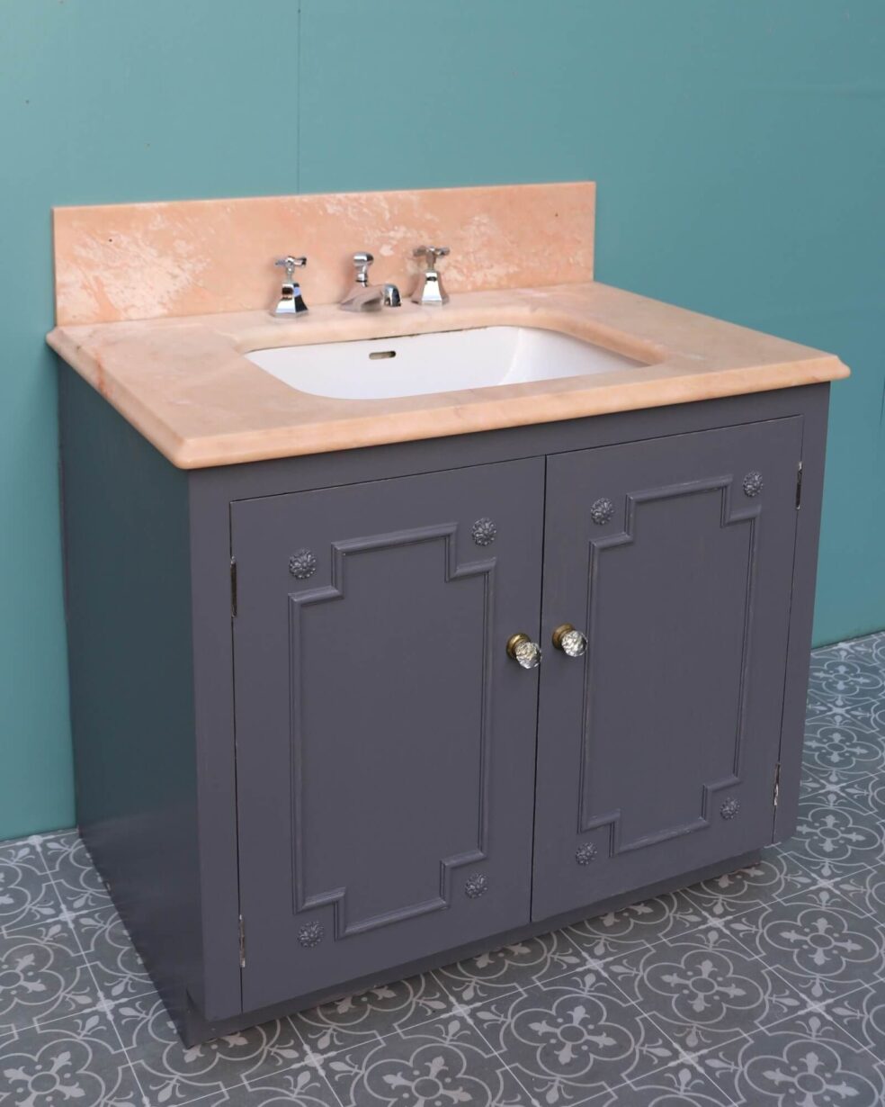 back to topReclaimed from a property in Haywards Heath near Brighton, this marble sink with cabinet is an impressive feature for a mid-century or Art Deco style bathroom. It comprises of a 1950s peach marble sink by John Bolding and Sons – 19th and 20th century manufacturers of high-class sanitary wares – above an under-counter porcelain wash basin with original chrome mixer taps. The marble surface and porcelain sink sit above a wooden 2-door cabinet with decorative moulding to the front, primed and ready for finishing in a desired colour to fit your interior vision.