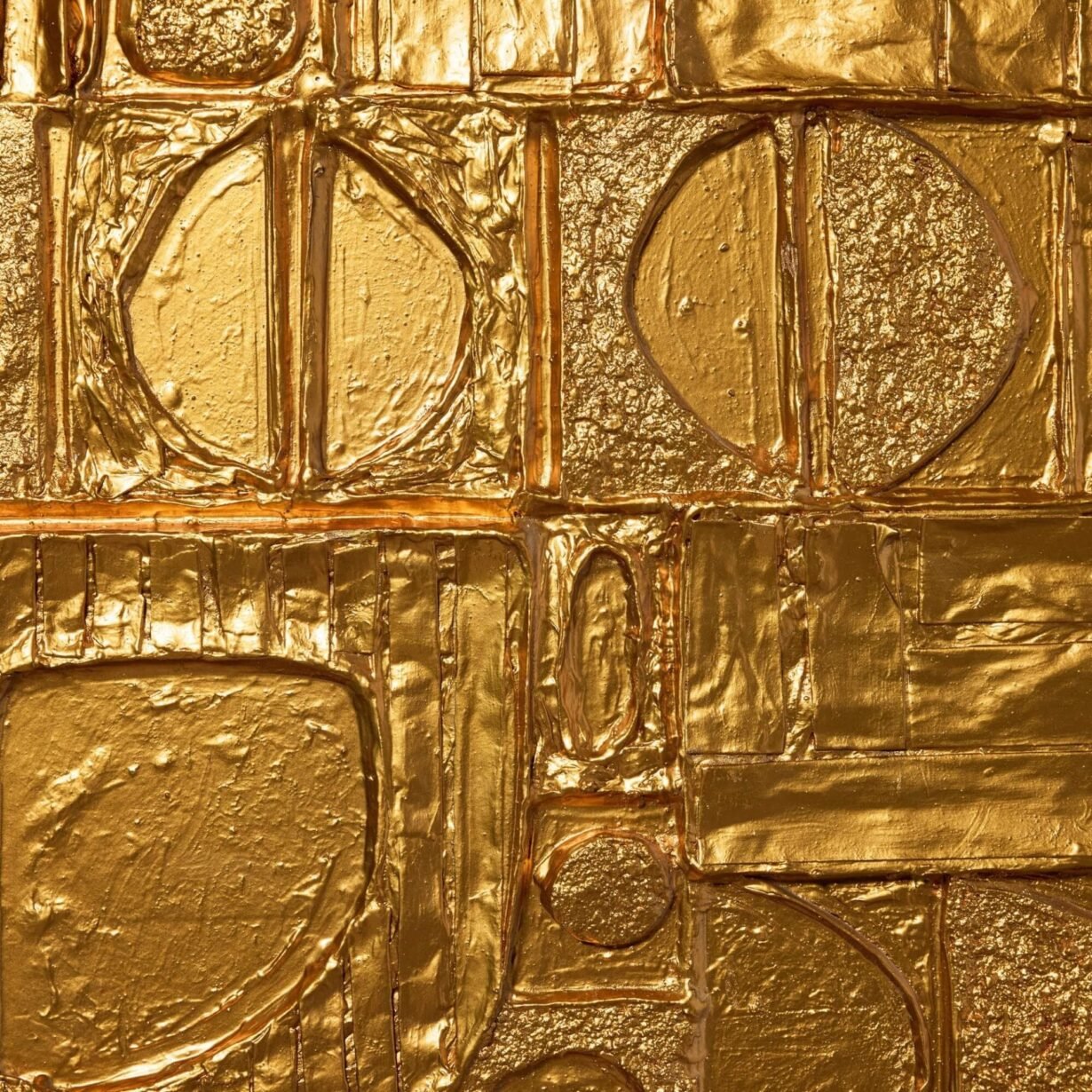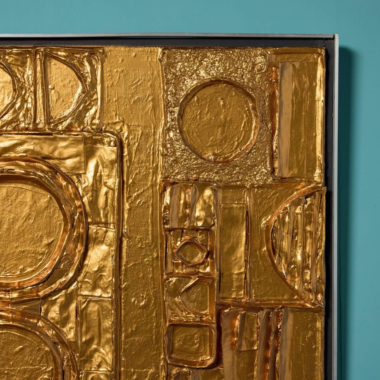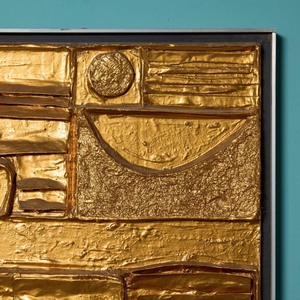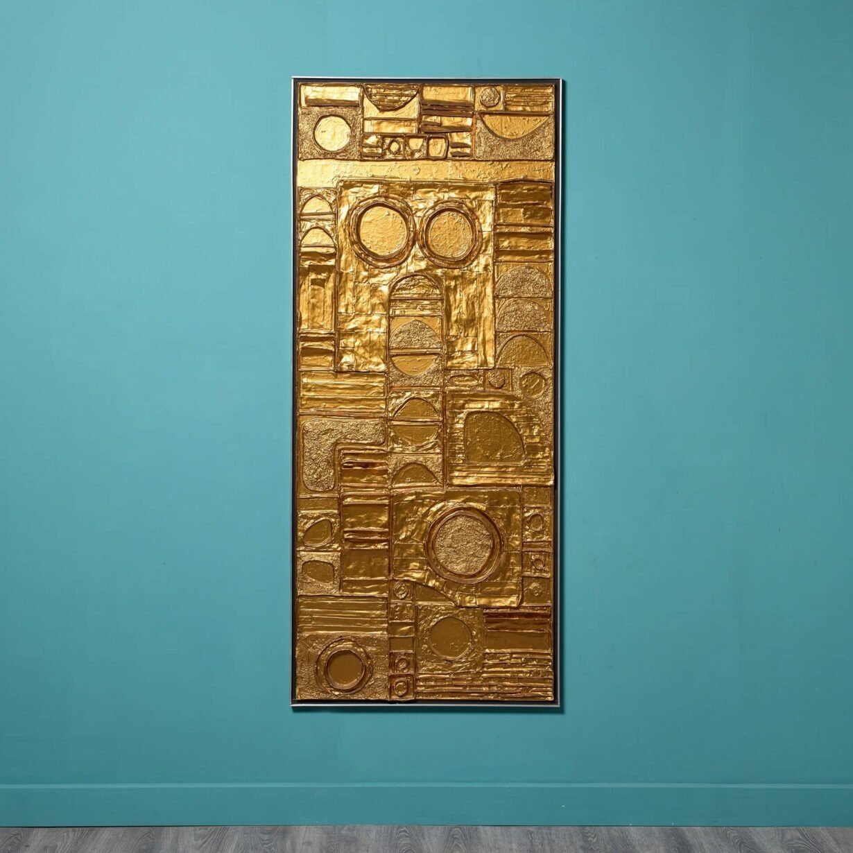 back to topA reclaimed mid century modern abstract wall art. This abstract modernist artwork piece creates an impact with its intricate, handcrafted design and unusual geometric shapes worked in relief, all finished in a vibrant gilt gold tone that catches the eye.