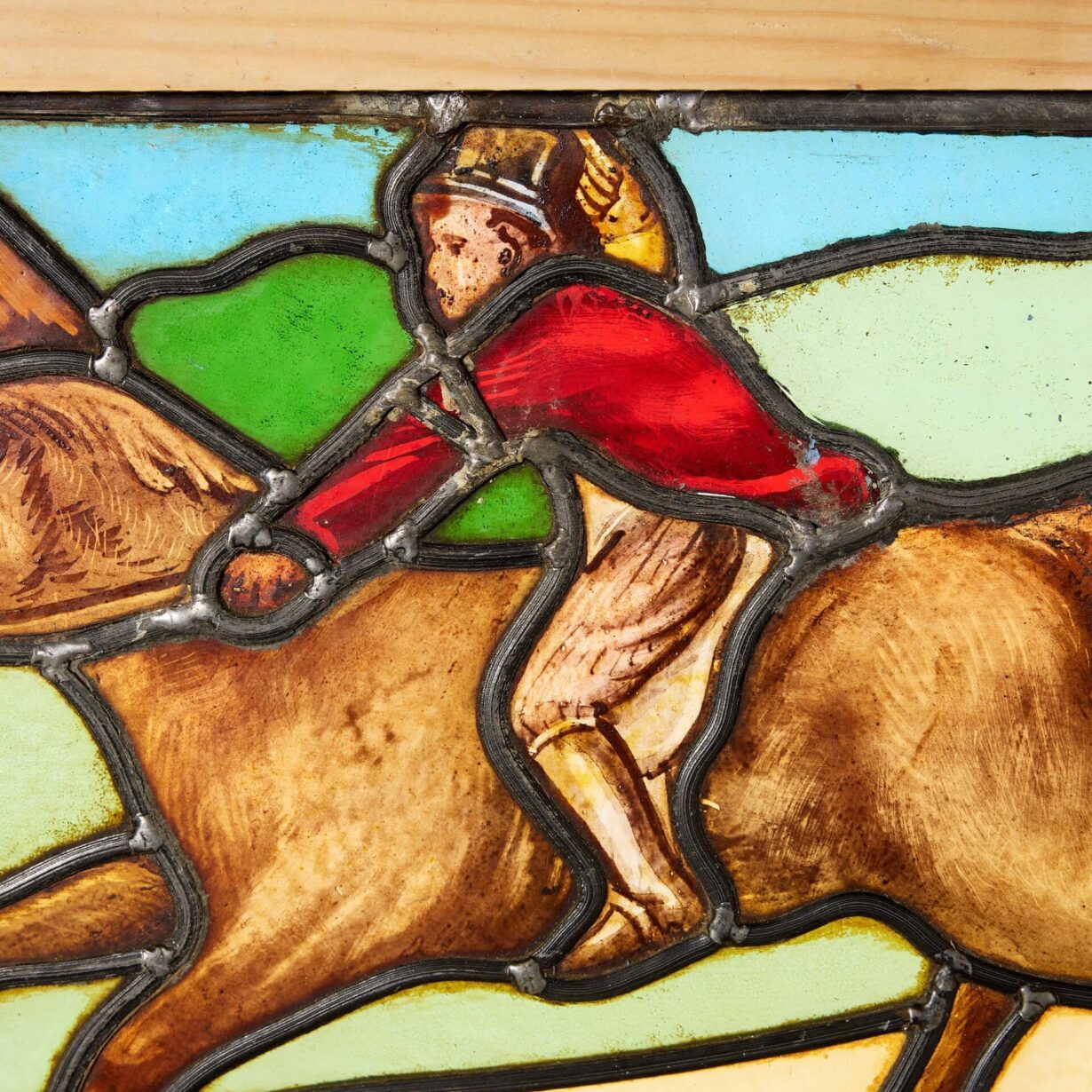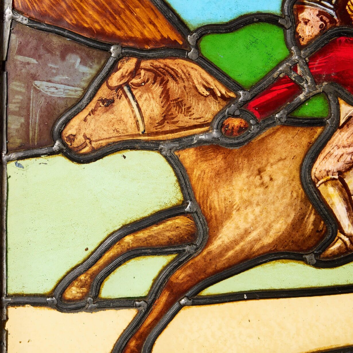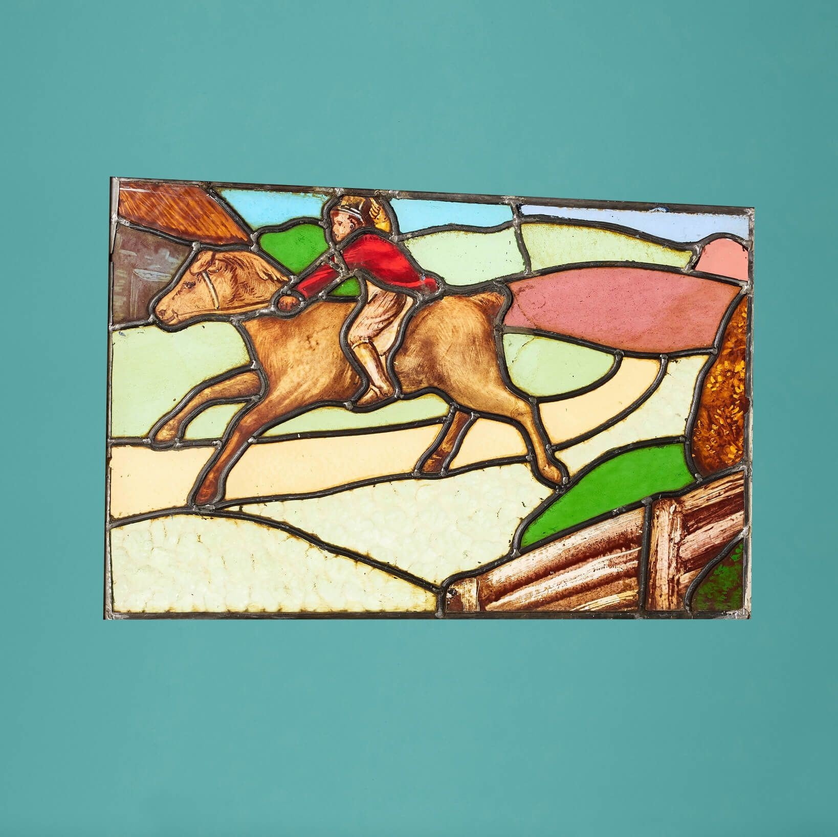 back to topA vibrant and colourful antique stained glass window depicting a horse and rider dressed in red; one of a series of early 20th century stained glass panels we are selling depicting scenes in the English countryside.