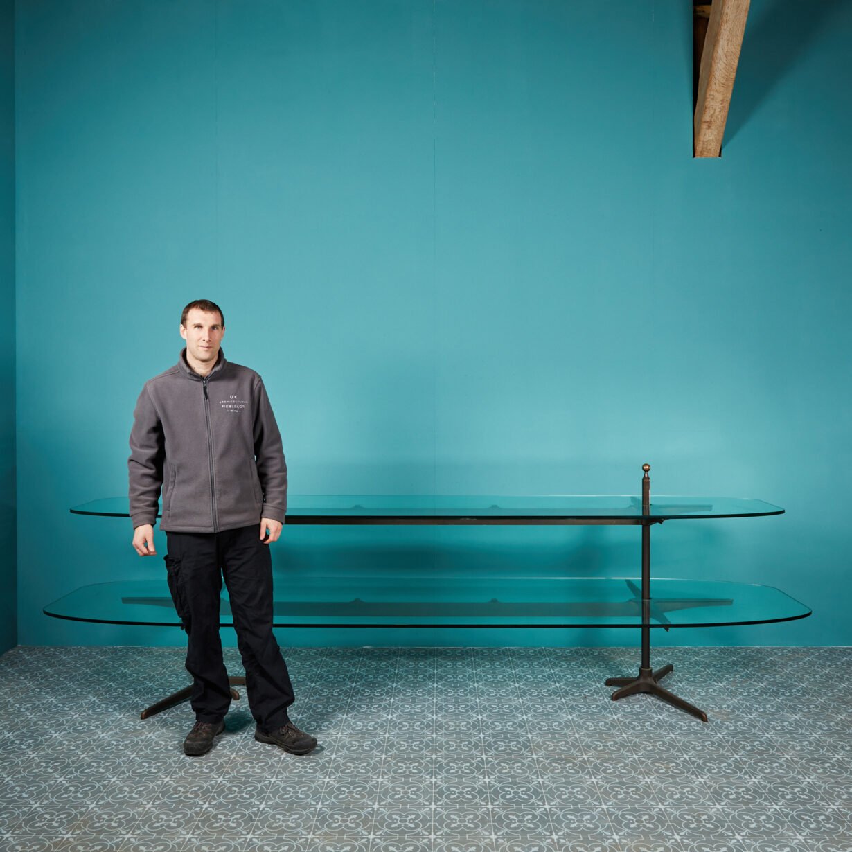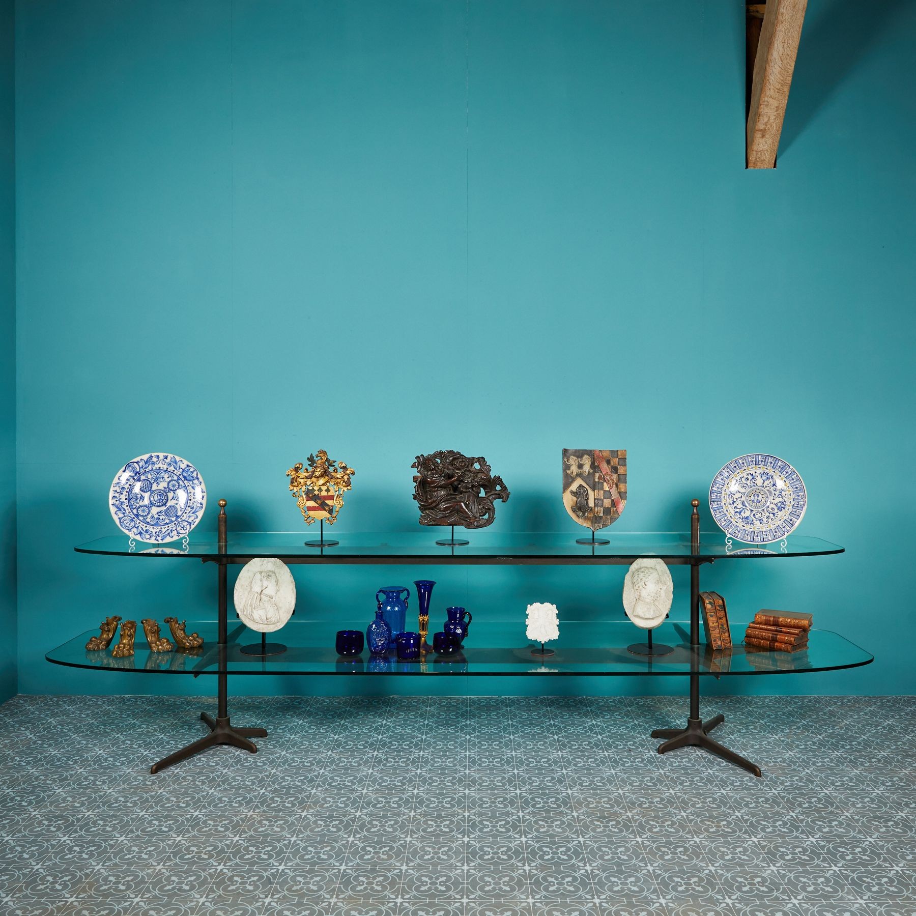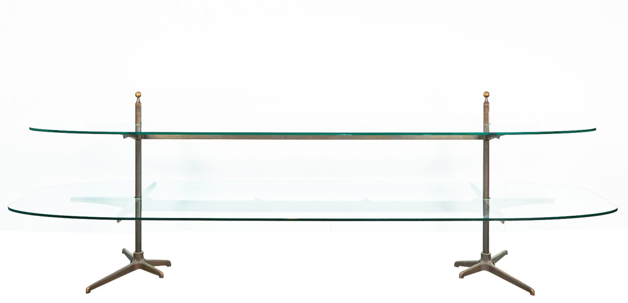 back to topReclaimed Tiered Glass Shop Display Stand. Bronze and Glass tiered shop display stand with what we believe is tempered glass. This is made up of six components. A beautiful bronze frame and two glass shelves in a 1930s-50s style. The stand features attractive ball finials.
