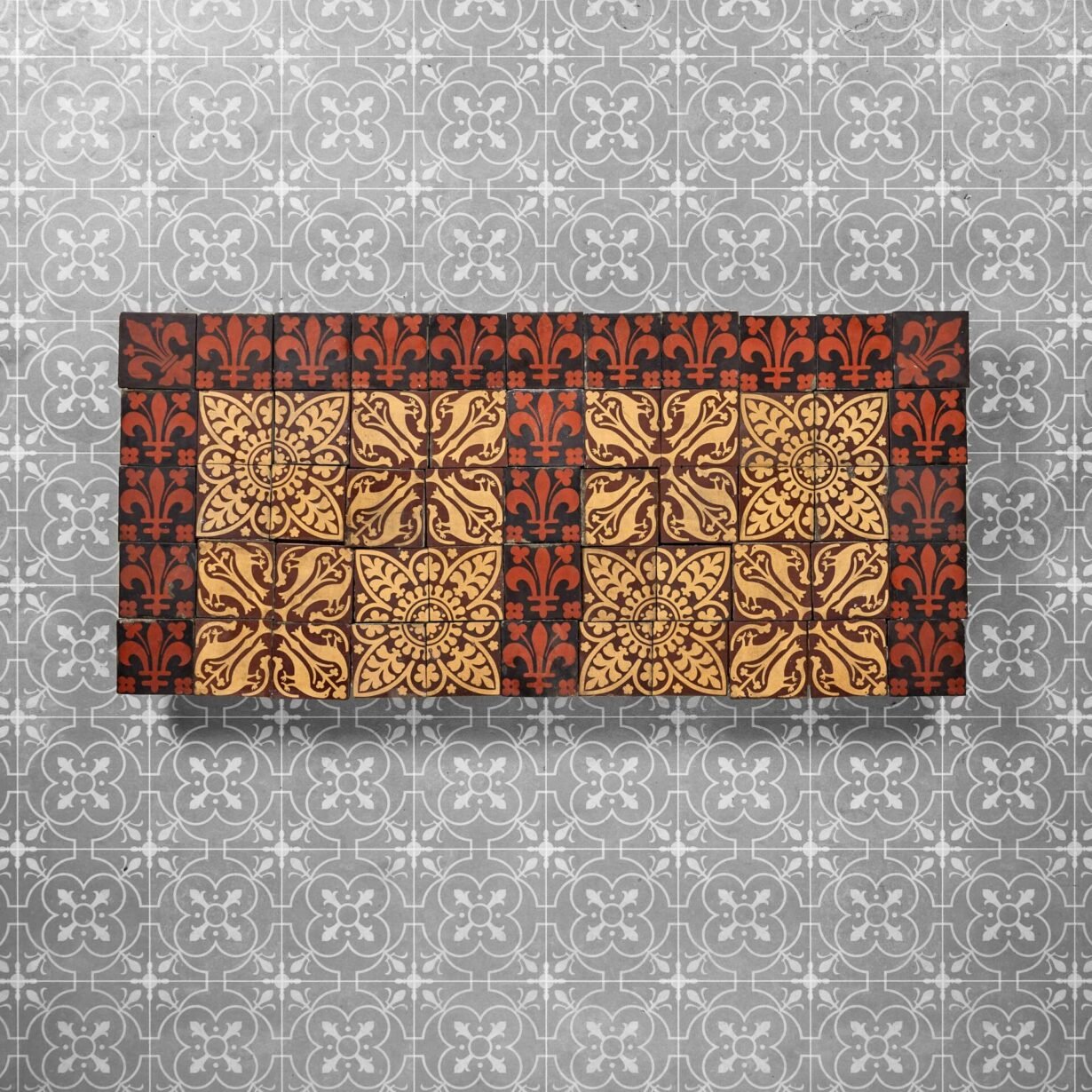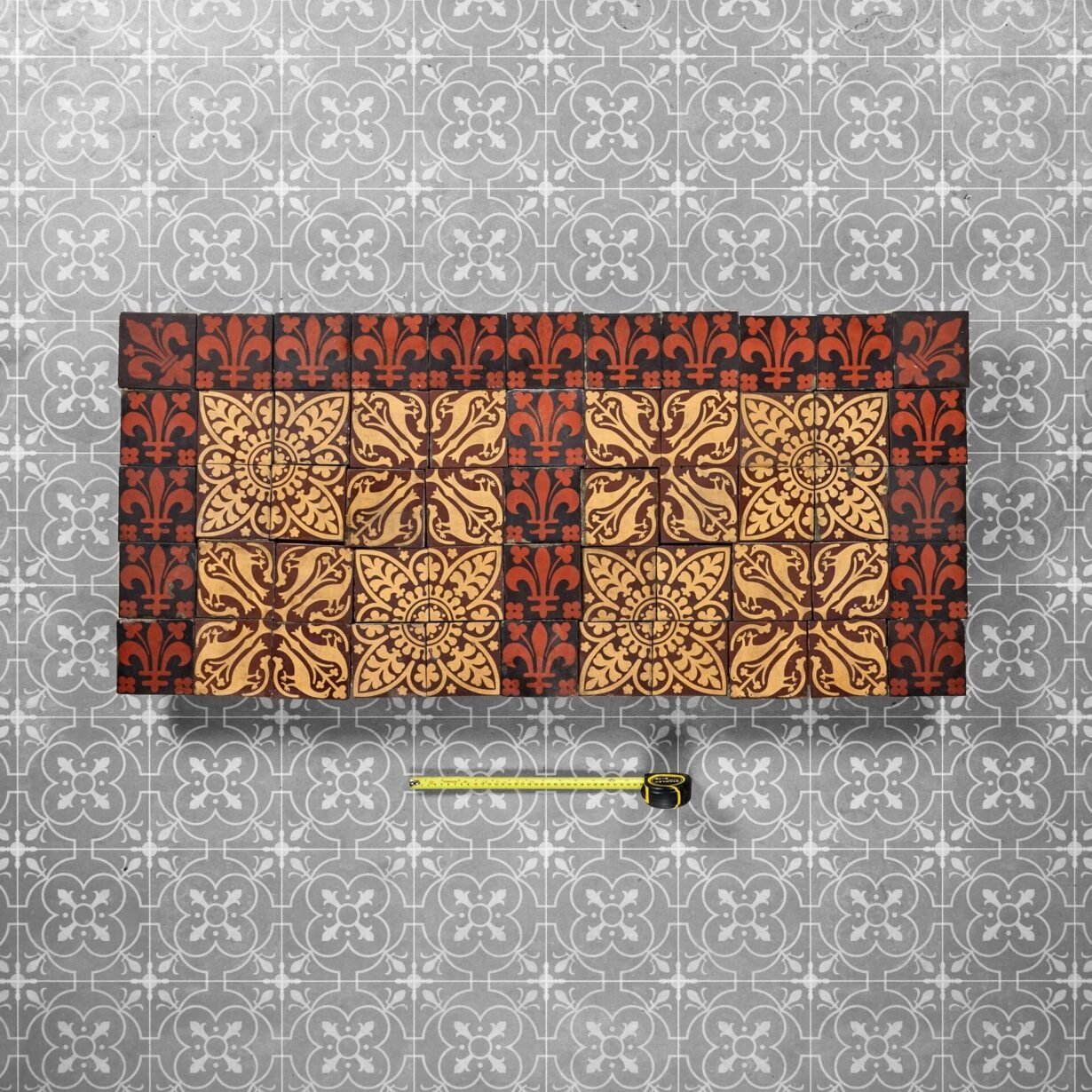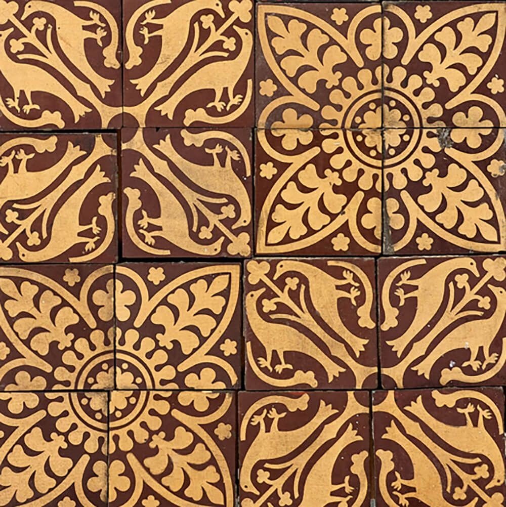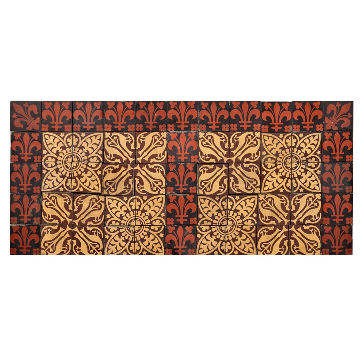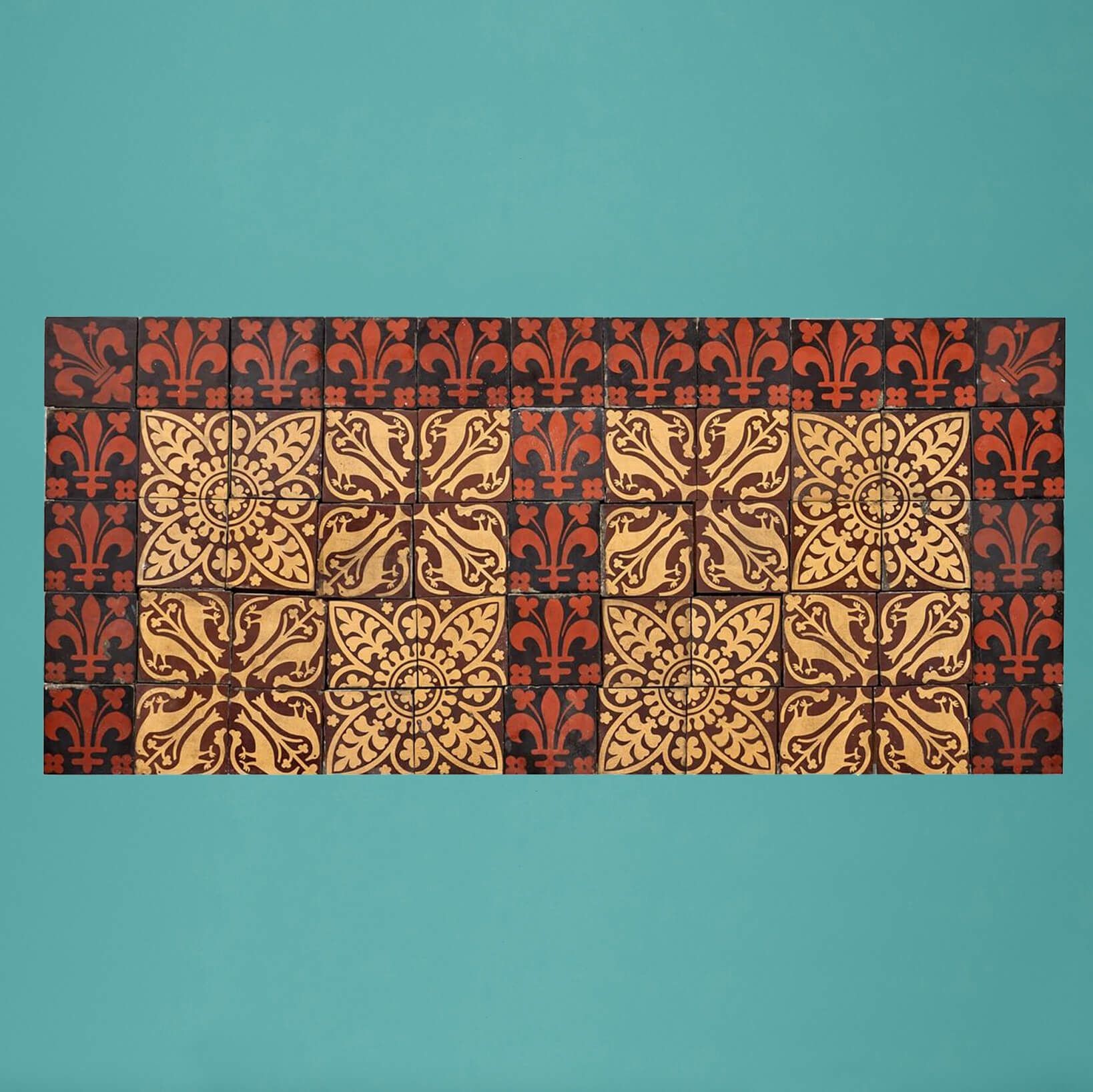 The set comprises of various tile designs comprised of a black and red fleur de lys border centring around eight sets of 4-tile designs with similar fleur de lys details and stylised birds. Dating from the 19th century, these reclaimed tiles have been in use for over 100 years and as such have a characterful, timeworn look with scuffs and crazing here and there that only enhances the beauty of these striking patterned tiles.