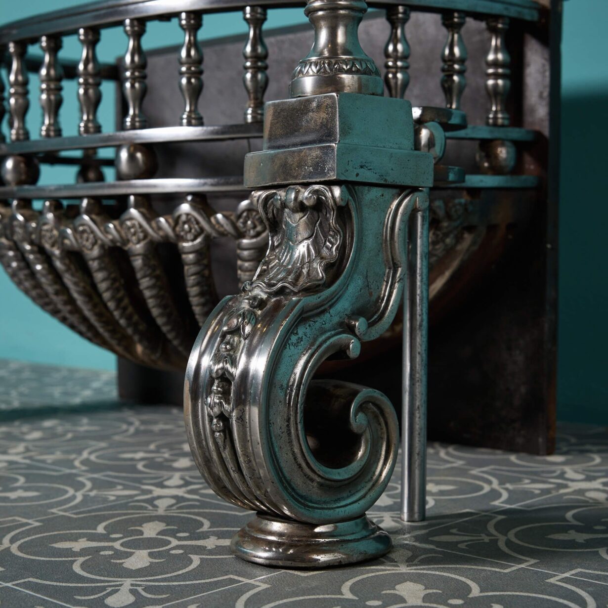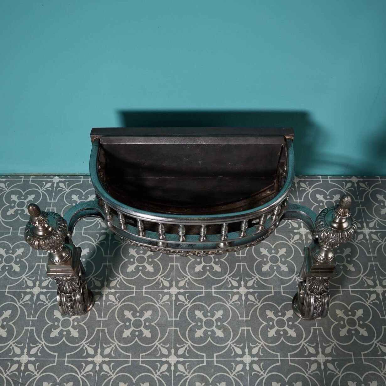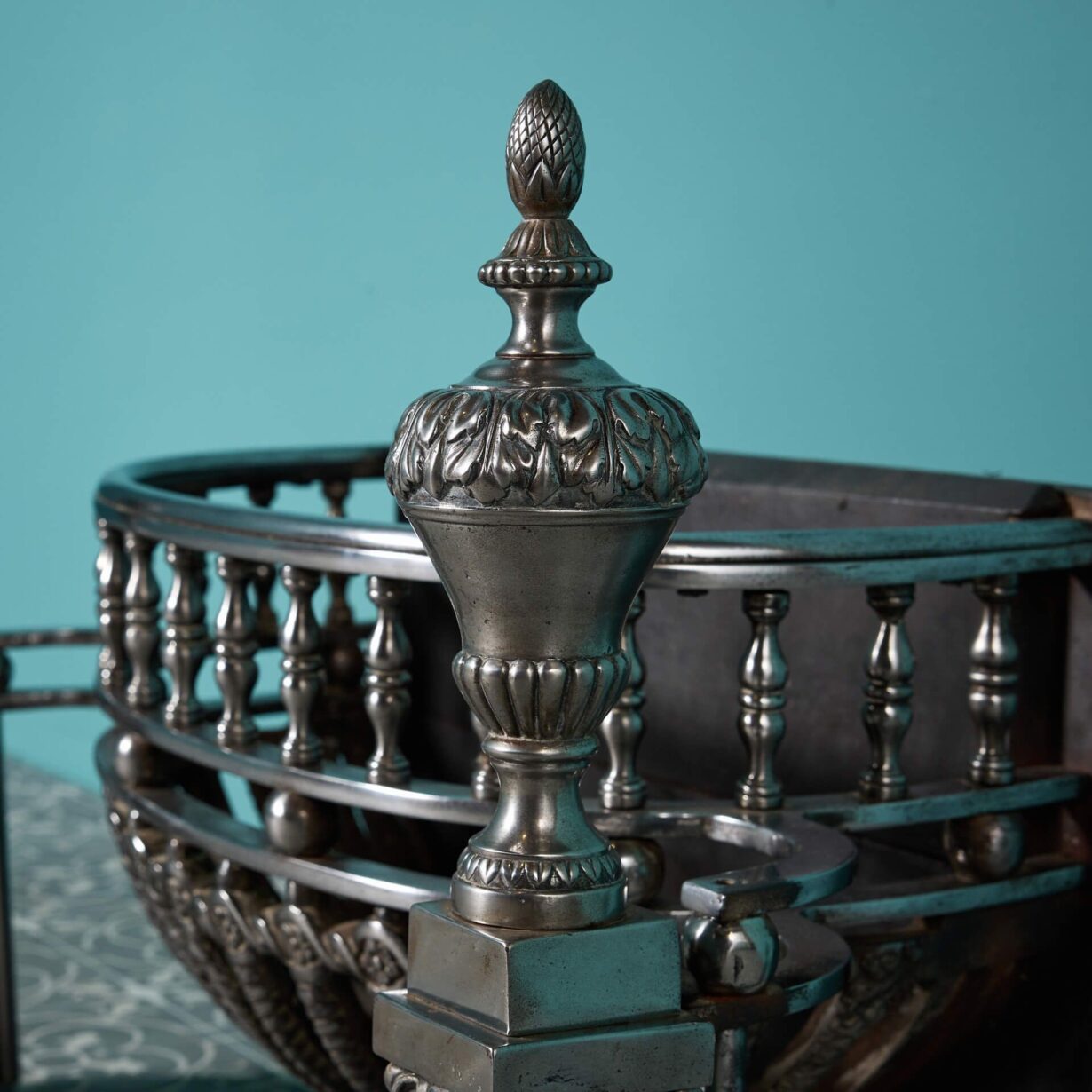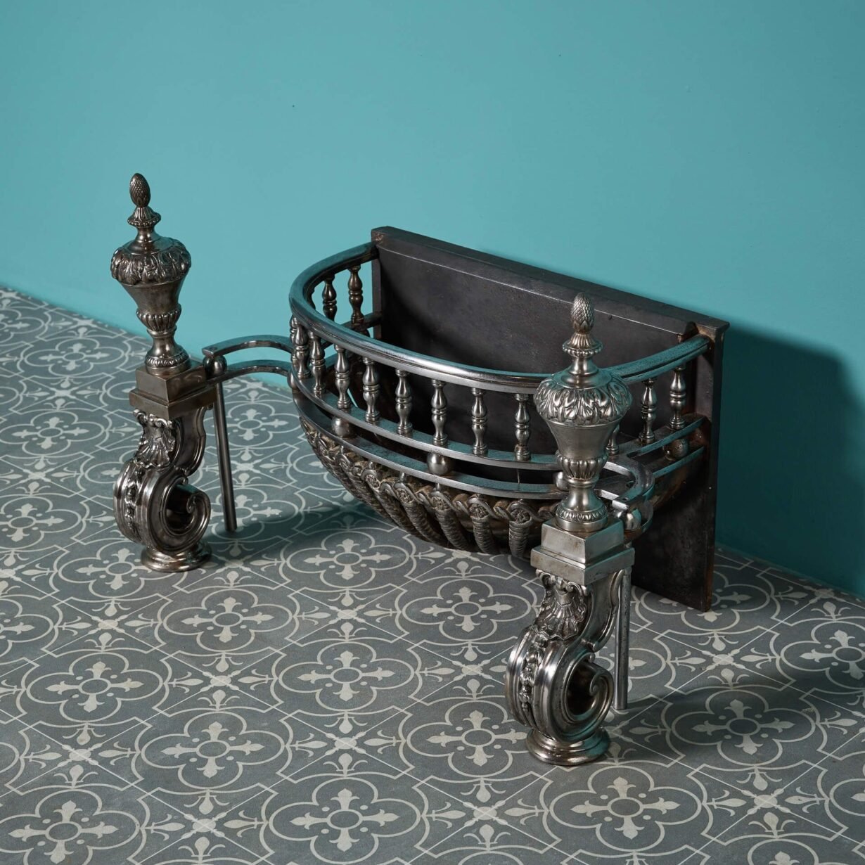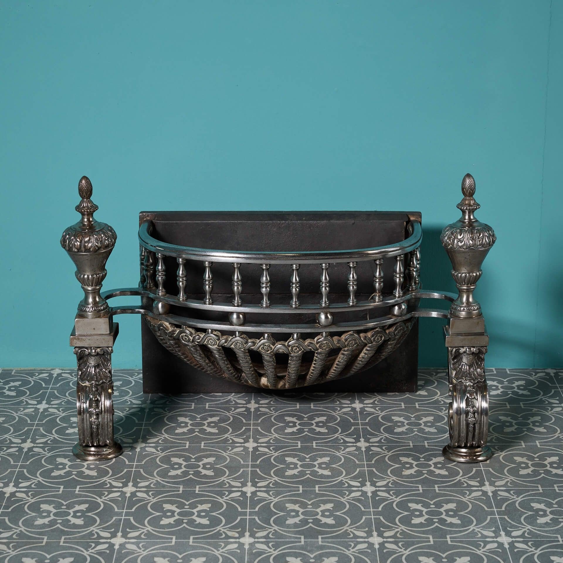 back to topA superb mid-19th century Regency influenced polished steel and cast iron fire basket, designed to an earlier 18th century style. This antique fire basket is certain to bring an air of grandeur wherever it is situated, decorated with twisted bars, ornate scroll feet and detachable urn finials.