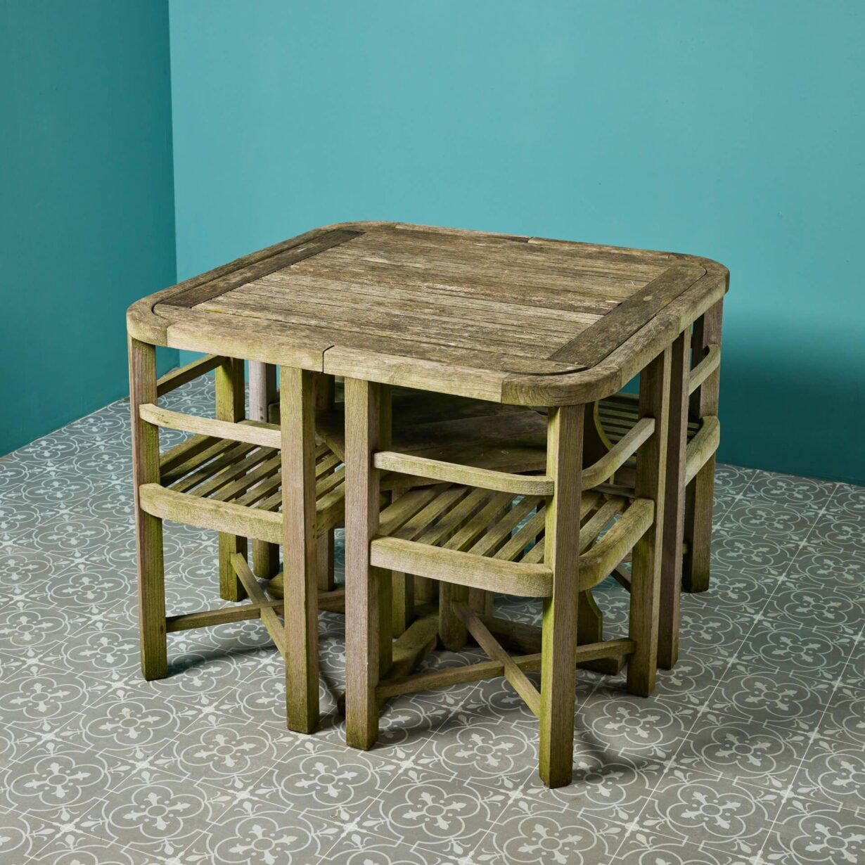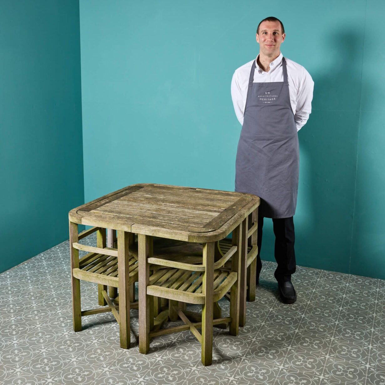back to topA complete 20th century garden dining table and four chairs made from teak taken from World War II ship, S. S. Begum. Made by the Hughes Bolckow Shipbreaking Company of Blyth, this functional teak garden dining set is innovatively designed, the four chairs tucking perfectly beneath the tabletop when not in use. A rare find, this set is in good, complete condition and is steeped in history.