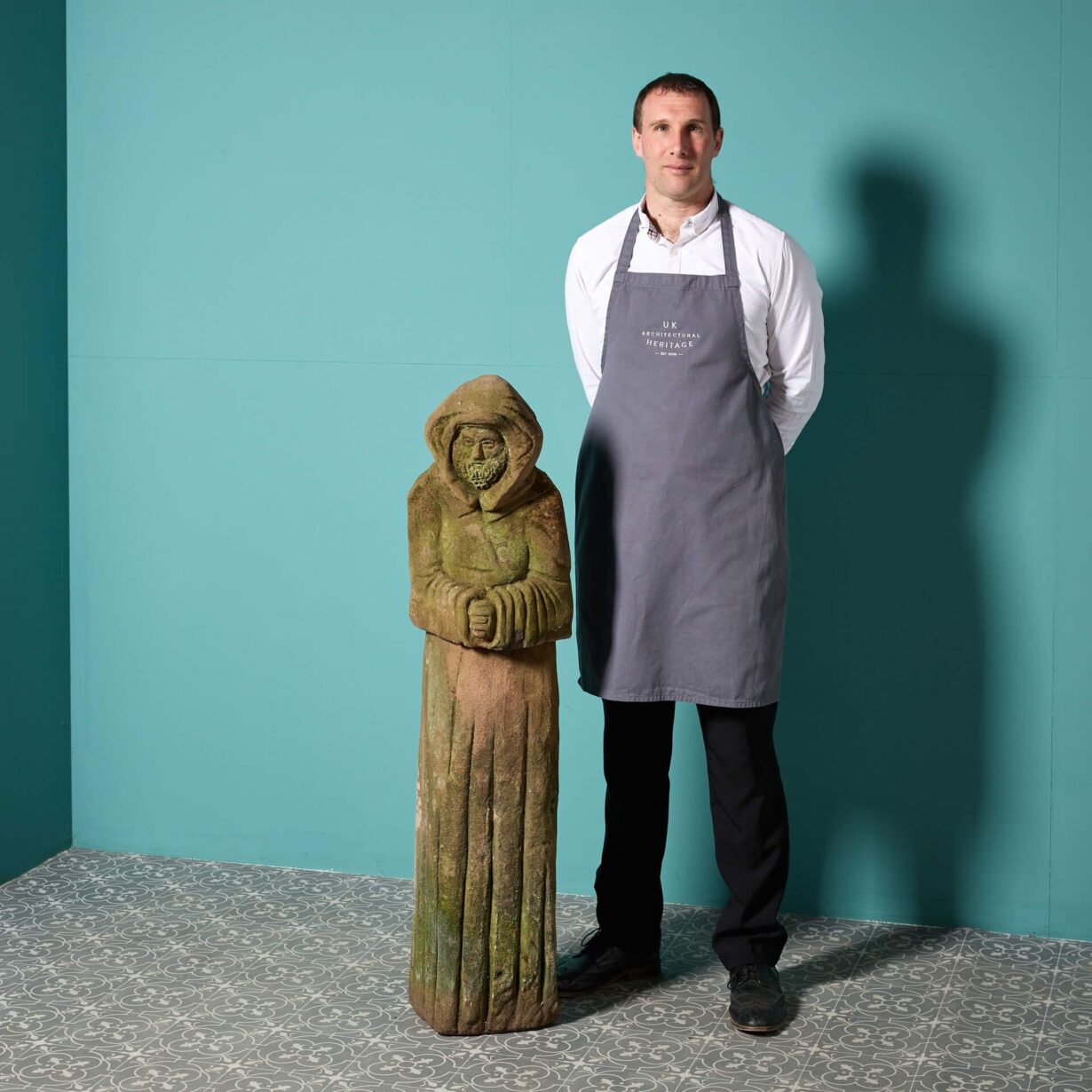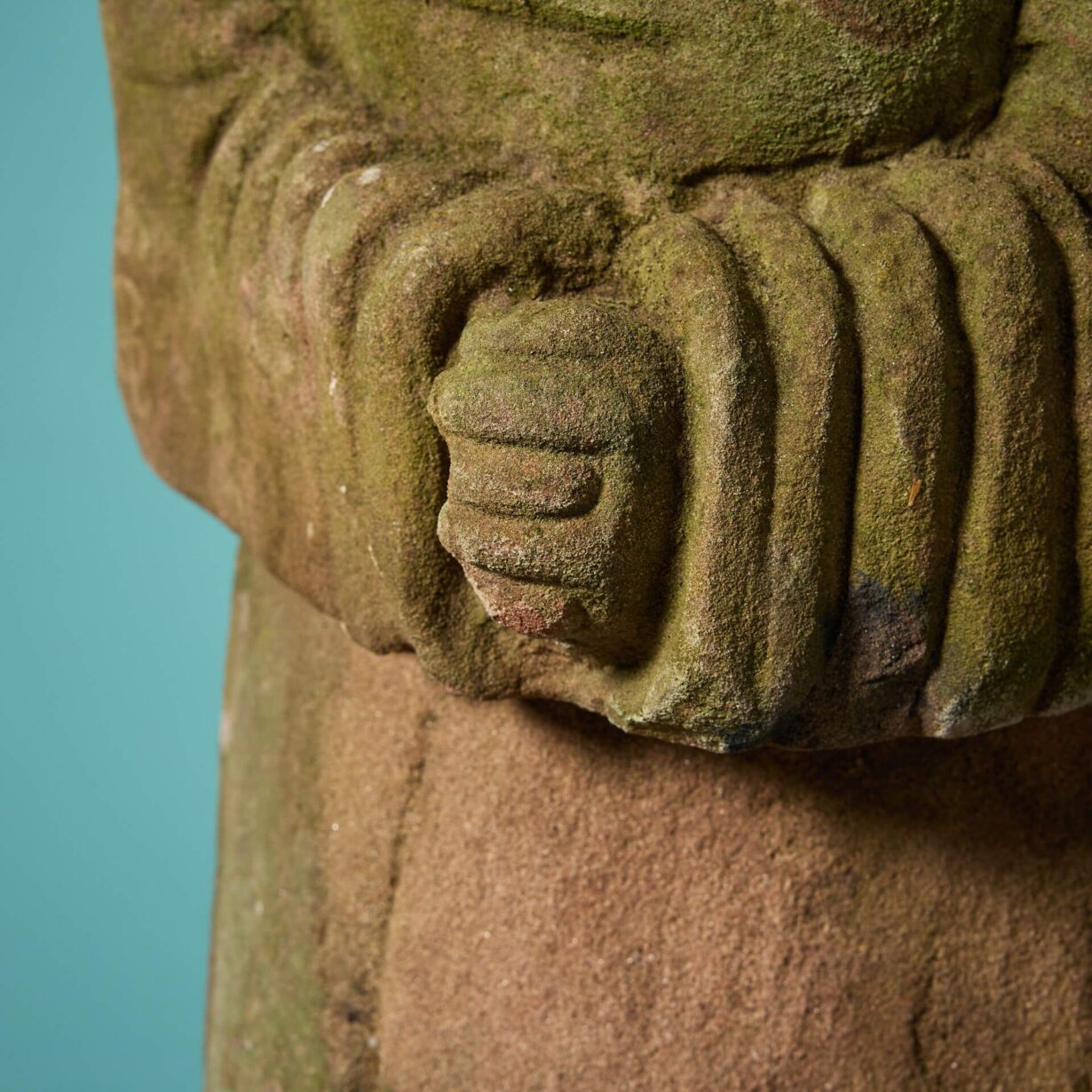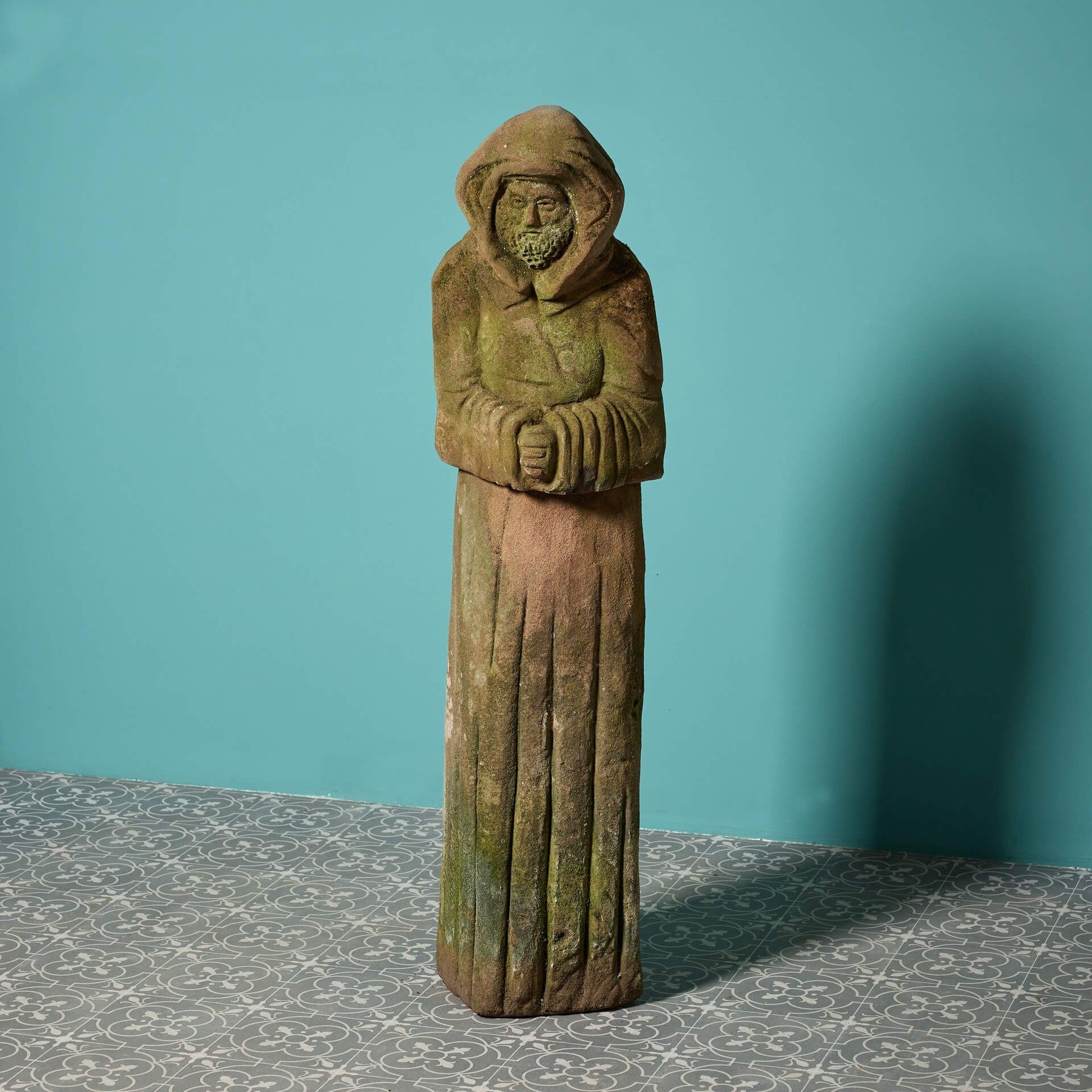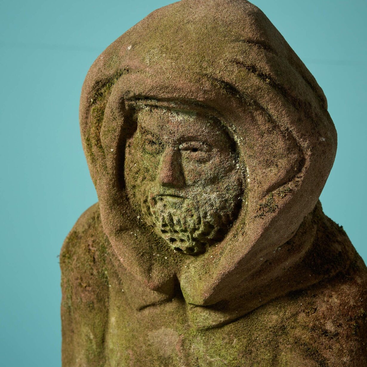 back to topA reclaimed English carved red sandstone sculpture of a cloaked male figure.