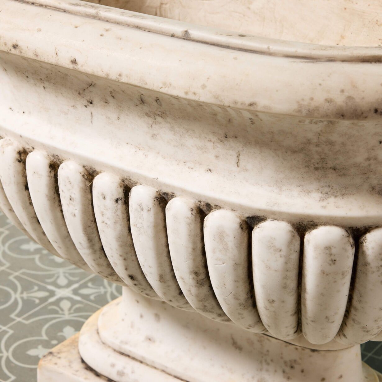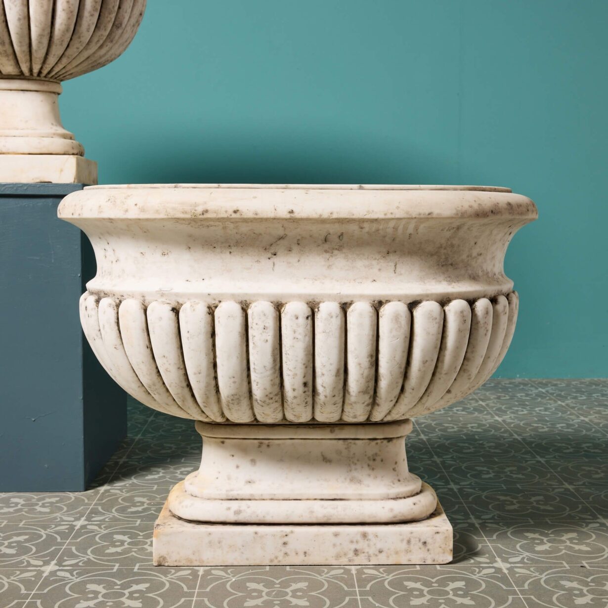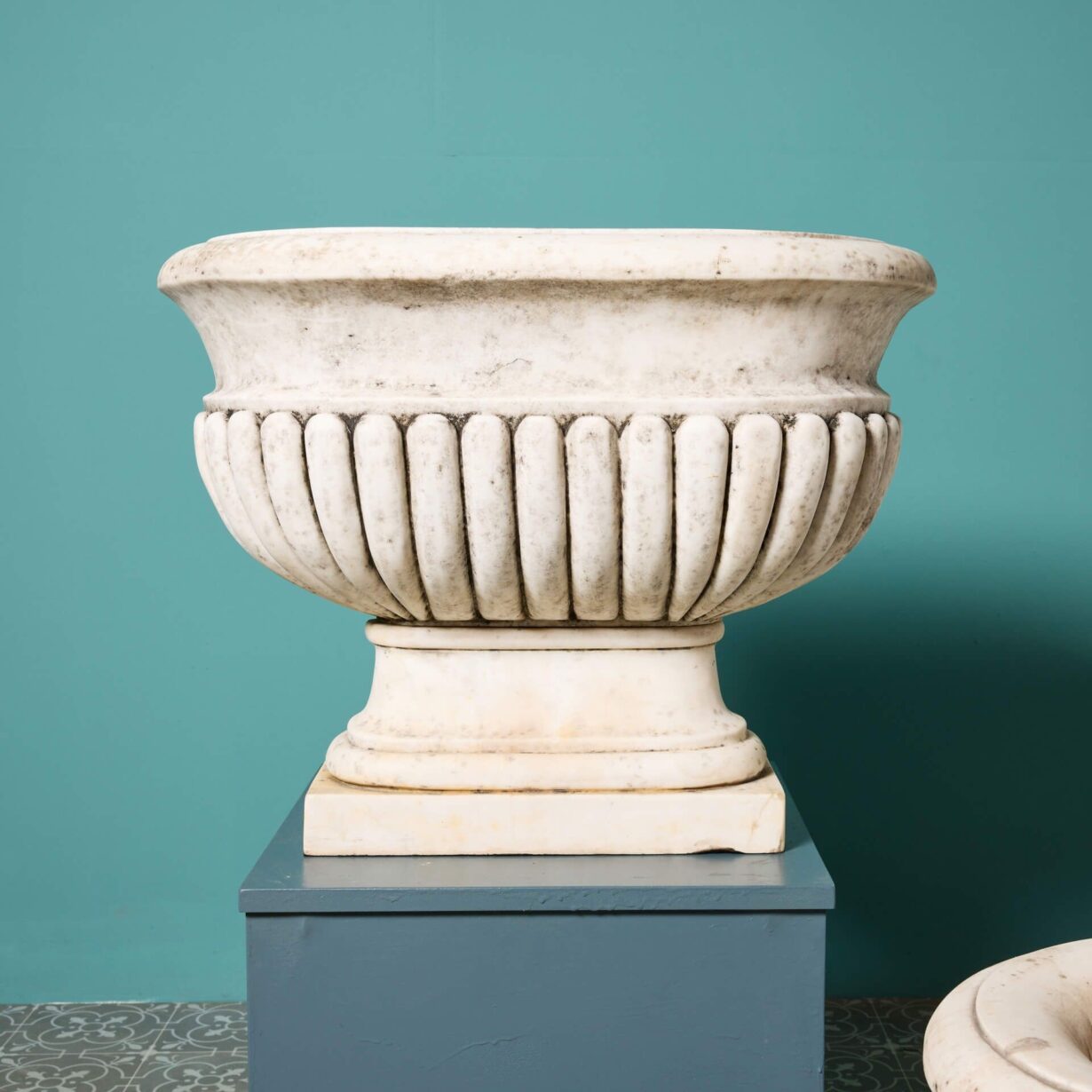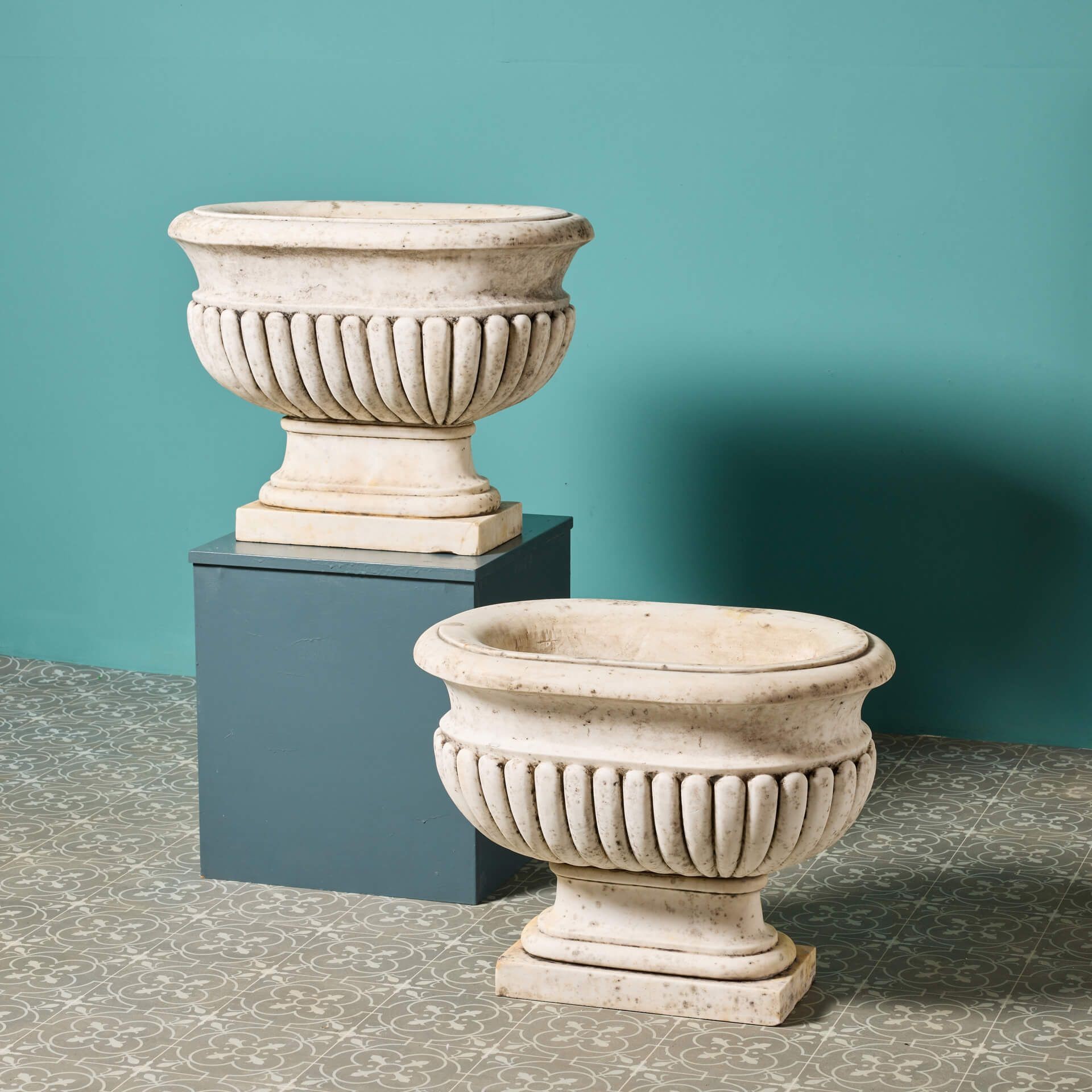back to topAn impressive large-scale set of 2 Italian Carrara marble cisterns planters dating from the early 20th century. With their white colour, elongated form and striking gadrooned detailing, these antique marble cistern planters bring grandeur to any garden. They look equally beautiful planted with flowers as part of a townhouse garden scheme or styled alone as statuary urns either side of an entrance doorway.
