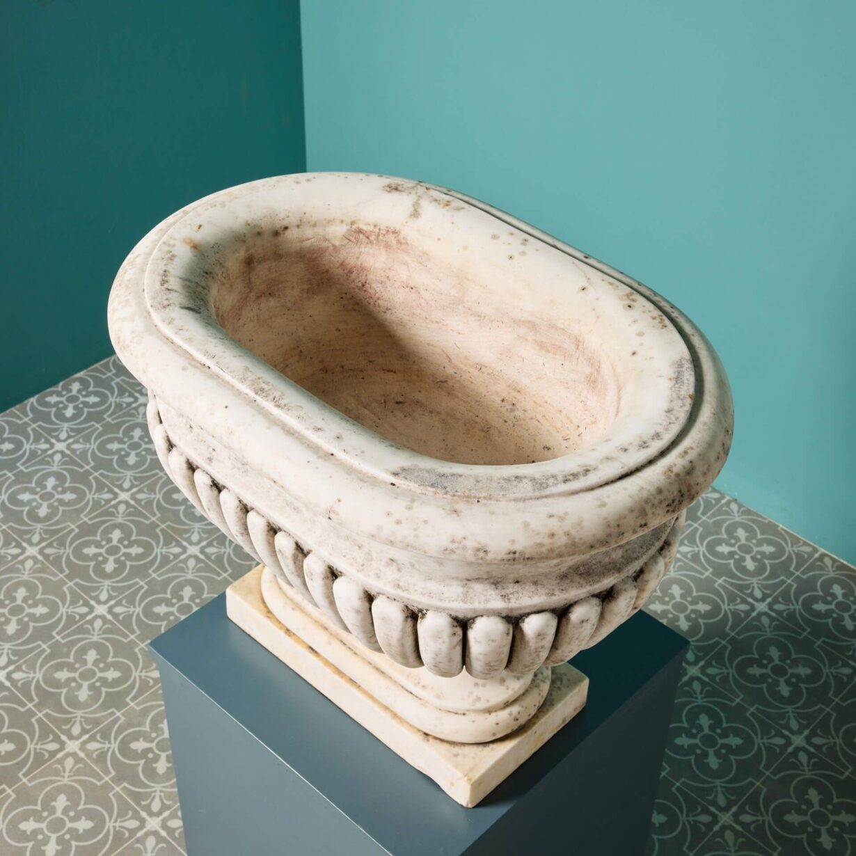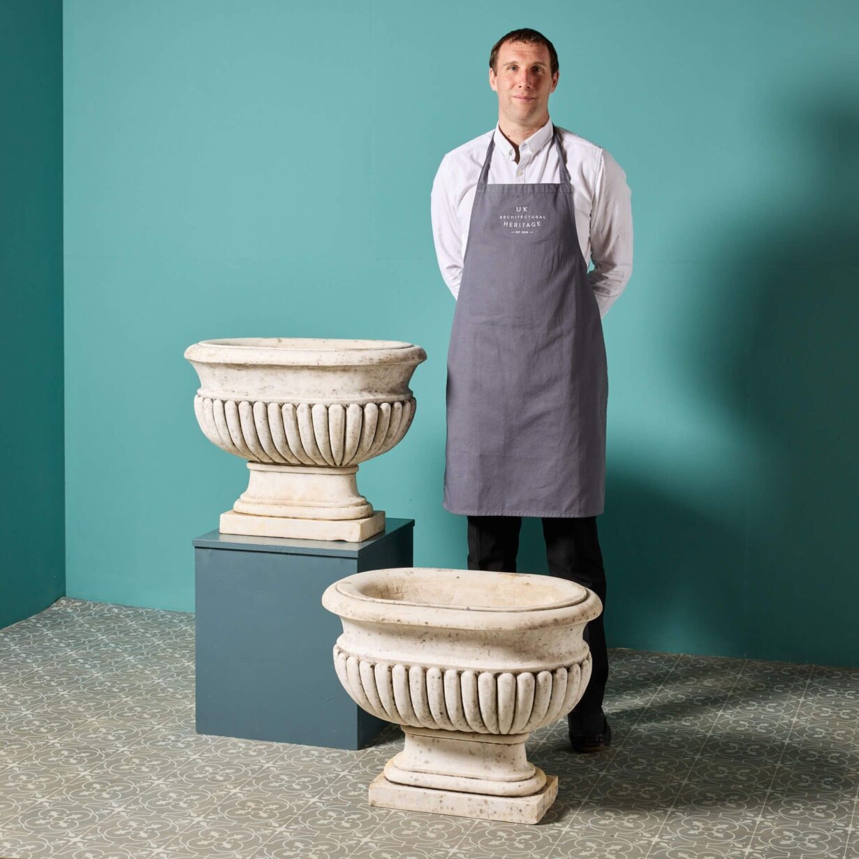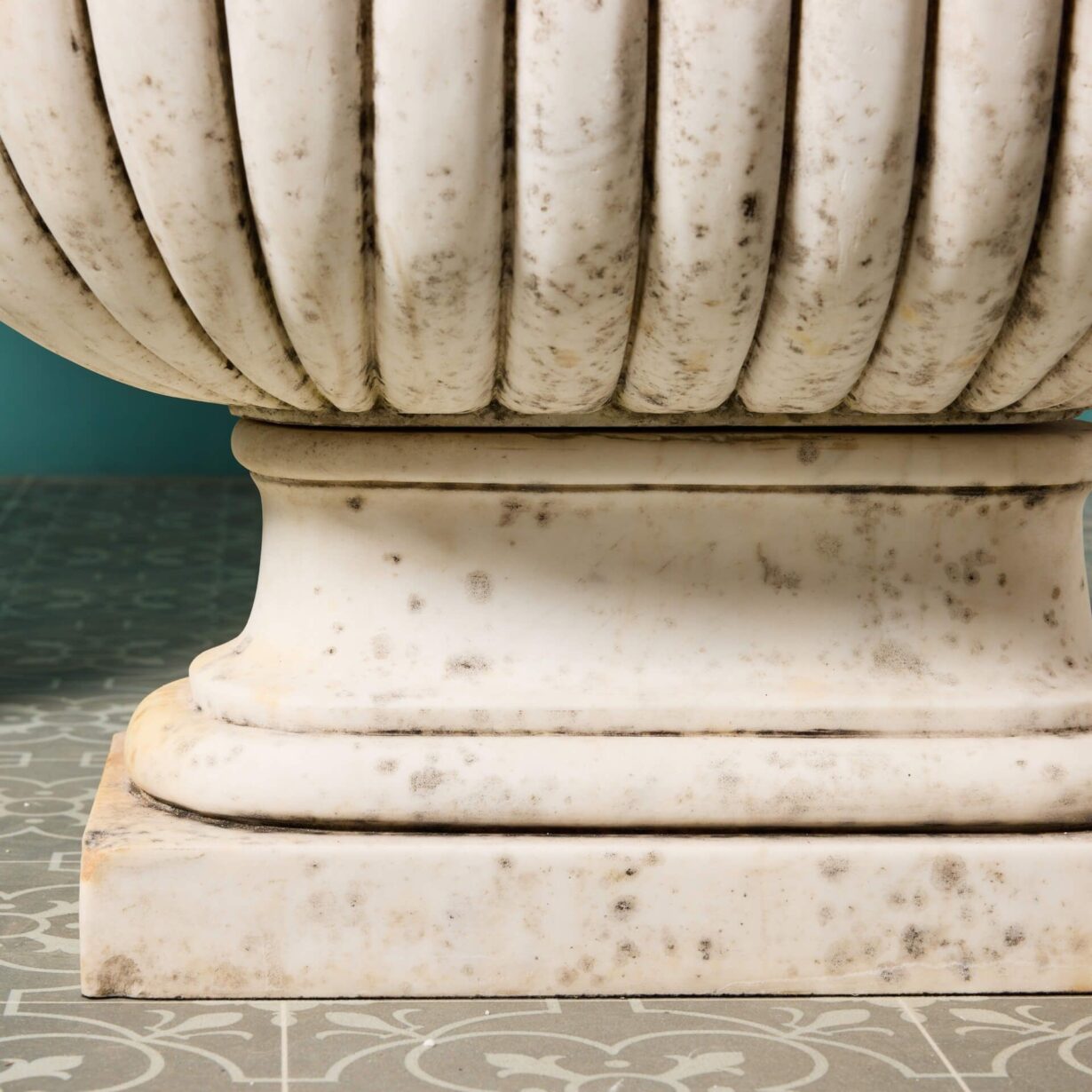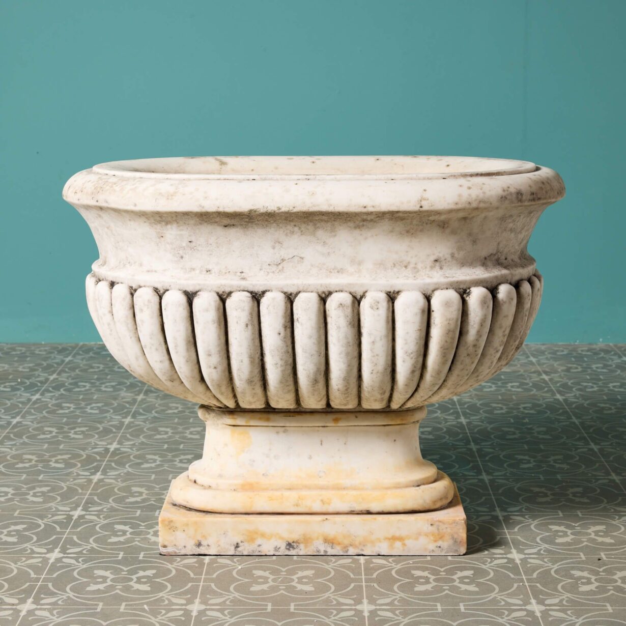 back to topAn impressive large-scale set of 2 Italian Carrara marble cisterns planters dating from the early 20th century. With their white colour, elongated form and striking gadrooned detailing, these antique marble cistern planters bring grandeur to any garden. They look equally beautiful planted with flowers as part of a townhouse garden scheme or styled alone as statuary urns either side of an entrance doorway.