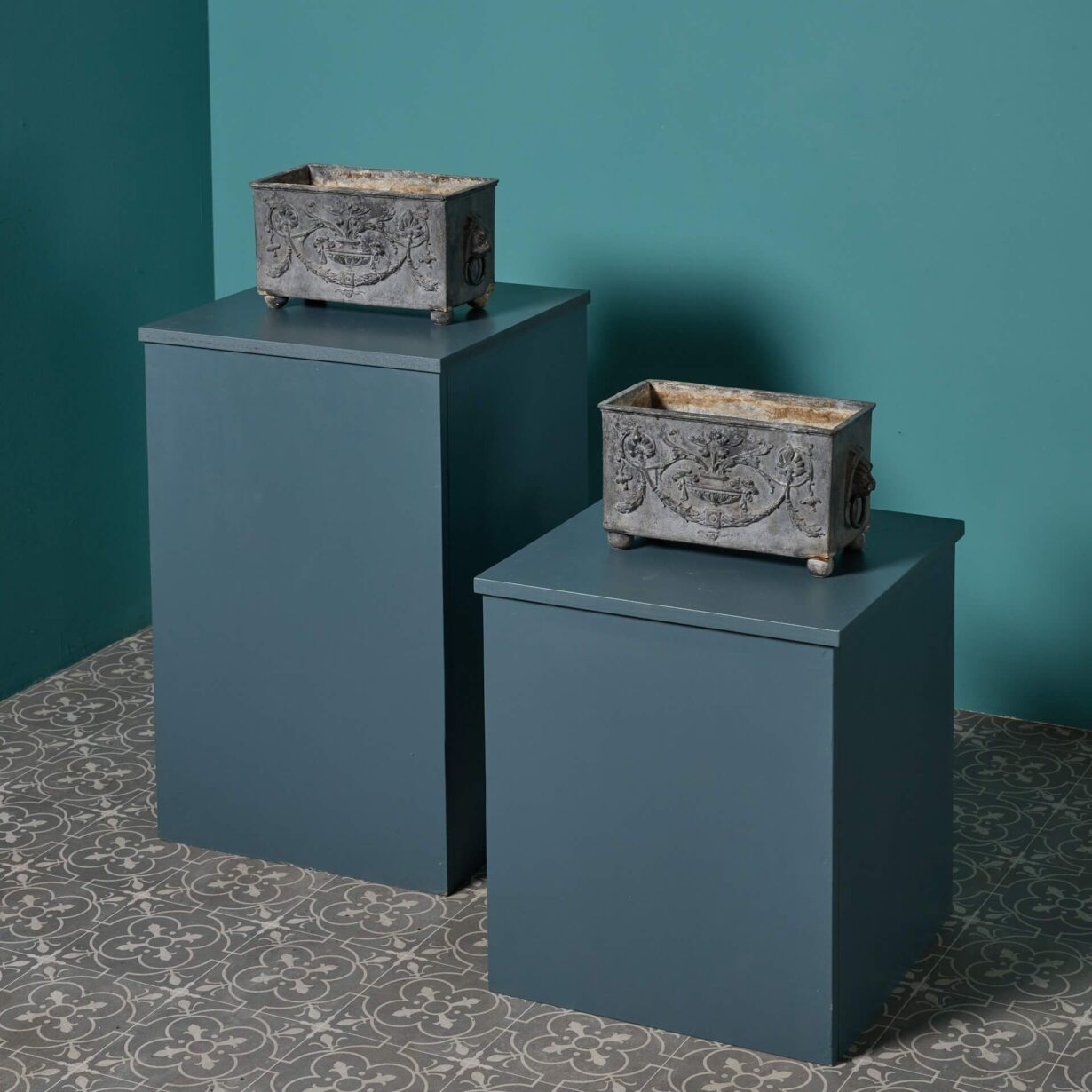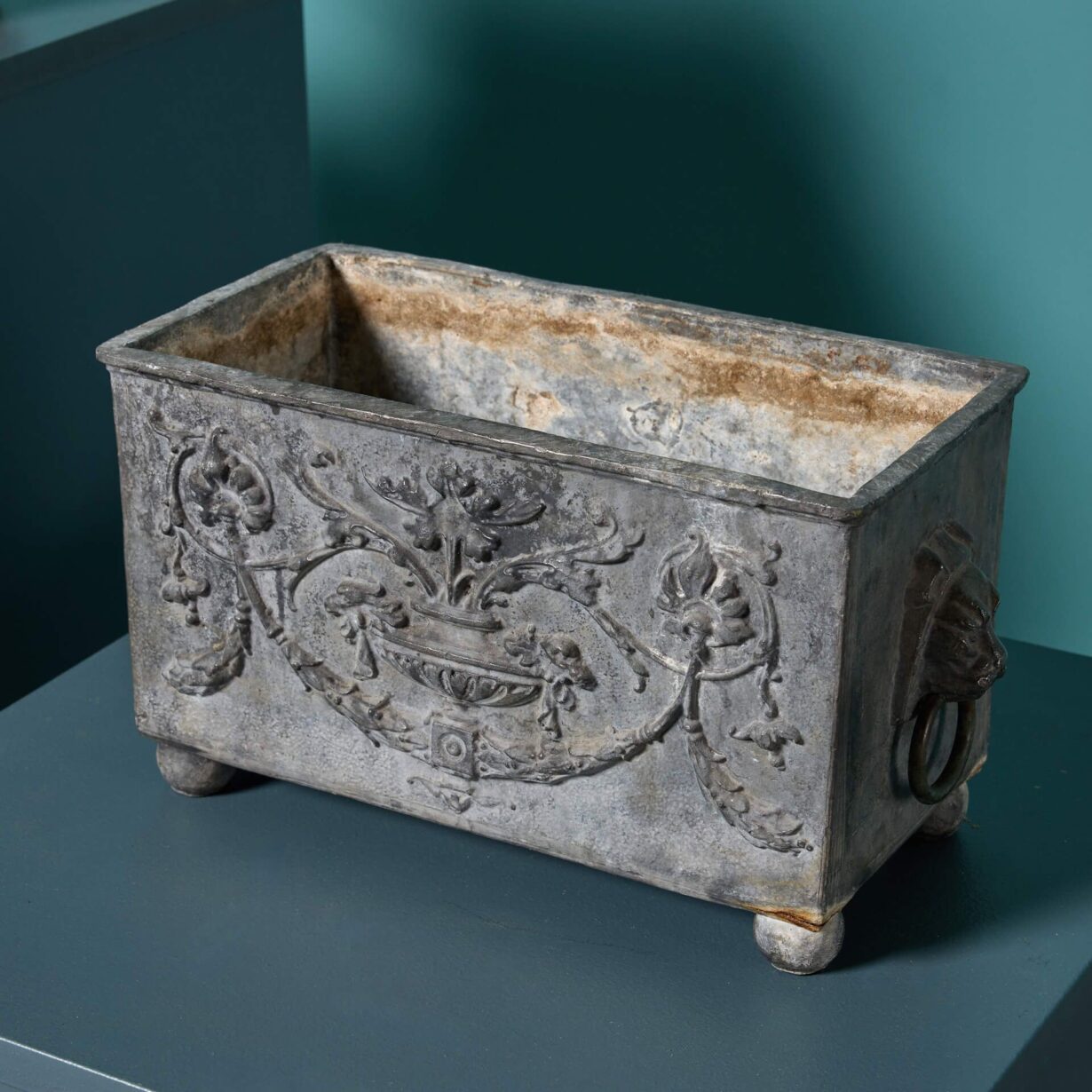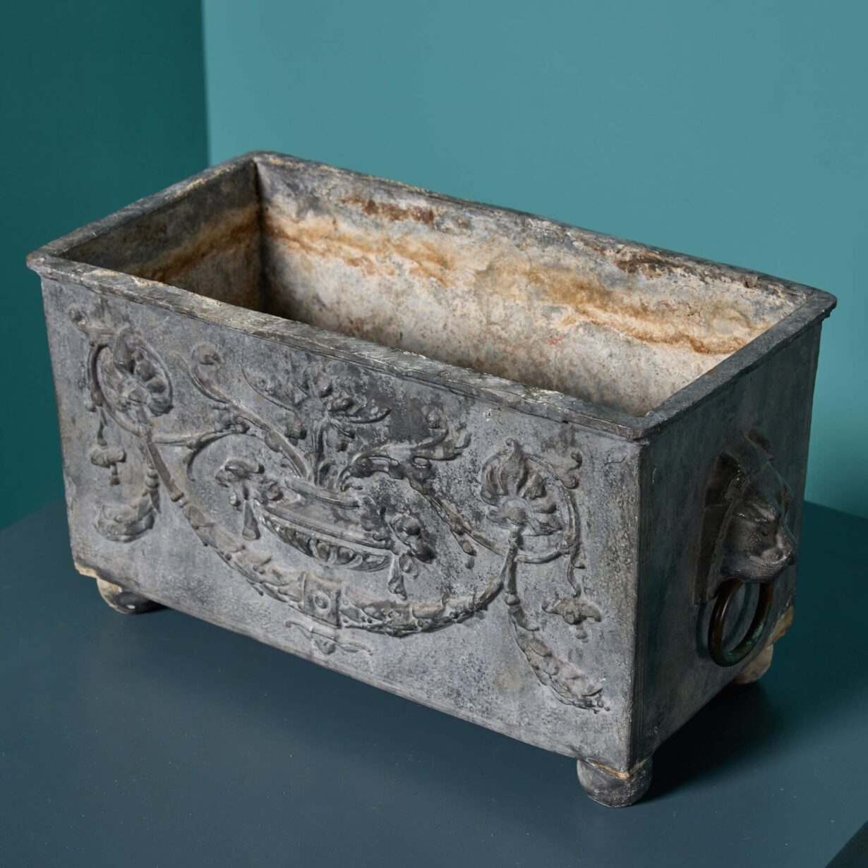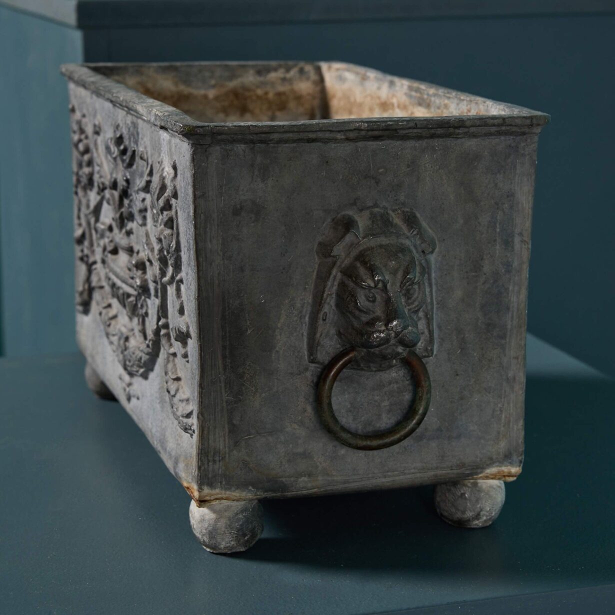 back to topDating from the late 19th century, this set of 2 small antique lead trough planters make a beautiful feature of any garden, period or modern. These petite planters are a matching pair, each standing on short bun feet, the body detailed with neoclassical swag decoration to both sides and lion head handles with brass rings in their mouths.