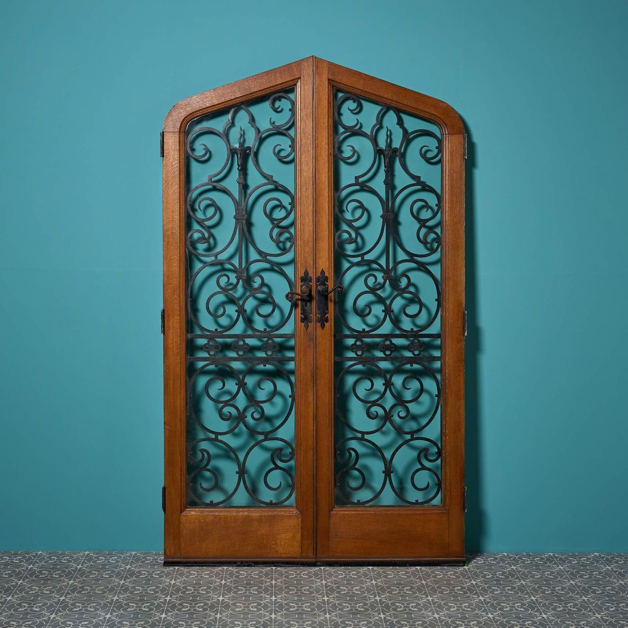 Presented in a mid oak finish, the doors are heavy and substantial with a gentle arched midpoint. They would be equally suited to guard a grand study, or a covered entryway.