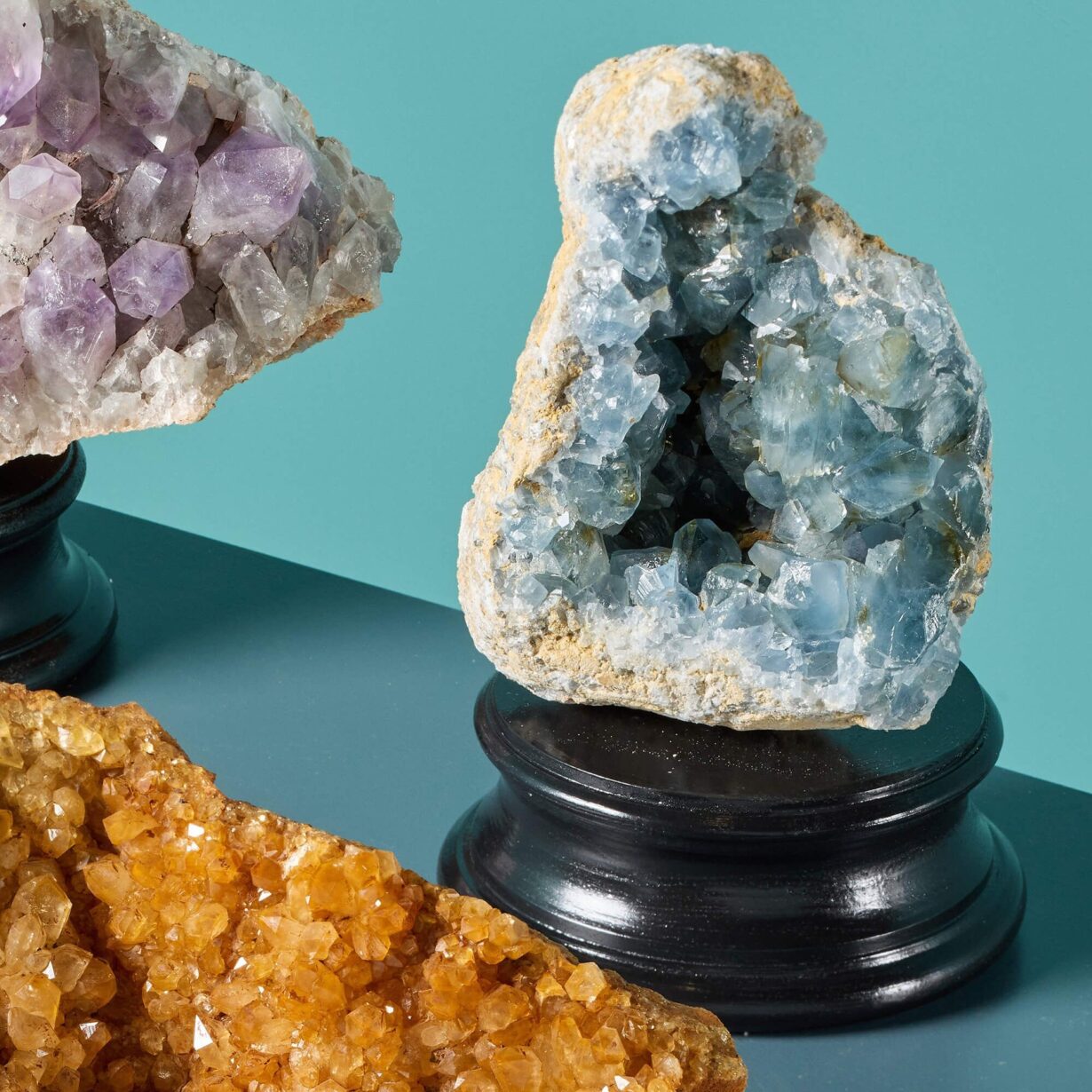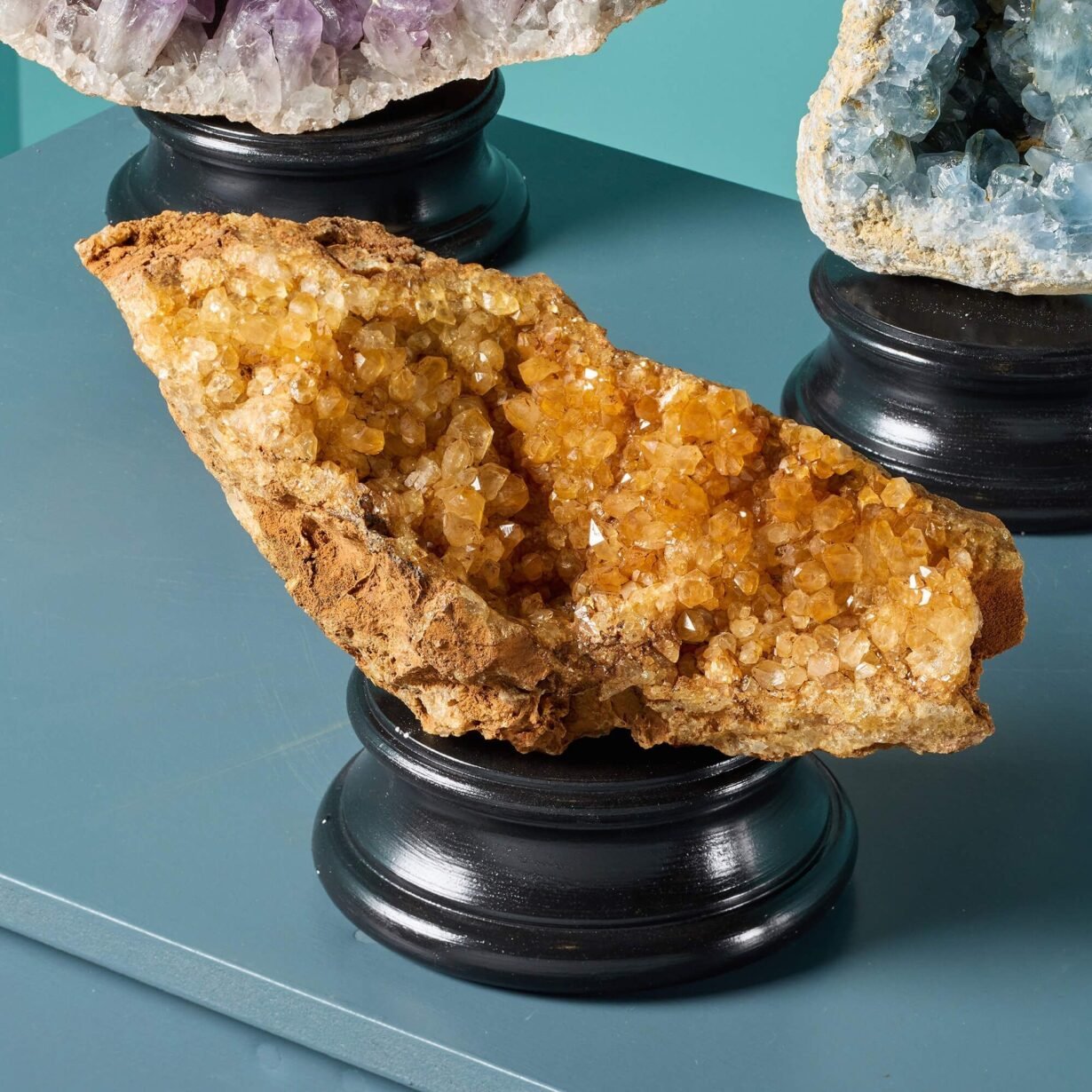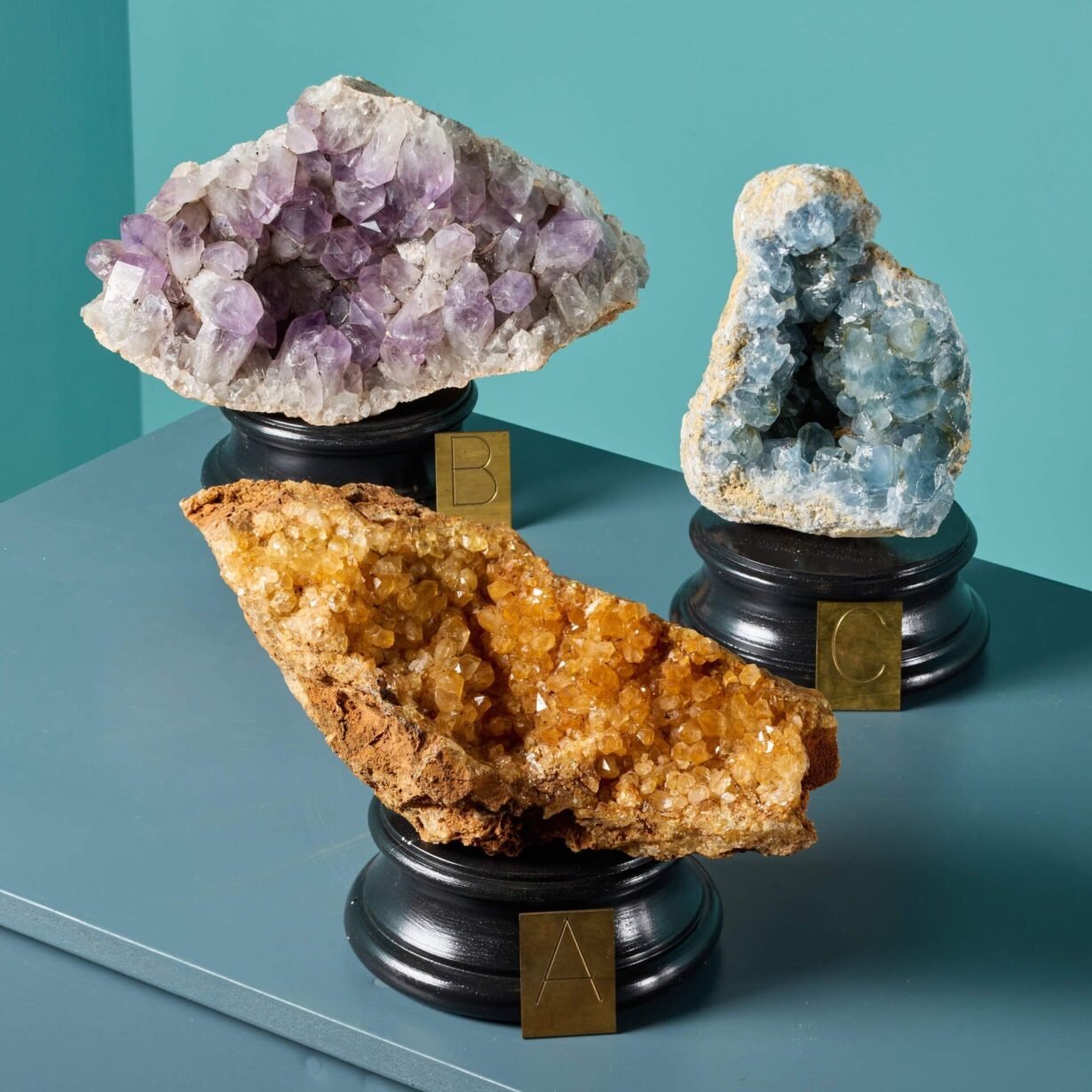 back to topA beautiful collection of three large cabinet mineral specimens including amethyst, blue celestite and limonite quartz presented on our medium painted plaster bases. Together, these specimens form a vibrant collection for display, showcasing beautiful colours and shapes formed by nature over millions of years. More details on the individual specimens below: