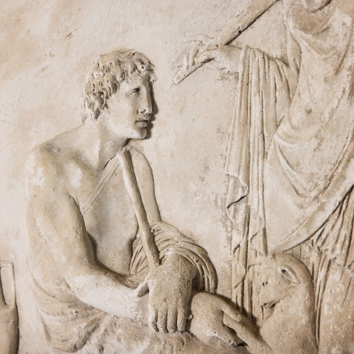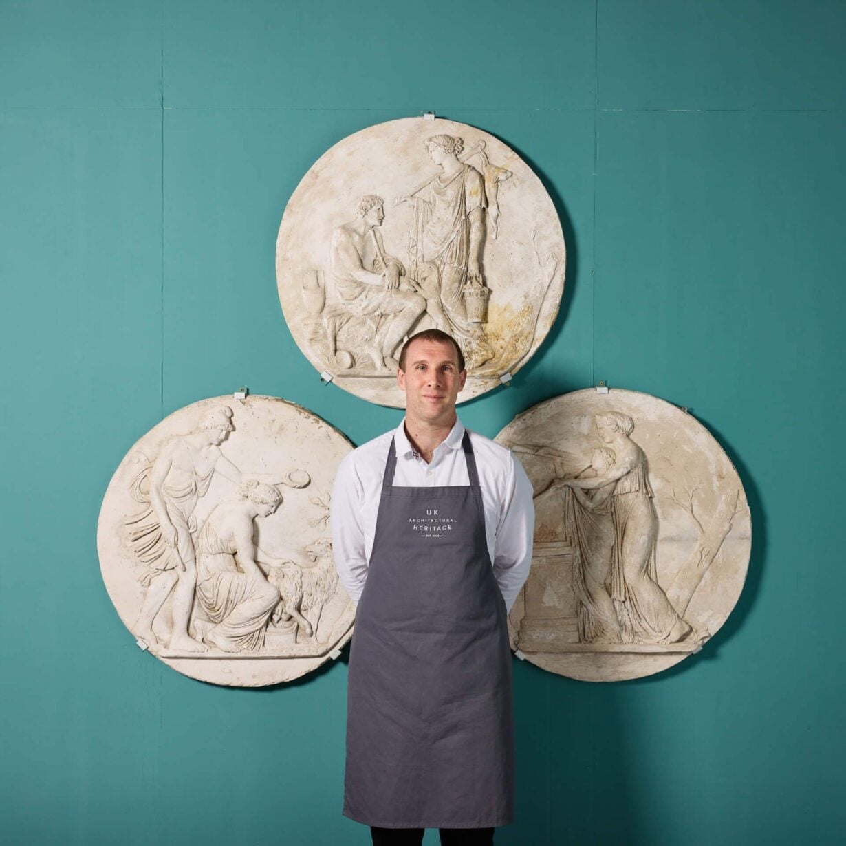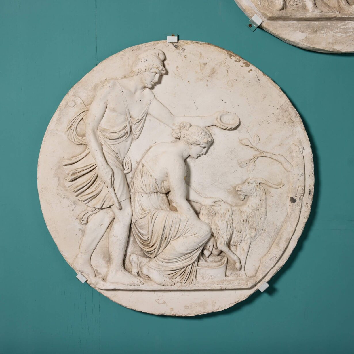 These impressive sculpted wall plaques depict classical, Greek style scenes in relief. These include (left to right): The Goat Amalthea with the Infant Jupiter and a Faun, Living from the Land and The Music Lesson.