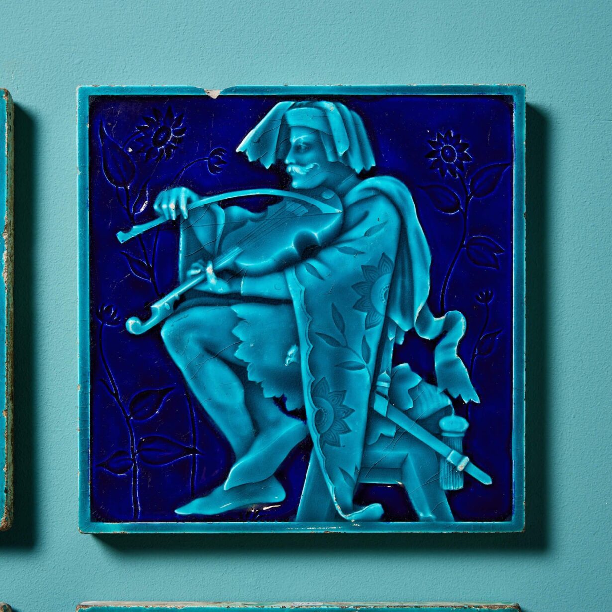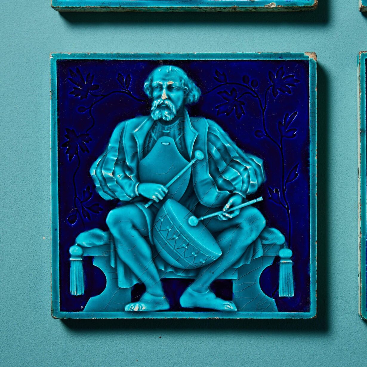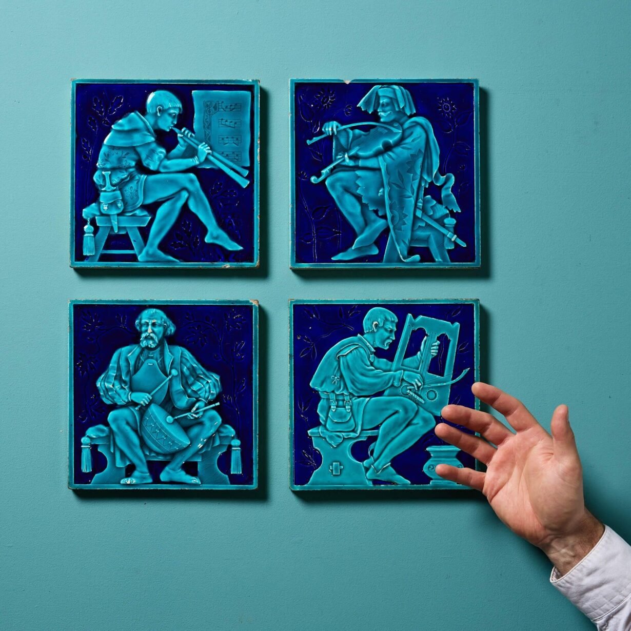 Modelled in relief, each 8-inch tile is decorated with a different musician in medieval dress picked out in turquoise and dark navy blue majolica glaze.