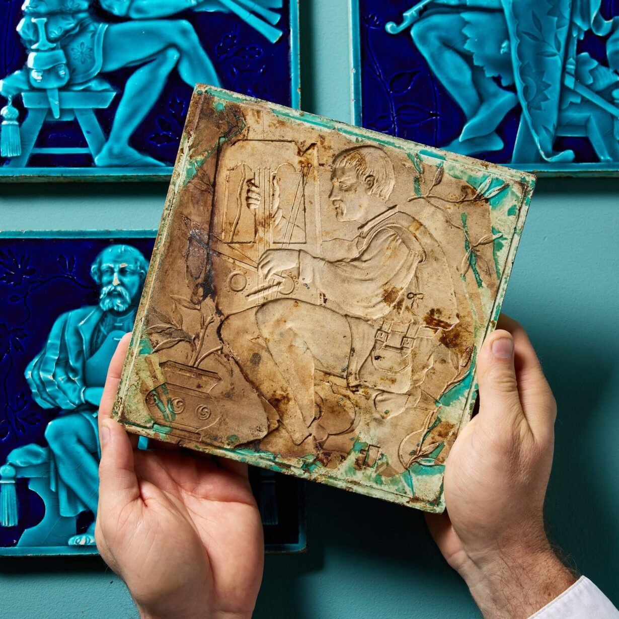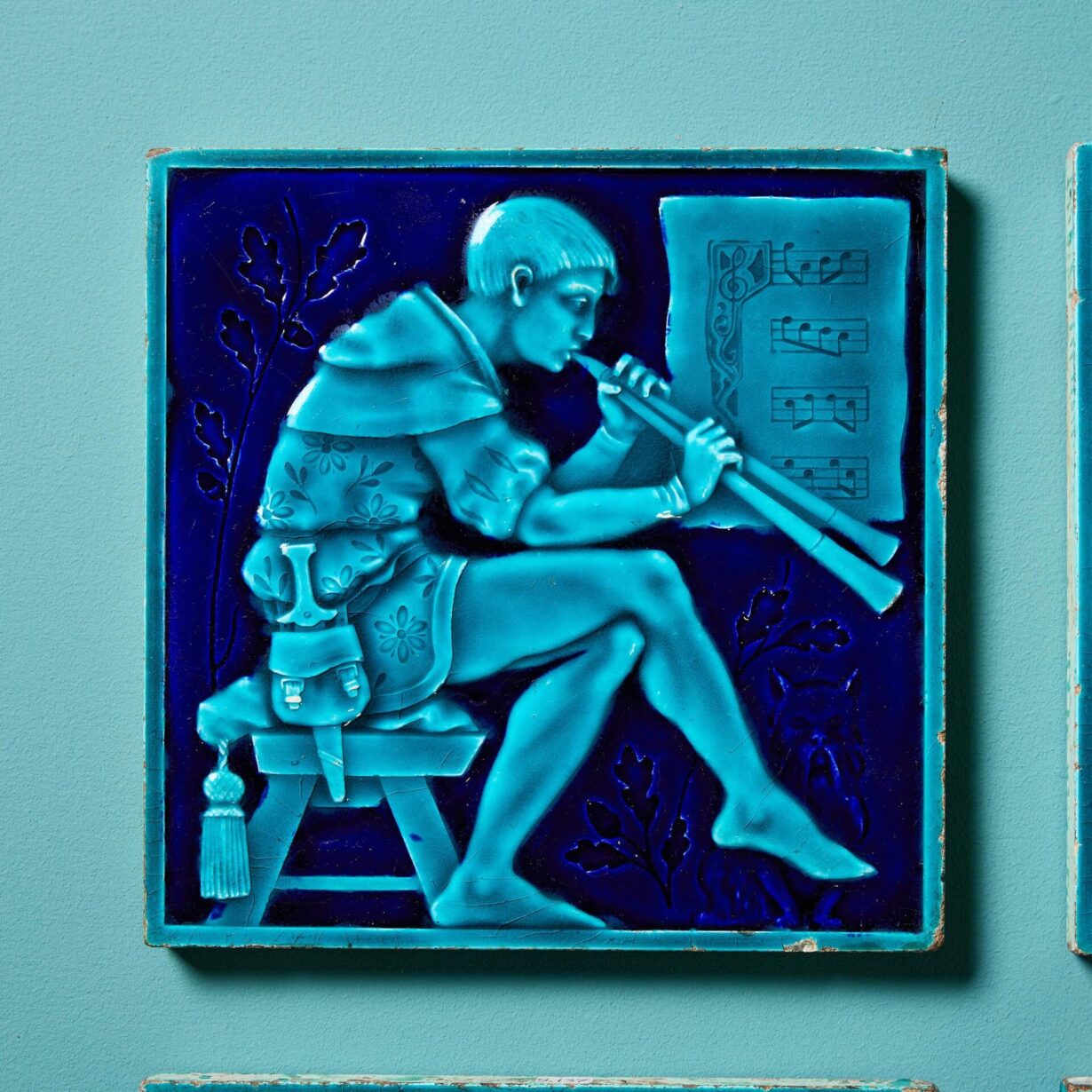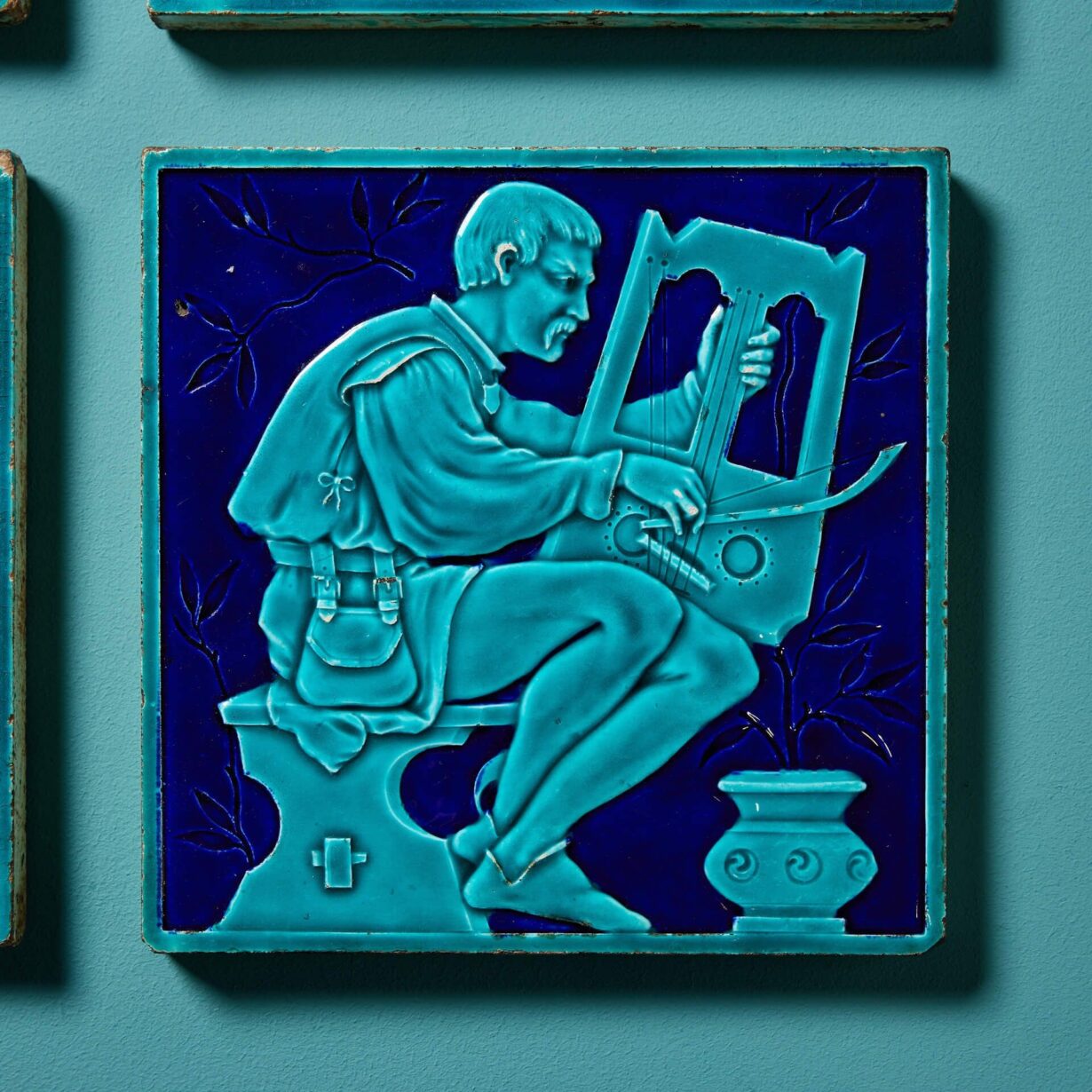 Modelled in relief, each 8-inch tile is decorated with a different musician in medieval dress picked out in turquoise and dark navy blue majolica glaze.